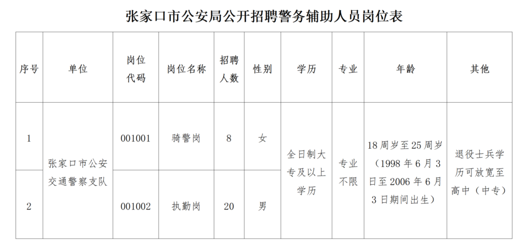 2024张家口市公安局招聘警务辅助人员28名公告 此次招聘辅警共计28名,男性20名,女性8名。年龄在18周岁至25周岁(1998年6月3日至2006年6月3日期间出生),全日制大专及以上学历,退役士兵学历可放宽至高中(中专),报名时须在工作简历中注明服役时间。 报名时间:2024年6月11日9:00至2024年6月13日17:00。