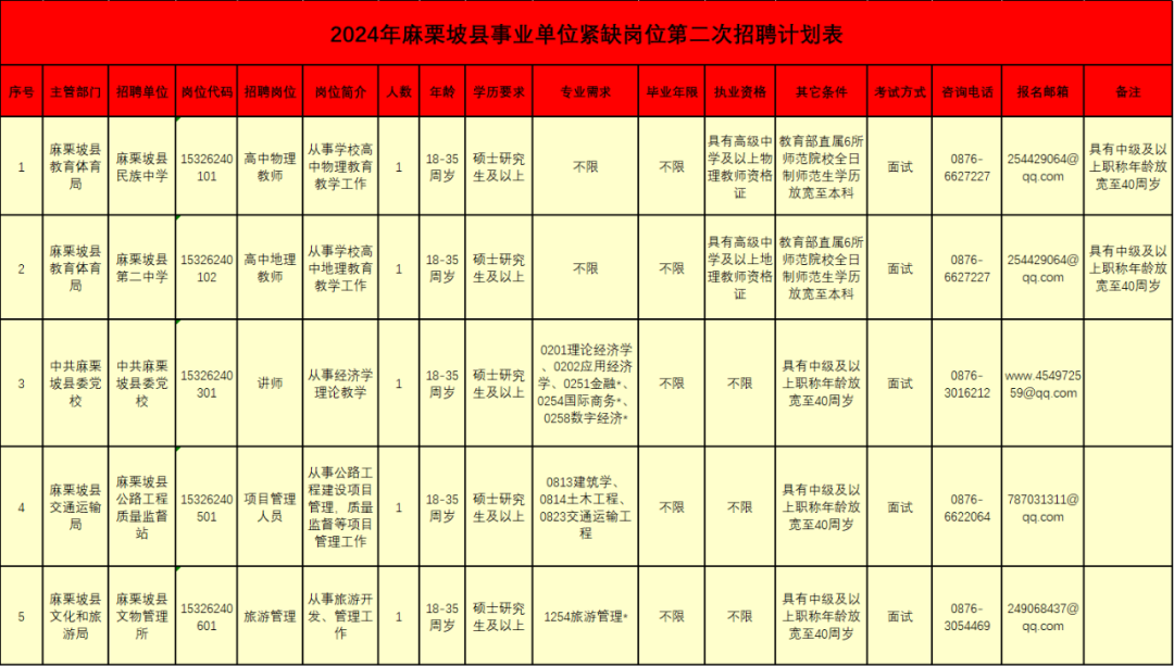 免笔试!正式编制! 文山州麻栗坡县事业单位 2024年第二次招聘公告 一、招聘岗位 2024年麻栗坡县事业单位紧缺岗位第二次计划招聘工作人员5名,分别是:麻栗坡县民族中学高中物理教师1名、麻栗坡县第二中学高中地理教师1名、中共麻栗坡县委党校讲师1名、麻栗坡县公路工程质量监督站项目管理人员1名、麻栗坡县文物管理所旅游管理员1名。具体招聘条件请登录麻栗坡县政务网(https://www.ynmlp.gov.cn/index/wgjyxxgk.html)查看《2024年麻栗坡县事业单位紧缺岗位第二次招聘计划表》。