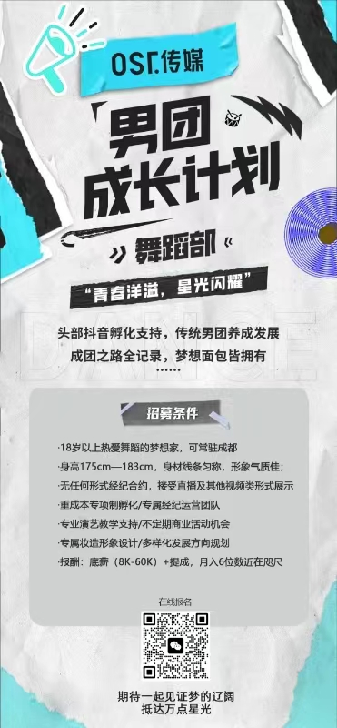 任职资格:热爱舞蹈;身高175cm-185cm,身材线条匀称,形象气质佳;无任何形式经纪合约,接受直播及其他视频类形式展示;有良好的团队合作精神及抗压能力。