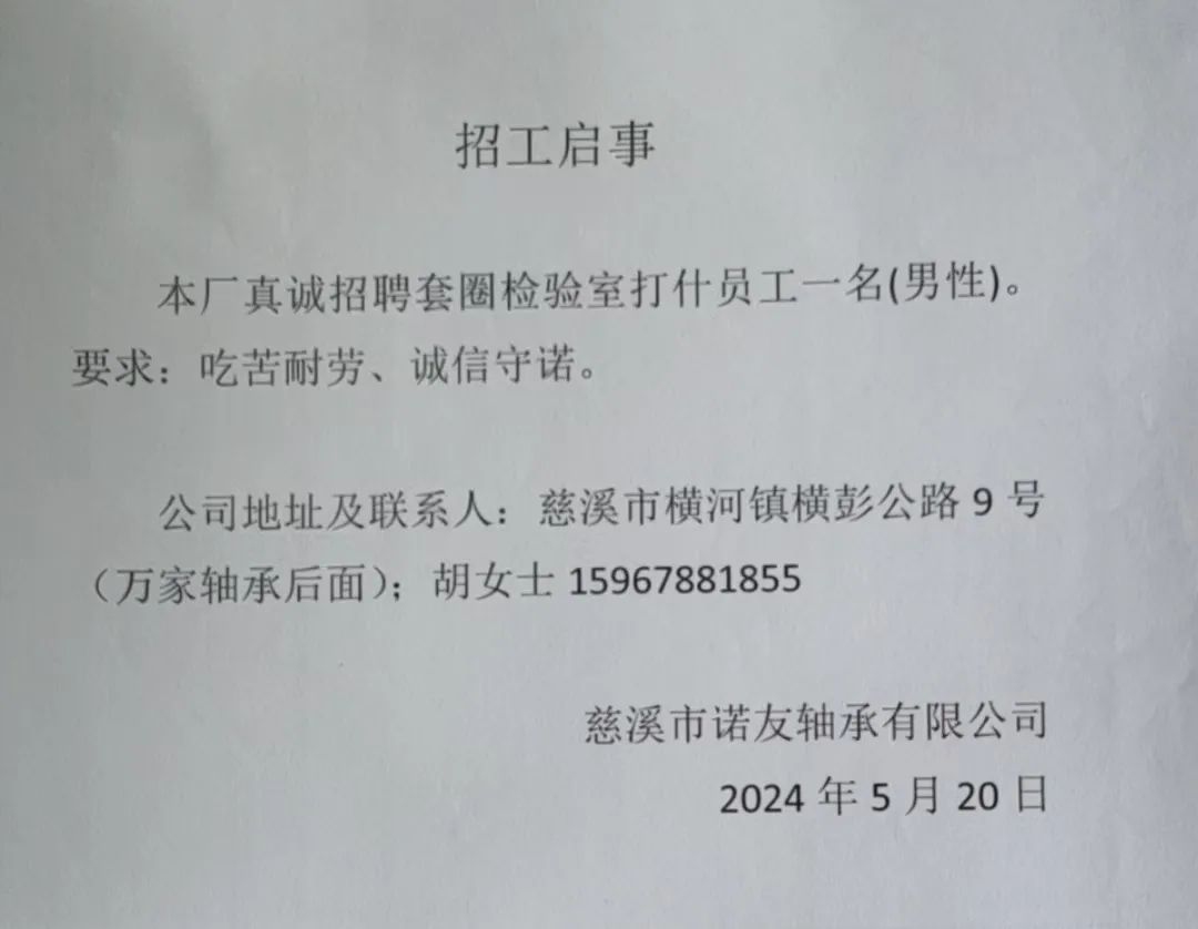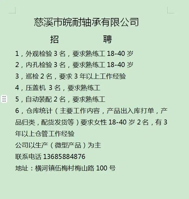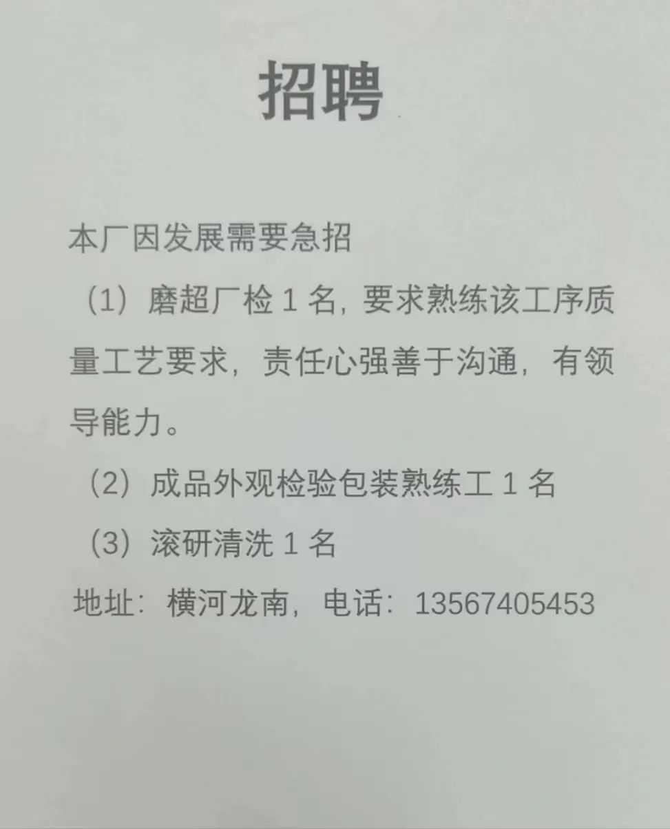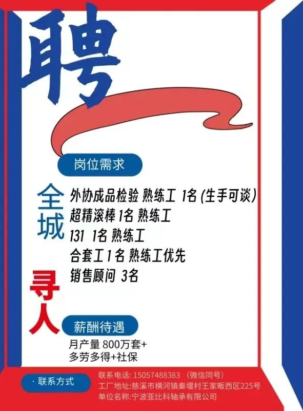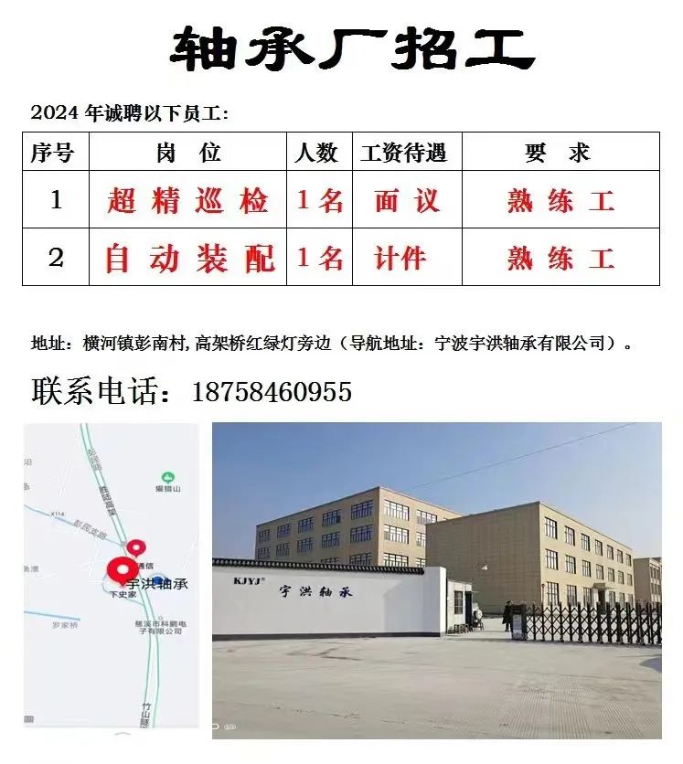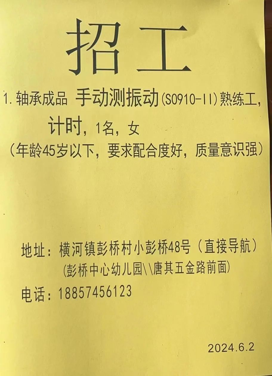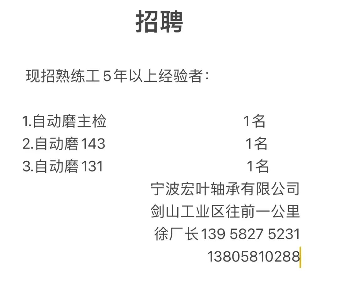 点击关注我们,一手招聘信息全掌握 加客服微信,进招聘群 慈溪超10万求职者已入群,每天推荐超100个新职位 ![]() 微生活代发招聘 招聘岗位: 黄焖鸡米饭店招帮厨阿姨一名,8:00-20:00中午休息两个小时14-16点。基本工资3800+加班费18/小时。 地址: 匡堰大道100号 电话: 13396844920 6/9 微生活代发招聘 招聘岗位: 急招自动磨四条线一名。 地址: 横河埋马 电话: 18267497566 6/9 微生活代发招聘 ![]() 6/9 微生活代发招聘 招聘岗位: 招聘无心磨粗磨100车 80车 二台熟练工一名。 地址: 横河 电话: 13567456661 6/9 微生活代发招聘 招聘岗位: 招超精熟练工一名。 地址: 横河东畈胡家山11号 电话: 13805812921 6/9 微生活代发招聘 招聘岗位: 急招轴承装瓶打包一名、计件工资。 地址: 横河镇彭桥福达厂区10楼3楼 电话: 13857805589 6/9 慈溪市景拓轴承配件厂 招聘岗位: 招粗磨,无心磨操作工一名,2台车要求熟练工。 地址: 横河石堰村兴业路红绿灯路口 电话: 13958266194 6/9 宁波宏叶轴承有限公司 ![]() 6/9 微生活代发招聘 招聘岗位: 招自动磨131,143熟练工一名。 地址: 横河相士地老环驰18号 电话: 13780016212 6/9 慈溪市亲宝电器有限公司 ![]() 6/9 微生活代发招聘 招聘岗位: 招粗磨无心磨熟练工,技术要好,有责任心,长期冷打内圈料产品管够,一台80,一台100,产品201-203。 地址: 横河彭桥工业区 电话: 13336600360 6/9 微生活代发招聘 招聘岗位: 招无心磨熟练工2名,精磨,(滚研加送货一名,)滚棒超精两名,手动测振一名,外观检验一名。 地址: 横河镇秦堰村王家畈紫林庵4号 电话: 13282216797,15968446299 6/9 微生活代发招聘 招聘岗位: 招自动车后道操作工一名,做608以下小产品,外圈有质量要求,待遇面谈。 地址: 宁波宁海 电话: 18989338070 7/2 高格轴承 招聘岗位: 招轴承特微产品,超精熟练工一名(4台嘉程,4台端面滚轮超)技术有师傅级别的工资面谈,滚研熟练工一名,质量总检或巡检一名。 地址: 慈溪市宁波杰尔电器有限公司(周至大道585支路东) 电话: 13968229982 6/17 宁波小二马轴承有限公司 招聘岗位: 招后道包装和测振熟练工一名 ,男女不限,18-40周岁,有能力的待遇高 地址: 横河彭桥万洋C区46-2 电话: 胡国良 13355935890 6/8 微生活代发招聘 招聘岗位: 招自动磨 143、 131 、201 两条线带超精一名 地址: 横河梅园 电话: 13968270401 6/8 微生活代发招聘 招聘岗位: 招数控操作工若干名,要求服从安排,有责任心!年龄40岁以下。有相关工作经验者优先 地址: 横河彭桥万洋众创城C区 电话: 19957024439 6/8 慈溪市康辉木制品厂 招聘岗位: 招普工一名。 地址: 横河镇西跃马桥49号 电话: 18170221159 6/8 微生活代发招聘 ![]() 6/8 宁波亚比科轴承有限公司 ![]() 6/8 微生活代发招聘 招聘岗位: 招自动磨,超精/机修师傅一名。 地址: 横河镇相士地村 电话: 15967885668杨经理 6/8 微生活代发招聘 招聘岗位: 招外圈气泵车后道工一名,两条线长期做202/103产量稳定技术一定要过关! 地址: 横河交警队北边100米 电话: 15990248000 6/8 微生活代发招聘 招聘岗位: 招雕刻机操机学徒一名,待遇具体面议,住横河优先。 地址: 横河模具城 电话: 18042059903 6/8 微生活代发招聘 招聘岗位: 招毛圈下料工1名,4台金马,201和608。 地址: 横河镇石堰村委会 电话: 13586643244 6/8 慈溪市横河吴勇五金配件厂 招聘岗位: 招冲床熟练女工1名 地址: 横河镇梅湖路18号 电话: 18958366339 6/8 微生活代发招聘 招聘岗位: 招工密封件检验员一名,要求女,年龄40岁以下,生手也可以 地址: 横河南站工业园区 电话: 15906574602 6/8 微生活代发招聘 招聘岗位: 招打杂工1名,轴承后道装瓶+打包 地址: 横河镇彭桥 电话: 13858366789 6/8 微生活代发招聘 招聘岗位: 包产量招聘:①.自动装配压盖工 2人 。②.201 8台 1人。③.143 1人。④.超精1人。⑤.平面 1人。⑥.无心夫妻 。 地址: 庵东镇西三村 电话: 15824262341 7/1 宁波弘韵精密机械有限公司 ![]() 6/27 微生活代发招聘 招聘岗位: 物流公司招聘接送货司机1名,需要C1驾照,有开四米二货车经验的,要求有力气,吃苦耐劳! 地址: 横河客运南站附近 电话: 13362475866 6/7 微生活代发招聘 招聘岗位: 轴承后道包装一名(女)测振一名。打杂工一名,装配工一名。三环气泵车熟练工做外圈一名(4台车),套圈检验一名,检验内圈 地址: 横河蒋家河 电话: 13968229982 6/7 微生活代发招聘 招聘岗位: 急招内圈无心磨工人一名,粗磨 ,3台1080车。要求熟练工,干活勤快。 地址: 横河梅园村竹山上段42号 电话: 13805812923 6/7 微生活代发招聘 招聘岗位: 招自动磨熟练工一名,201和143, 9台车, 要求会修车,能加班,有质量意识。 地址: 横河埋马 电话: 15575108631 6/7 竣宇轴承 招聘岗位: 招自动装配一名:要求技术非常熟练的员工。 地址: 匡堰倡隆村,匡堰实验幼儿园旁边一点 电话: 180 6927 8918 6/7 微生活代发招聘 招聘岗位: 轴承厂后道外观检验包装一名,巡检一名。 地址: 横河彭桥万洋 电话: 18958309011 6/7 假日酒店 招聘岗位: 急聘客房清洁员3名。 地址: 横河镇中兴西路29-49号 电话: 18867858477 6/7 微生活代发招聘 招聘岗位: 急招自动磨熟练工一名、143,131,201,三条线。 地址: 横河镇湖西门铁路旁 电话: 13857805589 6/7 微生活代发招聘 招聘岗位: 平面无心巡检员一名,要求有2年以上工作经验! 打杂工一名,工资面议 地址: 横河镇马堰村新环驰钢管厂后面 电话: 18968296976 6/7 宁波迈瑞机械有限公司 ![]() 6/7 微生活代发招聘 ![]() 6/7 微生活代发招