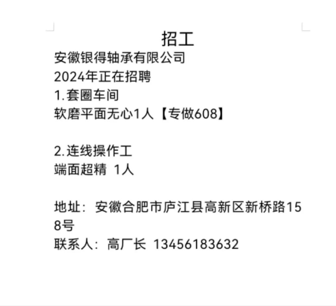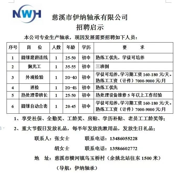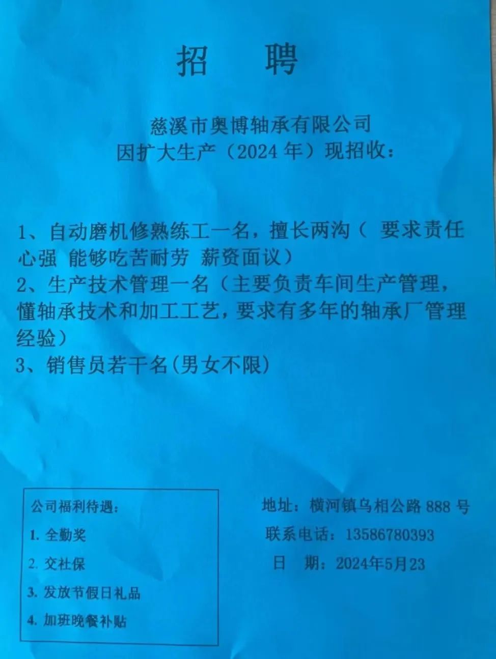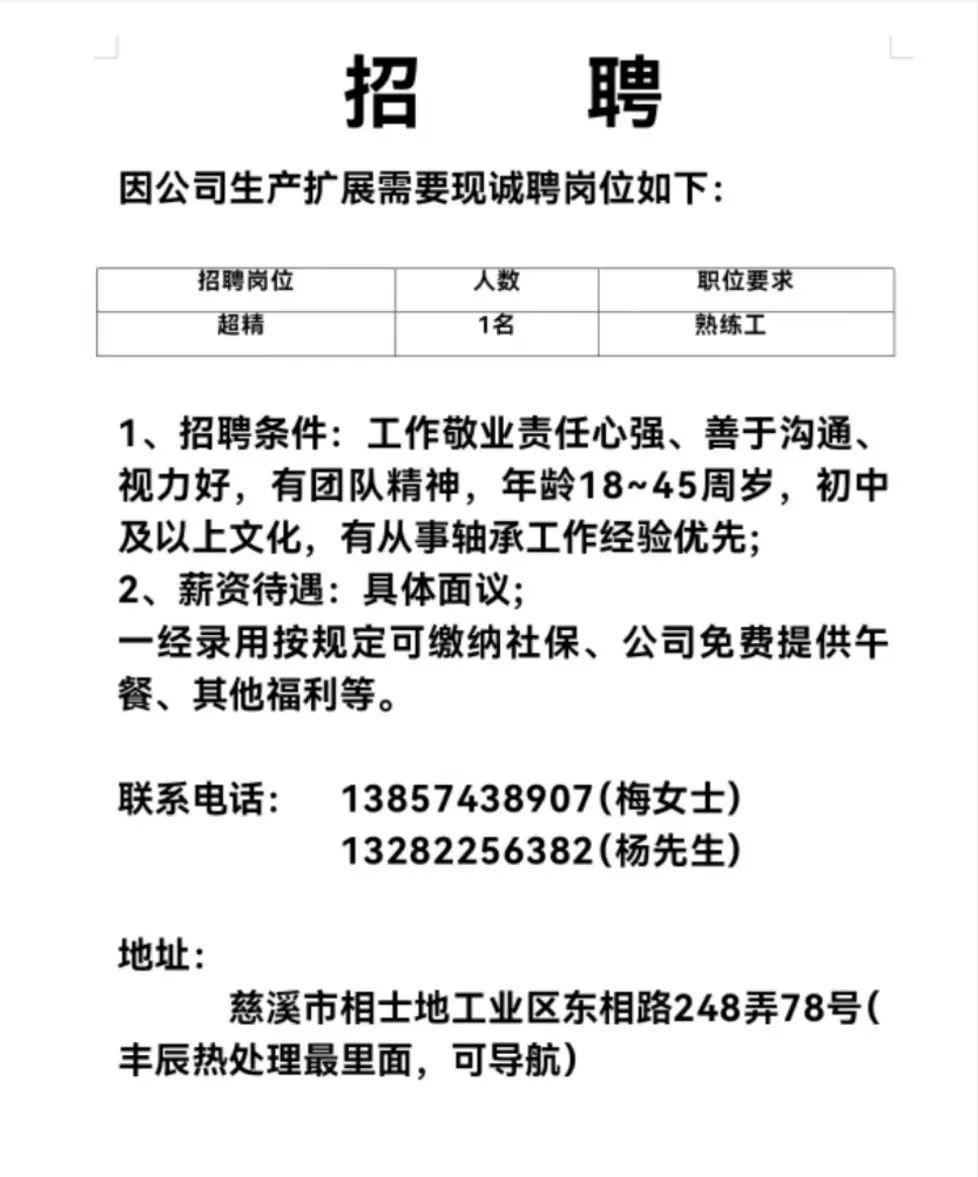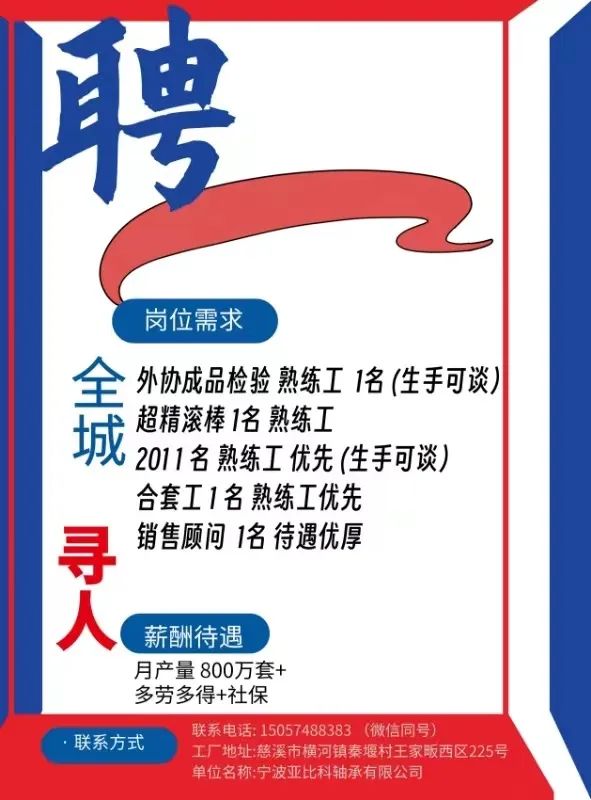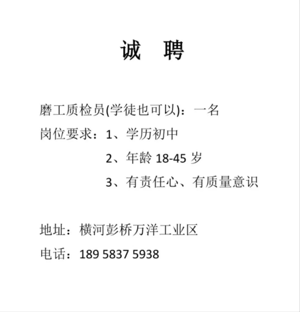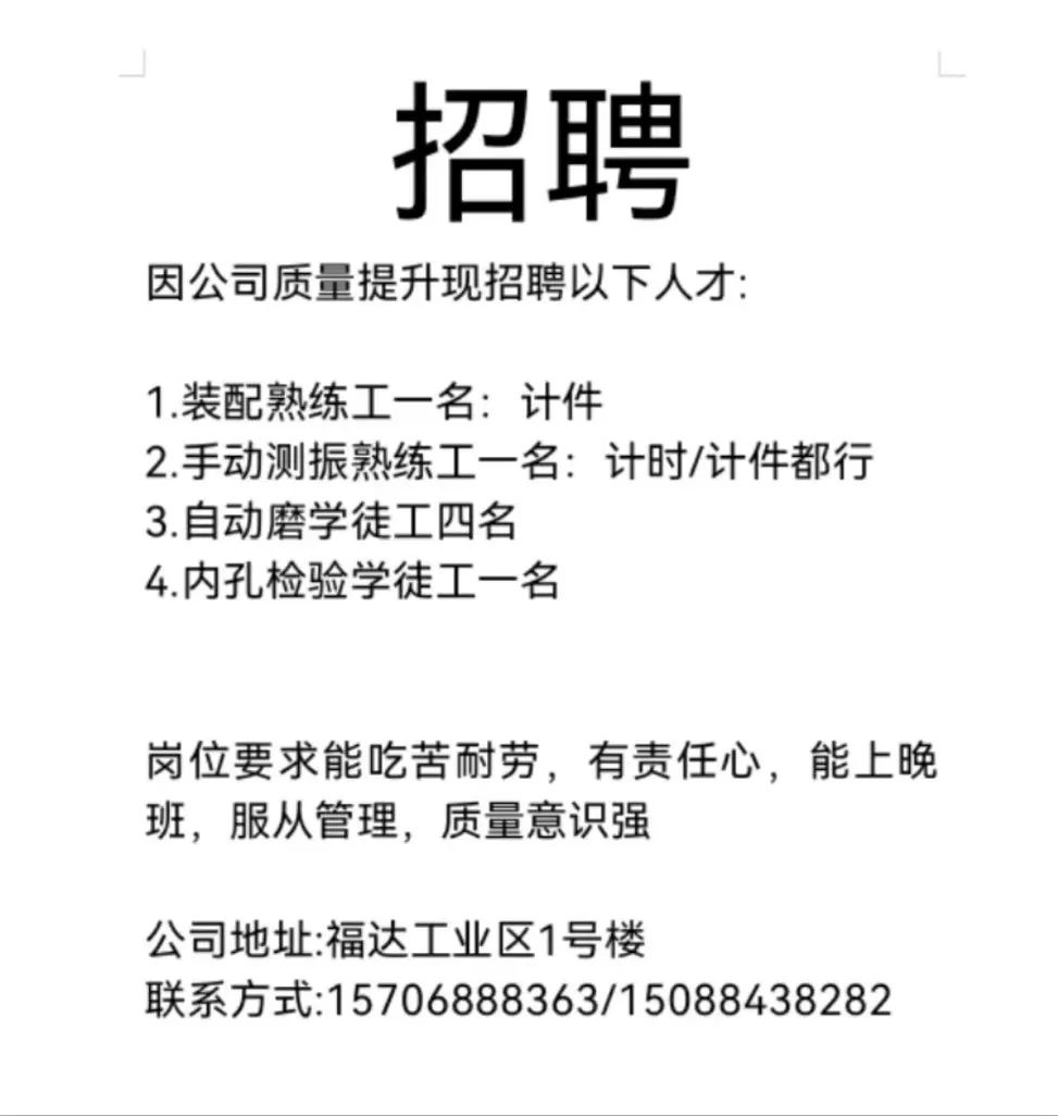 点击关注我们,一手招聘信息全掌握 加客服微信,进招聘群 慈溪超10万求职者已入群,每天推荐超100个新职位 ![]() 微生活代发招聘 招聘岗位: 黄焖鸡米饭店招帮厨阿姨一名,8:00-20:00中午休息两个小时14-16点。基本工资3800+加班费18/小时。 地址: 匡堰大道100号 电话: 13396844920 6/9 微生活代发招聘 招聘岗位: 急招自动磨四条线一名。 地址: 横河埋马 电话: 18267497566 6/9 微生活代发招聘 ![]() 6/9 微生活代发招聘 招聘岗位: 招聘无心磨粗磨100车 80车 二台熟练工一名。 地址: 横河 电话: 13567456661 6/9 微生活代发招聘 招聘岗位: 招超精熟练工一名。 地址: 横河东畈胡家山11号 电话: 13805812921 6/9 微生活代发招聘 招聘岗位: 急招轴承装瓶打包一名、计件工资。 地址: 横河镇彭桥福达厂区10楼3楼 电话: 13857805589 6/9 慈溪市景拓轴承配件厂 招聘岗位: 招粗磨,无心磨操作工一名,2台车要求熟练工。 地址: 横河石堰村兴业路红绿灯路口 电话: 13958266194 6/9 宁波宏叶轴承有限公司 ![]() 6/9 微生活代发招聘 招聘岗位: 招自动磨131,143熟练工一名。 地址: 横河相士地老环驰18号 电话: 13780016212 6/9 慈溪市亲宝电器有限公司 ![]() 6/9 微生活代发招聘 招聘岗位: 招粗磨无心磨熟练工,技术要好,有责任心,长期冷打内圈料产品管够,一台80,一台100,产品201-203。 地址: 横河彭桥工业区 电话: 13336600360 6/9 微生活代发招聘 招聘岗位: 招无心磨熟练工2名,精磨,(滚研加送货一名,)滚棒超精两名,手动测振一名,外观检验一名。 地址: 横河镇秦堰村王家畈紫林庵4号 电话: 13282216797,15968446299 6/9 微生活代发招聘 招聘岗位: 招自动车后道操作工一名,做608以下小产品,外圈有质量要求,待遇面谈。 地址: 宁波宁海 电话: 18989338070 7/2 高格轴承 招聘岗位: 招轴承特微产品,超精熟练工一名(4台嘉程,4台端面滚轮超)技术有师傅级别的工资面谈,滚研熟练工一名,质量总检或巡检一名。 地址: 慈溪市宁波杰尔电器有限公司(周至大道585支路东) 电话: 13968229982 6/17 宁波小二马轴承有限公司 招聘岗位: 招后道包装和测振熟练工一名 ,男女不限,18-40周岁,有能力的待遇高 地址: 横河彭桥万洋C区46-2 电话: 胡国良 13355935890 6/8 微生活代发招聘 招聘岗位: 招自动磨 143、 131 、201 两条线带超精一名 地址: 横河梅园 电话: 13968270401 6/8 微生活代发招聘 招聘岗位: 招数控操作工若干名,要求服从安排,有责任心!年龄40岁以下。有相关工作经验者优先 地址: 横河彭桥万洋众创城C区 电话: 19957024439 6/8 慈溪市康辉木制品厂 招聘岗位: 招普工一名。 地址: 横河镇西跃马桥49号 电话: 18170221159 6/8 微生活代发招聘 ![]() 6/8 宁波亚比科轴承有限公司 ![]() 6/8 微生活代发招聘 招聘岗位: 招自动磨,超精/机修师傅一名。 地址: 横河镇相士地村 电话: 15967885668杨经理 6/8 微生活代发招聘 招聘岗位: 招外圈气泵车后道工一名,两条线长期做202/103产量稳定技术一定要过关! 地址: 横河交警队北边100米 电话: 15990248000 6/8 微生活代发招聘 招聘岗位: 招雕刻机操机学徒一名,待遇具体面议,住横河优先。 地址: 横河模具城 电话: 18042059903 6/8 微生活代发招聘 招聘岗位: 招毛圈下料工1名,4台金马,201和608。 地址: 横河镇石堰村委会 电话: 13586643244 6/8 慈溪市横河吴勇五金配件厂 招聘岗位: 招冲床熟练女工1名 地址: 横河镇梅湖路18号 电话: 18958366339 6/8 微生活代发招聘 招聘岗位: 招工密封件检验员一名,要求女,年龄40岁以下,生手也可以 地址: 横河南站工业园区 电话: 15906574602 6/8 微生活代发招聘 招聘岗位: 招打杂工1名,轴承后道装瓶+打包 地址: 横河镇彭桥 电话: 13858366789 6/8 微生活代发招聘 招聘岗位: 包产量招聘:①.自动装配压盖工 2人 。②.201 8台 1人。③.143 1人。④.超精1人。⑤.平面 1人。⑥.无心夫妻 。 地址: 庵东镇西三村 电话: 15824262341 7/1 宁波弘韵精密机械有限公司 ![]() 6/27 微生活代发招聘 招聘岗位: 物流公司招聘接送货司机1名,需要C1驾照,有开四米二货车经验的,要求有力气,吃苦耐劳! 地址: 横河客运南站附近 电话: 13362475866 6/7 微生活代发招聘 招聘岗位: 轴承后道包装一名(女)测振一名。打杂工一名,装配工一名。三环气泵车熟练工做外圈一名(4台车),套圈检验一名,检验内圈 地址: 横河蒋家河 电话: 13968229982 6/7 微生活代发招聘 招聘岗位: 急招内圈无心磨工人一名,粗磨 ,3台1080车。要求熟练工,干活勤快。 地址: 横河梅园村竹山上段42号 电话: 13805812923 6/7 微生活代发招聘 招聘岗位: 招自动磨熟练工一名,201和143, 9台车, 要求会修车,能加班,有质量意识。 地址: 横河埋马 电话: 15575108631 6/7 竣宇轴承 招聘岗位: 招自动装配一名:要求技术非常熟练的员工。 地址: 匡堰倡隆村,匡堰实验幼儿园旁边一点 电话: 180 6927 8918 6/7 微生活代发招聘 招聘岗位: 轴承厂后道外观检验包装一名,巡检一名。 地址: 横河彭桥万洋 电话: 18958309011 6/7 假日酒店 招聘岗位: 急聘客房清洁员3名。 地址: 横河镇中兴西路29-49号 电话: 18867858477 6/7 微生活代发招聘 招聘岗位: 急招自动磨熟练工一名、143,131,201,三条线。 地址: 横河镇湖西门铁路旁 电话: 13857805589 6/7 微生活代发招聘 招聘岗位: 平面无心巡检员一名,要求有2年以上工作经验! 打杂工一名,工资面议 地址: 横河镇马堰村新环驰钢管厂后面 电话: 18968296976 6/7 宁波迈瑞机械有限公司 ![]() 6/7 微生活代发招聘 ![]() 6/7 微生活代发招