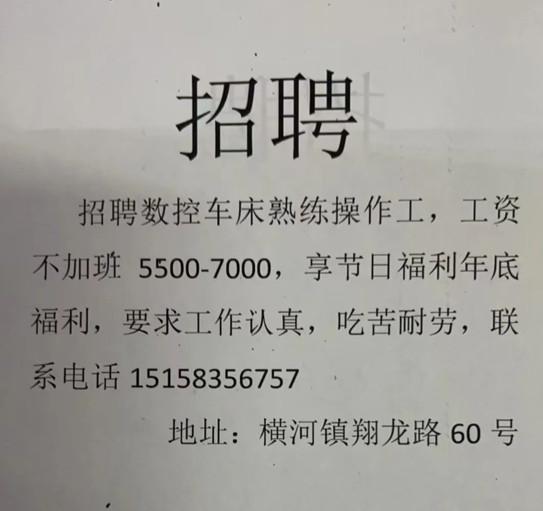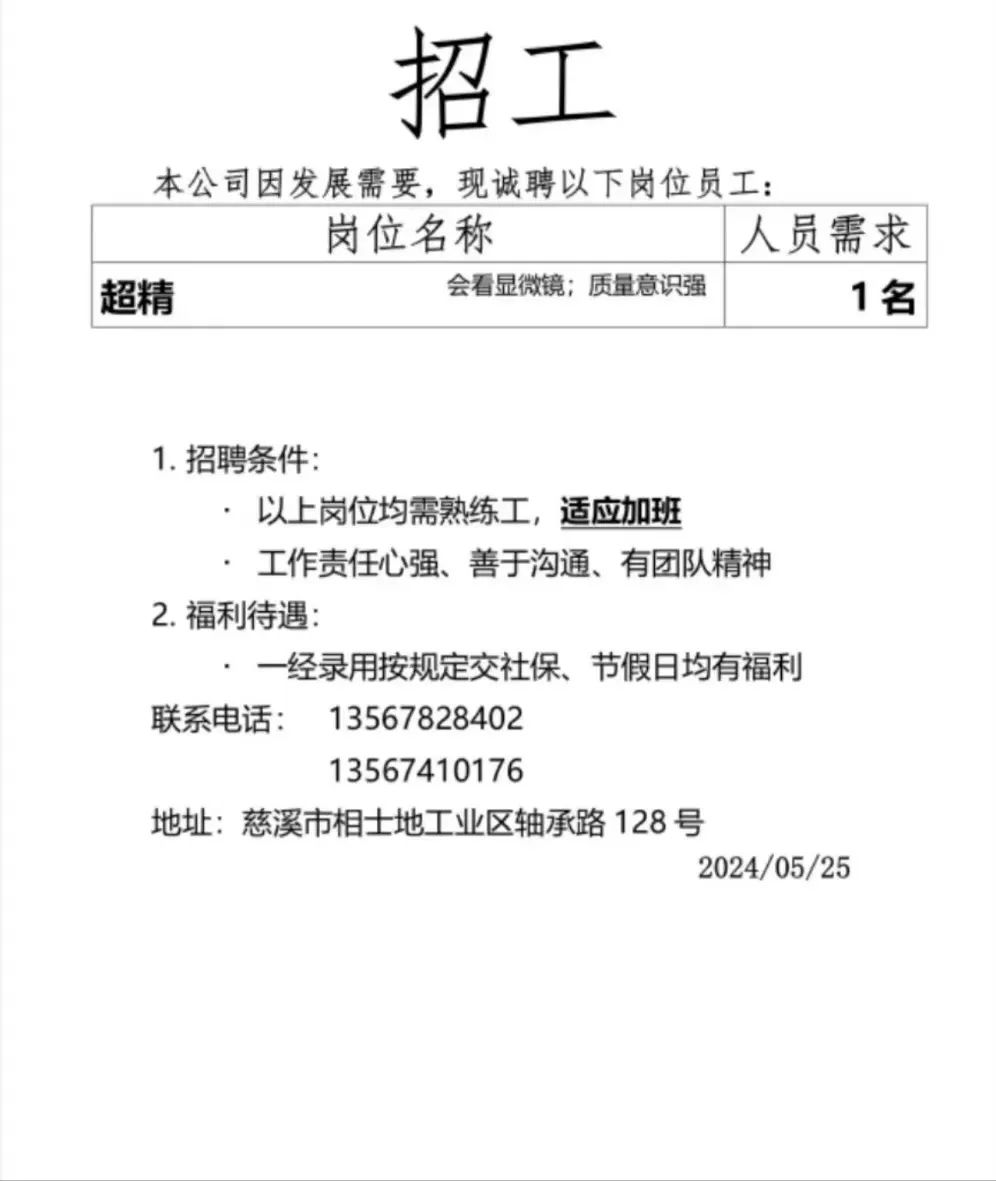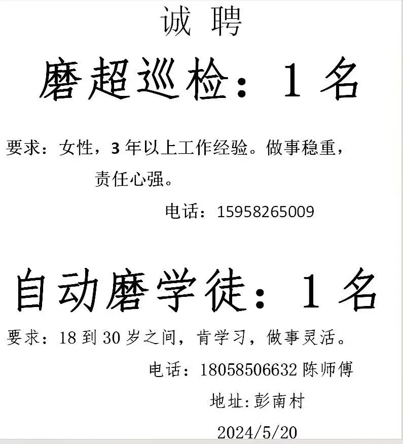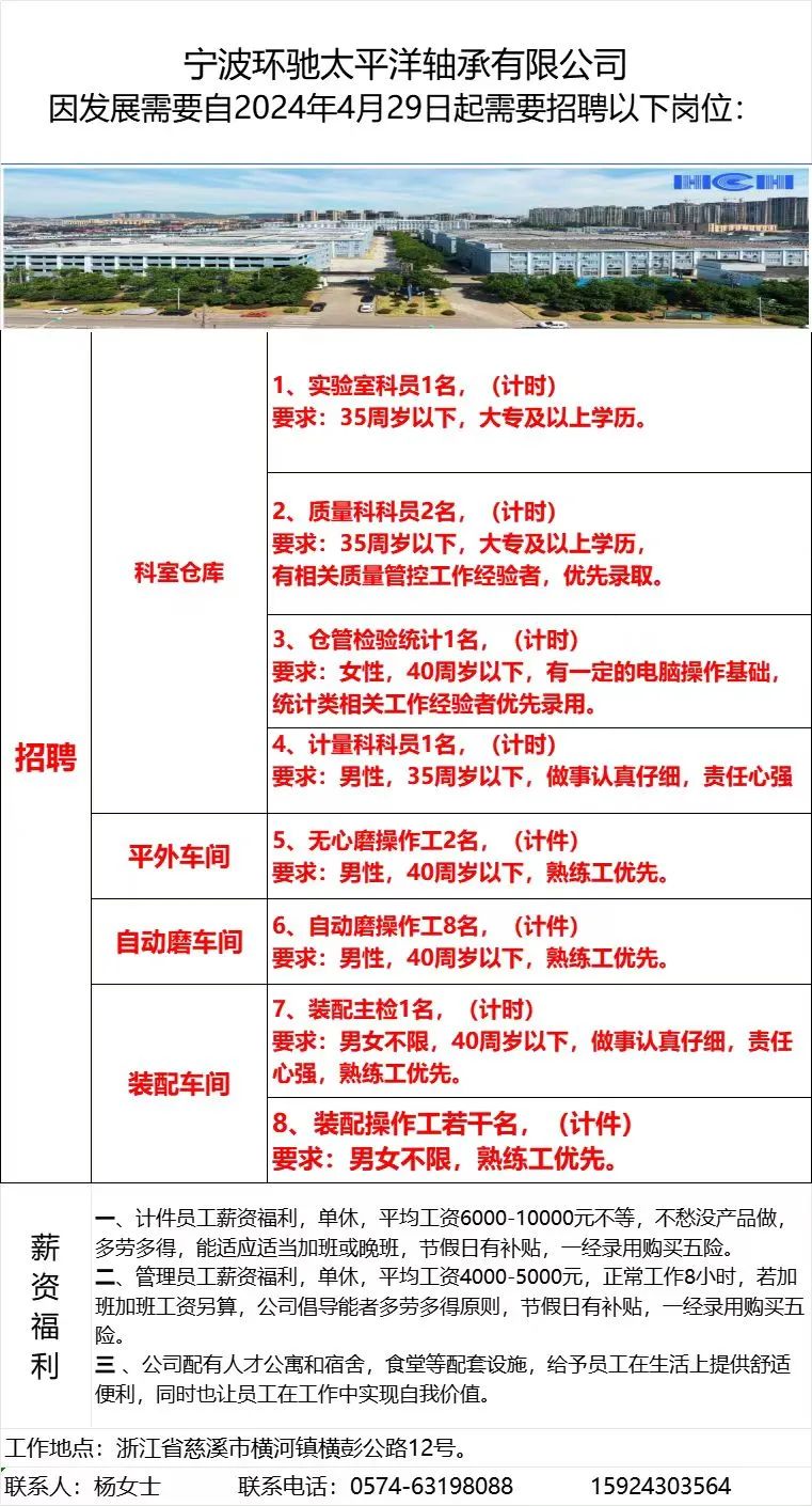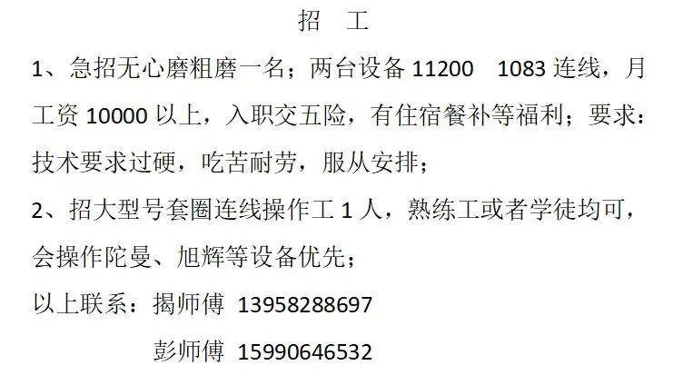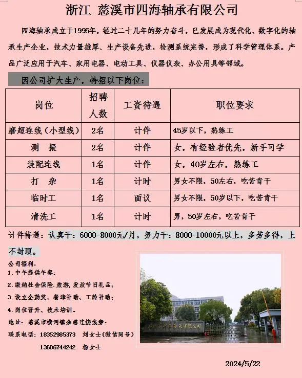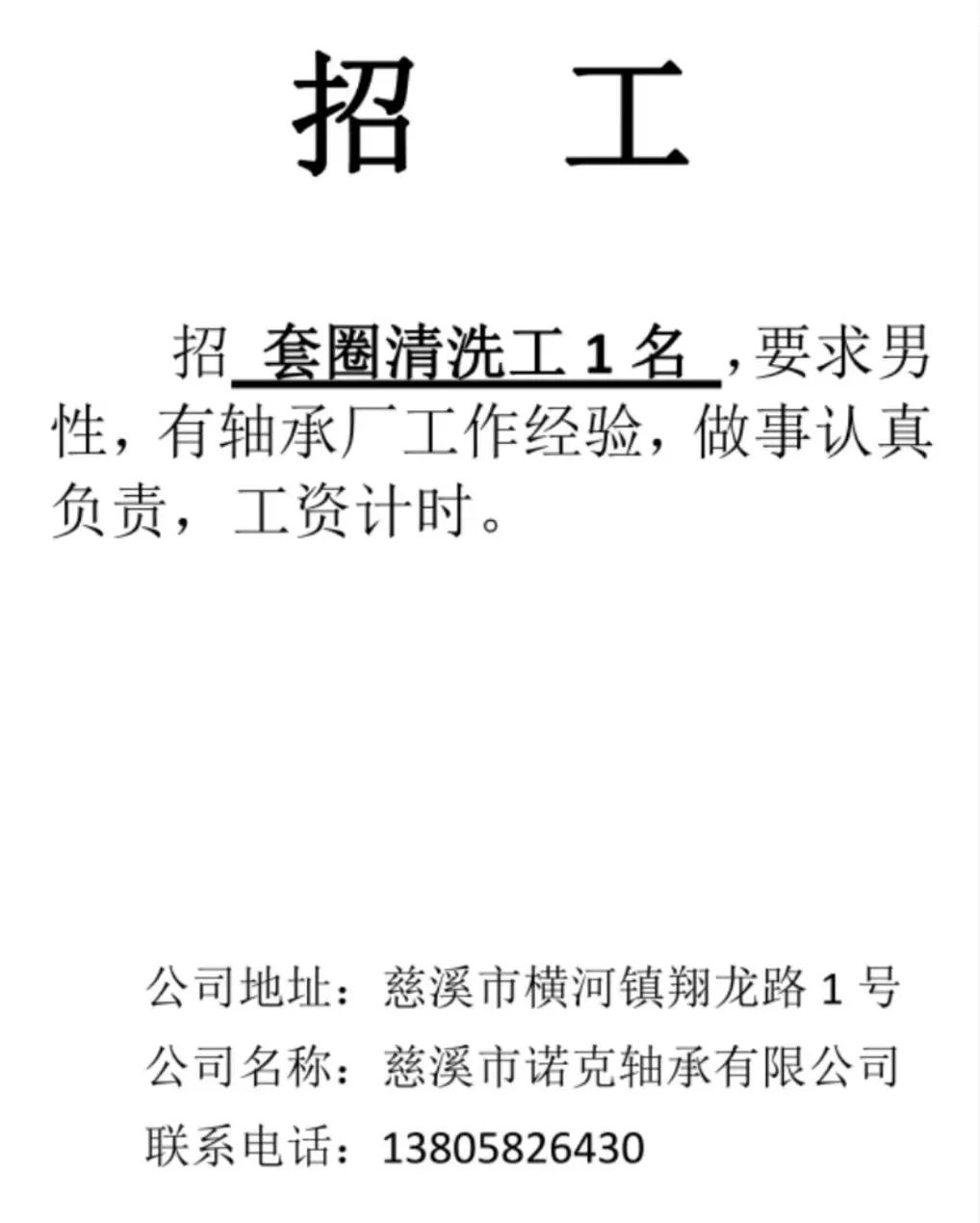 点击关注我们,一手招聘信息全掌握 加客服微信,进招聘群 慈溪超10万求职者已入群,每天推荐超100个新职位 ![]() 微生活代发招聘 招聘岗位: 黄焖鸡米饭店招帮厨阿姨一名,8:00-20:00中午休息两个小时14-16点。基本工资3800+加班费18/小时。 地址: 匡堰大道100号 电话: 13396844920 6/9 微生活代发招聘 招聘岗位: 急招自动磨四条线一名。 地址: 横河埋马 电话: 18267497566 6/9 微生活代发招聘 ![]() 6/9 微生活代发招聘 招聘岗位: 招聘无心磨粗磨100车 80车 二台熟练工一名。 地址: 横河 电话: 13567456661 6/9 微生活代发招聘 招聘岗位: 招超精熟练工一名。 地址: 横河东畈胡家山11号 电话: 13805812921 6/9 微生活代发招聘 招聘岗位: 急招轴承装瓶打包一名、计件工资。 地址: 横河镇彭桥福达厂区10楼3楼 电话: 13857805589 6/9 慈溪市景拓轴承配件厂 招聘岗位: 招粗磨,无心磨操作工一名,2台车要求熟练工。 地址: 横河石堰村兴业路红绿灯路口 电话: 13958266194 6/9 宁波宏叶轴承有限公司 ![]() 6/9 微生活代发招聘 招聘岗位: 招自动磨131,143熟练工一名。 地址: 横河相士地老环驰18号 电话: 13780016212 6/9 慈溪市亲宝电器有限公司 ![]() 6/9 微生活代发招聘 招聘岗位: 招粗磨无心磨熟练工,技术要好,有责任心,长期冷打内圈料产品管够,一台80,一台100,产品201-203。 地址: 横河彭桥工业区 电话: 13336600360 6/9 微生活代发招聘 招聘岗位: 招无心磨熟练工2名,精磨,(滚研加送货一名,)滚棒超精两名,手动测振一名,外观检验一名。 地址: 横河镇秦堰村王家畈紫林庵4号 电话: 13282216797,15968446299 6/9 微生活代发招聘 招聘岗位: 招自动车后道操作工一名,做608以下小产品,外圈有质量要求,待遇面谈。 地址: 宁波宁海 电话: 18989338070 7/2 高格轴承 招聘岗位: 招轴承特微产品,超精熟练工一名(4台嘉程,4台端面滚轮超)技术有师傅级别的工资面谈,滚研熟练工一名,质量总检或巡检一名。 地址: 慈溪市宁波杰尔电器有限公司(周至大道585支路东) 电话: 13968229982 6/17 宁波小二马轴承有限公司 招聘岗位: 招后道包装和测振熟练工一名 ,男女不限,18-40周岁,有能力的待遇高 地址: 横河彭桥万洋C区46-2 电话: 胡国良 13355935890 6/8 微生活代发招聘 招聘岗位: 招自动磨 143、 131 、201 两条线带超精一名 地址: 横河梅园 电话: 13968270401 6/8 微生活代发招聘 招聘岗位: 招数控操作工若干名,要求服从安排,有责任心!年龄40岁以下。有相关工作经验者优先 地址: 横河彭桥万洋众创城C区 电话: 19957024439 6/8 慈溪市康辉木制品厂 招聘岗位: 招普工一名。 地址: 横河镇西跃马桥49号 电话: 18170221159 6/8 微生活代发招聘 ![]() 6/8 宁波亚比科轴承有限公司 ![]() 6/8 微生活代发招聘 招聘岗位: 招自动磨,超精/机修师傅一名。 地址: 横河镇相士地村 电话: 15967885668杨经理 6/8 微生活代发招聘 招聘岗位: 招外圈气泵车后道工一名,两条线长期做202/103产量稳定技术一定要过关! 地址: 横河交警队北边100米 电话: 15990248000 6/8 微生活代发招聘 招聘岗位: 招雕刻机操机学徒一名,待遇具体面议,住横河优先。 地址: 横河模具城 电话: 18042059903 6/8 微生活代发招聘 招聘岗位: 招毛圈下料工1名,4台金马,201和608。 地址: 横河镇石堰村委会 电话: 13586643244 6/8 慈溪市横河吴勇五金配件厂 招聘岗位: 招冲床熟练女工1名 地址: 横河镇梅湖路18号 电话: 18958366339 6/8 微生活代发招聘 招聘岗位: 招工密封件检验员一名,要求女,年龄40岁以下,生手也可以 地址: 横河南站工业园区 电话: 15906574602 6/8 微生活代发招聘 招聘岗位: 招打杂工1名,轴承后道装瓶+打包 地址: 横河镇彭桥 电话: 13858366789 6/8 微生活代发招聘 招聘岗位: 包产量招聘:①.自动装配压盖工 2人 。②.201 8台 1人。③.143 1人。④.超精1人。⑤.平面 1人。⑥.无心夫妻 。 地址: 庵东镇西三村 电话: 15824262341 7/1 宁波弘韵精密机械有限公司 ![]() 6/27 微生活代发招聘 招聘岗位: 物流公司招聘接送货司机1名,需要C1驾照,有开四米二货车经验的,要求有力气,吃苦耐劳! 地址: 横河客运南站附近 电话: 13362475866 6/7 微生活代发招聘 招聘岗位: 轴承后道包装一名(女)测振一名。打杂工一名,装配工一名。三环气泵车熟练工做外圈一名(4台车),套圈检验一名,检验内圈 地址: 横河蒋家河 电话: 13968229982 6/7 微生活代发招聘 招聘岗位: 急招内圈无心磨工人一名,粗磨 ,3台1080车。要求熟练工,干活勤快。 地址: 横河梅园村竹山上段42号 电话: 13805812923 6/7 微生活代发招聘 招聘岗位: 招自动磨熟练工一名,201和143, 9台车, 要求会修车,能加班,有质量意识。 地址: 横河埋马 电话: 15575108631 6/7 竣宇轴承 招聘岗位: 招自动装配一名:要求技术非常熟练的员工。 地址: 匡堰倡隆村,匡堰实验幼儿园旁边一点 电话: 180 6927 8918 6/7 微生活代发招聘 招聘岗位: 轴承厂后道外观检验包装一名,巡检一名。 地址: 横河彭桥万洋 电话: 18958309011 6/7 假日酒店 招聘岗位: 急聘客房清洁员3名。 地址: 横河镇中兴西路29-49号 电话: 18867858477 6/7 微生活代发招聘 招聘岗位: 急招自动磨熟练工一名、143,131,201,三条线。 地址: 横河镇湖西门铁路旁 电话: 13857805589 6/7 微生活代发招聘 招聘岗位: 平面无心巡检员一名,要求有2年以上工作经验! 打杂工一名,工资面议 地址: 横河镇马堰村新环驰钢管厂后面 电话: 18968296976 6/7 宁波迈瑞机械有限公司 ![]() 6/7 微生活代发招聘 ![]() 6/7 微生活代发招
