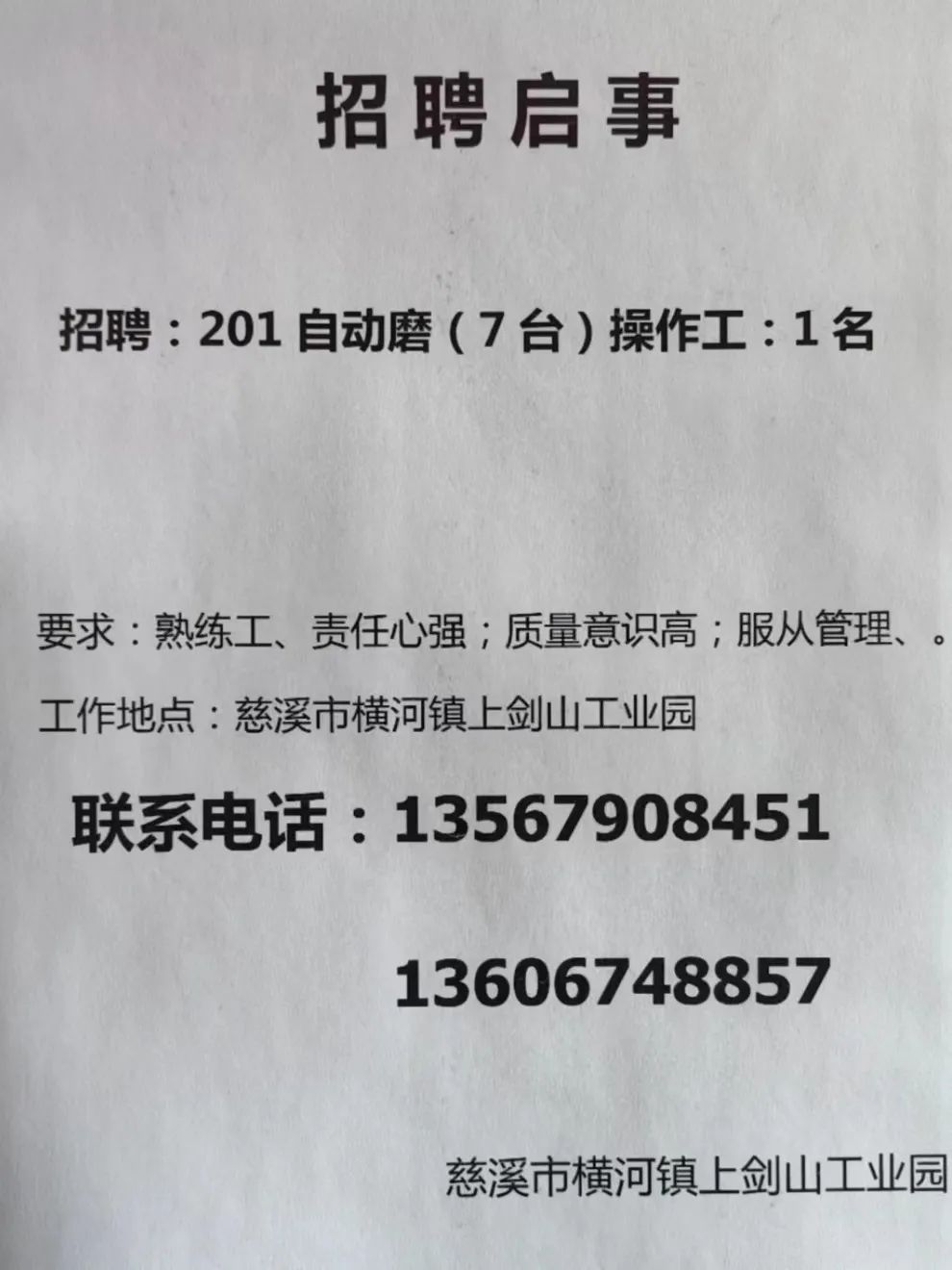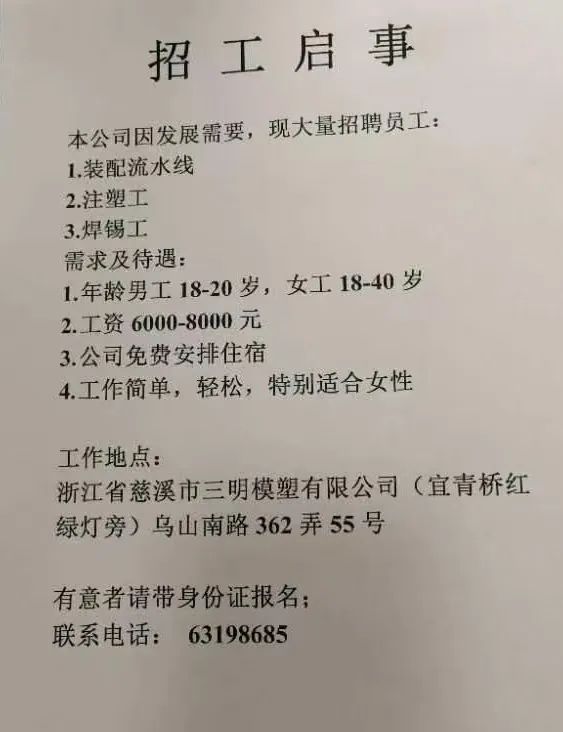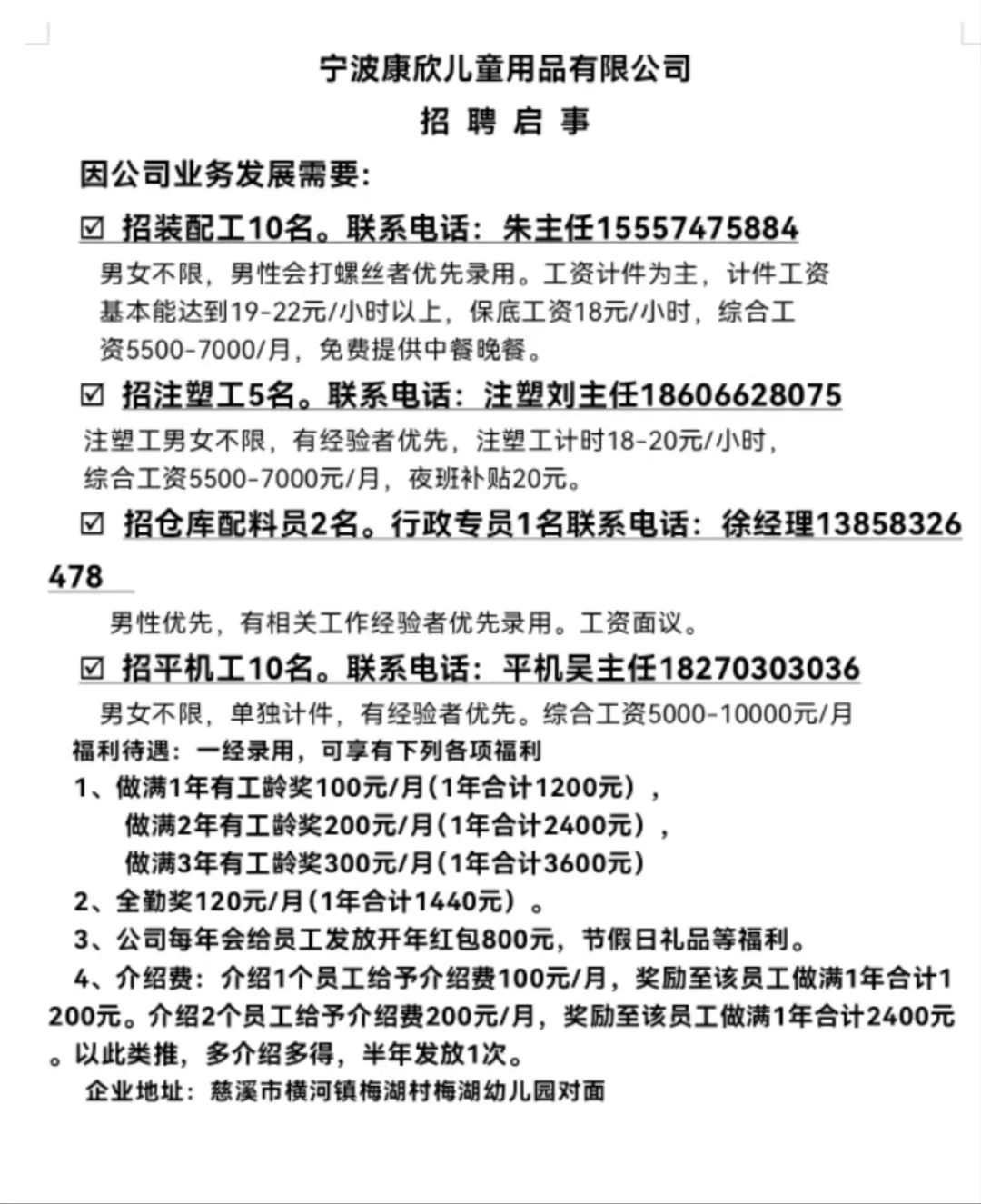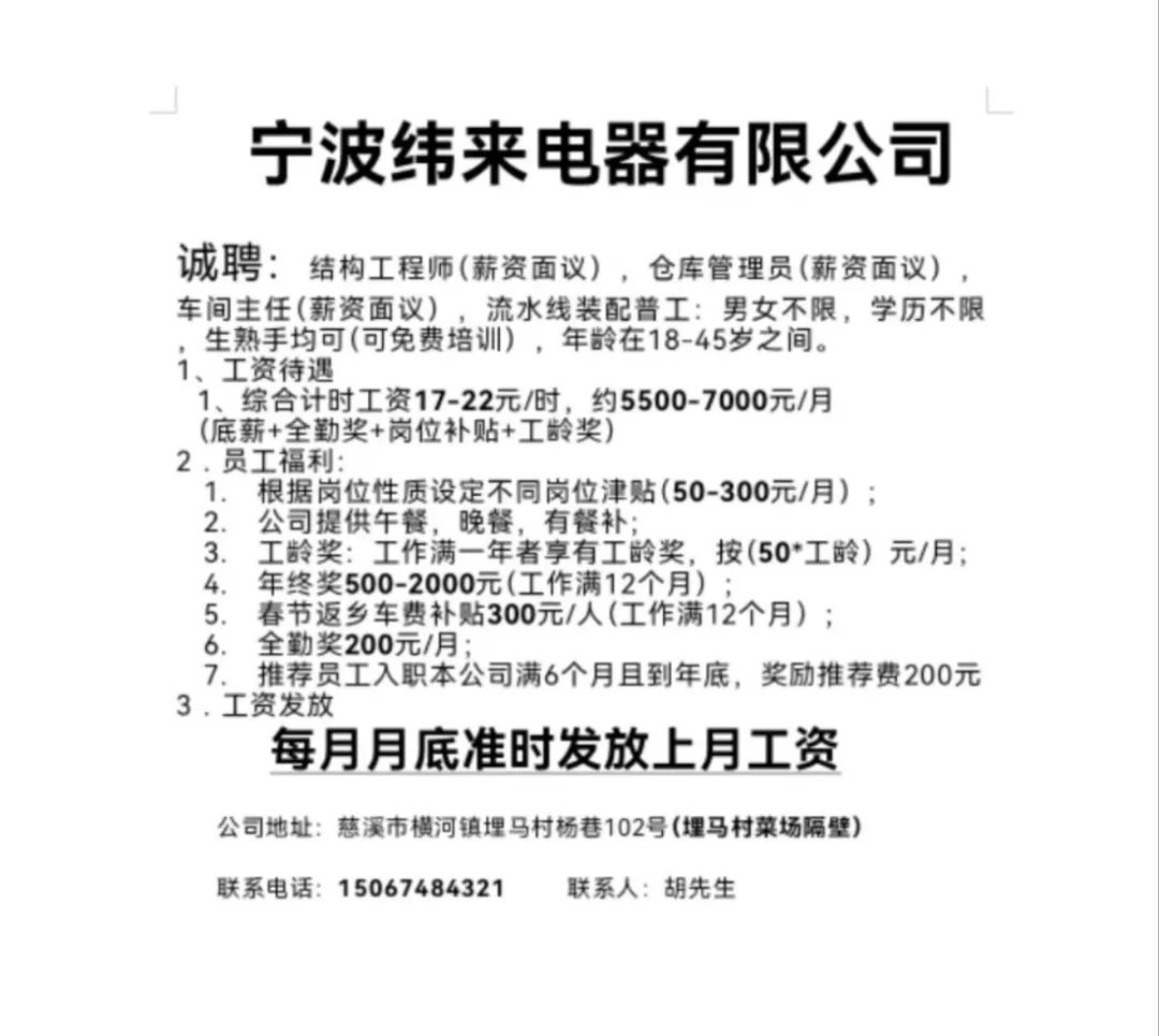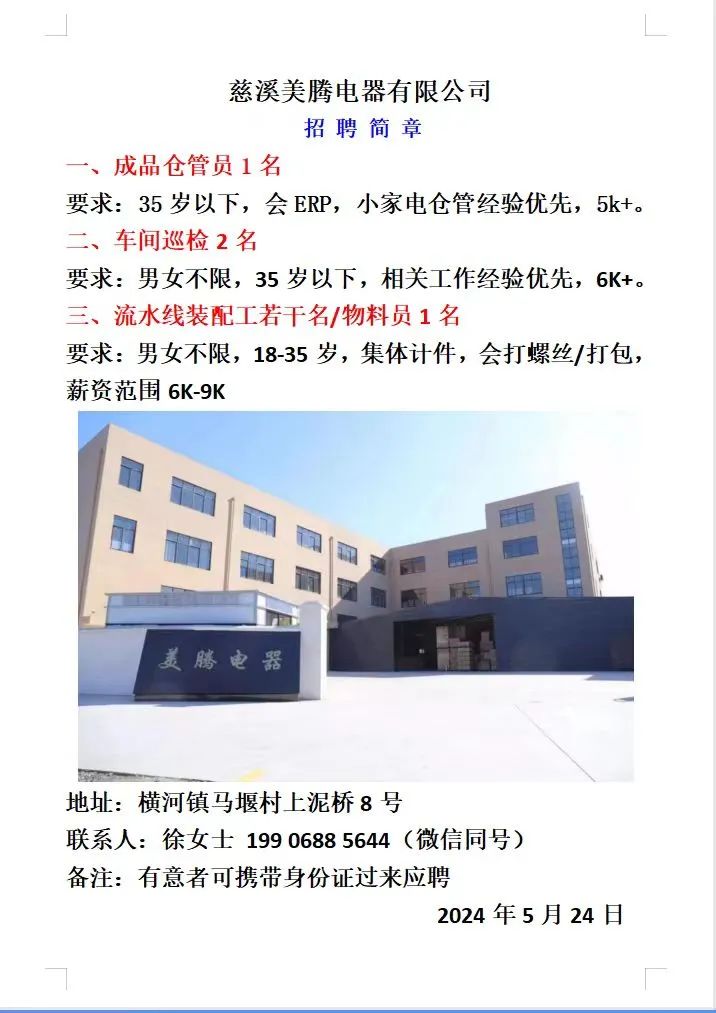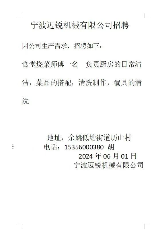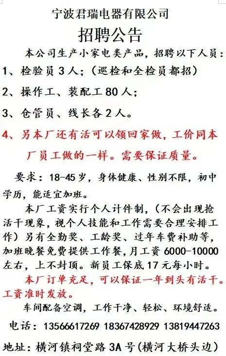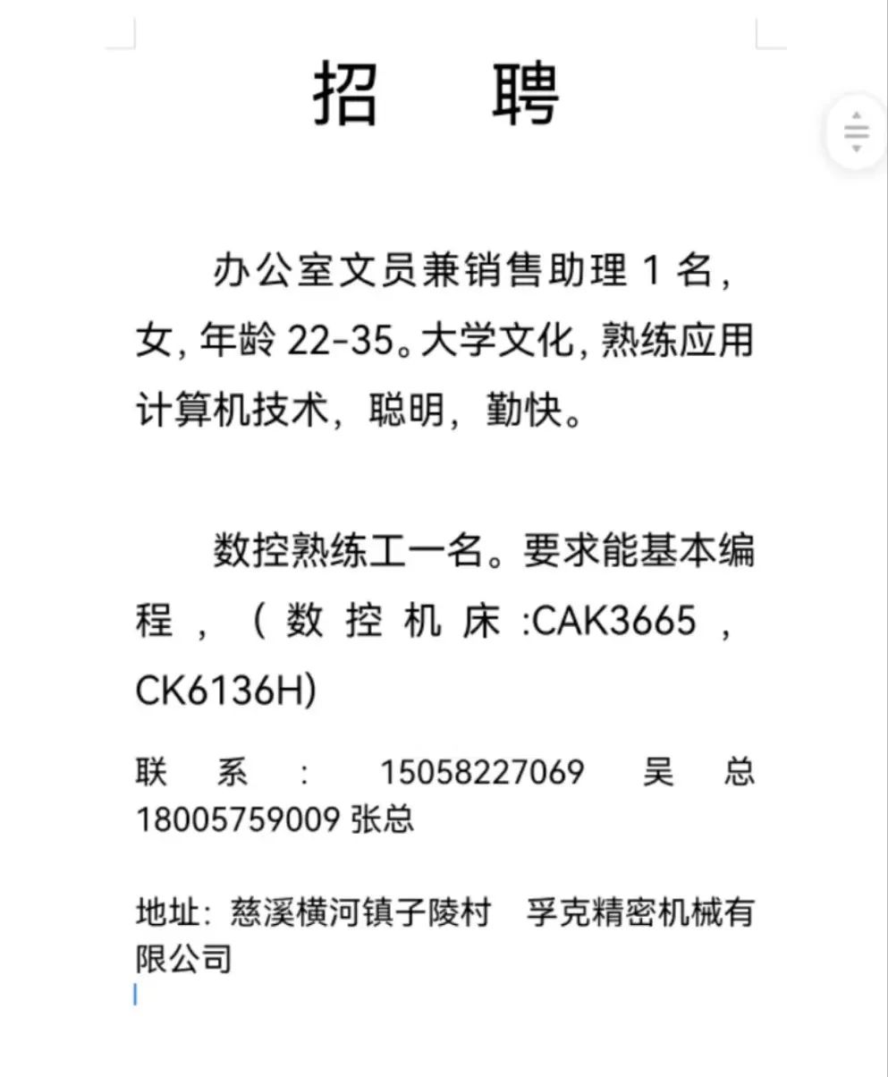 点击关注我们,一手招聘信息全掌握 加客服微信,进招聘群 慈溪超10万求职者已入群,每天推荐超100个新职位 ![]() 微生活代发招聘 招聘岗位: 黄焖鸡米饭店招帮厨阿姨一名,8:00-20:00中午休息两个小时14-16点。基本工资3800+加班费18/小时。 地址: 匡堰大道100号 电话: 13396844920 6/9 微生活代发招聘 招聘岗位: 急招自动磨四条线一名。 地址: 横河埋马 电话: 18267497566 6/9 微生活代发招聘 ![]() 6/9 微生活代发招聘 招聘岗位: 招聘无心磨粗磨100车 80车 二台熟练工一名。 地址: 横河 电话: 13567456661 6/9 微生活代发招聘 招聘岗位: 招超精熟练工一名。 地址: 横河东畈胡家山11号 电话: 13805812921 6/9 微生活代发招聘 招聘岗位: 急招轴承装瓶打包一名、计件工资。 地址: 横河镇彭桥福达厂区10楼3楼 电话: 13857805589 6/9 慈溪市景拓轴承配件厂 招聘岗位: 招粗磨,无心磨操作工一名,2台车要求熟练工。 地址: 横河石堰村兴业路红绿灯路口 电话: 13958266194 6/9 宁波宏叶轴承有限公司 ![]() 6/9 微生活代发招聘 招聘岗位: 招自动磨131,143熟练工一名。 地址: 横河相士地老环驰18号 电话: 13780016212 6/9 慈溪市亲宝电器有限公司 ![]() 6/9 微生活代发招聘 招聘岗位: 招粗磨无心磨熟练工,技术要好,有责任心,长期冷打内圈料产品管够,一台80,一台100,产品201-203。 地址: 横河彭桥工业区 电话: 13336600360 6/9 微生活代发招聘 招聘岗位: 招无心磨熟练工2名,精磨,(滚研加送货一名,)滚棒超精两名,手动测振一名,外观检验一名。 地址: 横河镇秦堰村王家畈紫林庵4号 电话: 13282216797,15968446299 6/9 微生活代发招聘 招聘岗位: 招自动车后道操作工一名,做608以下小产品,外圈有质量要求,待遇面谈。 地址: 宁波宁海 电话: 18989338070 7/2 高格轴承 招聘岗位: 招轴承特微产品,超精熟练工一名(4台嘉程,4台端面滚轮超)技术有师傅级别的工资面谈,滚研熟练工一名,质量总检或巡检一名。 地址: 慈溪市宁波杰尔电器有限公司(周至大道585支路东) 电话: 13968229982 6/17 宁波小二马轴承有限公司 招聘岗位: 招后道包装和测振熟练工一名 ,男女不限,18-40周岁,有能力的待遇高 地址: 横河彭桥万洋C区46-2 电话: 胡国良 13355935890 6/8 微生活代发招聘 招聘岗位: 招自动磨 143、 131 、201 两条线带超精一名 地址: 横河梅园 电话: 13968270401 6/8 微生活代发招聘 招聘岗位: 招数控操作工若干名,要求服从安排,有责任心!年龄40岁以下。有相关工作经验者优先 地址: 横河彭桥万洋众创城C区 电话: 19957024439 6/8 慈溪市康辉木制品厂 招聘岗位: 招普工一名。 地址: 横河镇西跃马桥49号 电话: 18170221159 6/8 微生活代发招聘 ![]() 6/8 宁波亚比科轴承有限公司 ![]() 6/8 微生活代发招聘 招聘岗位: 招自动磨,超精/机修师傅一名。 地址: 横河镇相士地村 电话: 15967885668杨经理 6/8 微生活代发招聘 招聘岗位: 招外圈气泵车后道工一名,两条线长期做202/103产量稳定技术一定要过关! 地址: 横河交警队北边100米 电话: 15990248000 6/8 微生活代发招聘 招聘岗位: 招雕刻机操机学徒一名,待遇具体面议,住横河优先。 地址: 横河模具城 电话: 18042059903 6/8 微生活代发招聘 招聘岗位: 招毛圈下料工1名,4台金马,201和608。 地址: 横河镇石堰村委会 电话: 13586643244 6/8 慈溪市横河吴勇五金配件厂 招聘岗位: 招冲床熟练女工1名 地址: 横河镇梅湖路18号 电话: 18958366339 6/8 微生活代发招聘 招聘岗位: 招工密封件检验员一名,要求女,年龄40岁以下,生手也可以 地址: 横河南站工业园区 电话: 15906574602 6/8 微生活代发招聘 招聘岗位: 招打杂工1名,轴承后道装瓶+打包 地址: 横河镇彭桥 电话: 13858366789 6/8 微生活代发招聘 招聘岗位: 包产量招聘:①.自动装配压盖工 2人 。②.201 8台 1人。③.143 1人。④.超精1人。⑤.平面 1人。⑥.无心夫妻 。 地址: 庵东镇西三村 电话: 15824262341 7/1 宁波弘韵精密机械有限公司 ![]() 6/27 微生活代发招聘 招聘岗位: 物流公司招聘接送货司机1名,需要C1驾照,有开四米二货车经验的,要求有力气,吃苦耐劳! 地址: 横河客运南站附近 电话: 13362475866 6/7 微生活代发招聘 招聘岗位: 轴承后道包装一名(女)测振一名。打杂工一名,装配工一名。三环气泵车熟练工做外圈一名(4台车),套圈检验一名,检验内圈 地址: 横河蒋家河 电话: 13968229982 6/7 微生活代发招聘 招聘岗位: 急招内圈无心磨工人一名,粗磨 ,3台1080车。要求熟练工,干活勤快。 地址: 横河梅园村竹山上段42号 电话: 13805812923 6/7 微生活代发招聘 招聘岗位: 招自动磨熟练工一名,201和143, 9台车, 要求会修车,能加班,有质量意识。 地址: 横河埋马 电话: 15575108631 6/7 竣宇轴承 招聘岗位: 招自动装配一名:要求技术非常熟练的员工。 地址: 匡堰倡隆村,匡堰实验幼儿园旁边一点 电话: 180 6927 8918 6/7 微生活代发招聘 招聘岗位: 轴承厂后道外观检验包装一名,巡检一名。 地址: 横河彭桥万洋 电话: 18958309011 6/7 假日酒店 招聘岗位: 急聘客房清洁员3名。 地址: 横河镇中兴西路29-49号 电话: 18867858477 6/7 微生活代发招聘 招聘岗位: 急招自动磨熟练工一名、143,131,201,三条线。 地址: 横河镇湖西门铁路旁 电话: 13857805589 6/7 微生活代发招聘 招聘岗位: 平面无心巡检员一名,要求有2年以上工作经验! 打杂工一名,工资面议 地址: 横河镇马堰村新环驰钢管厂后面 电话: 18968296976 6/7 宁波迈瑞机械有限公司 ![]() 6/7 微生活代发招聘 ![]() 6/7 微生活代发招