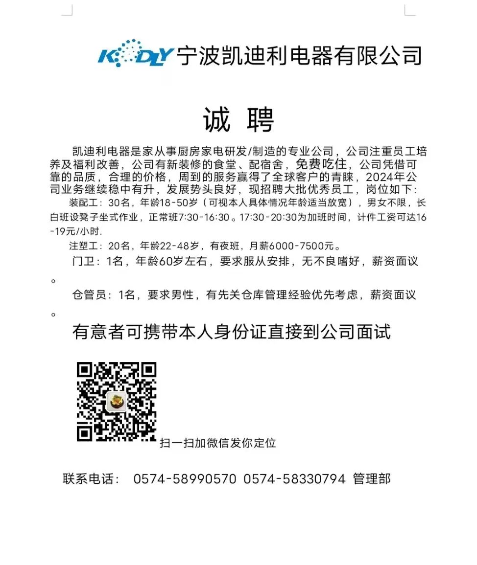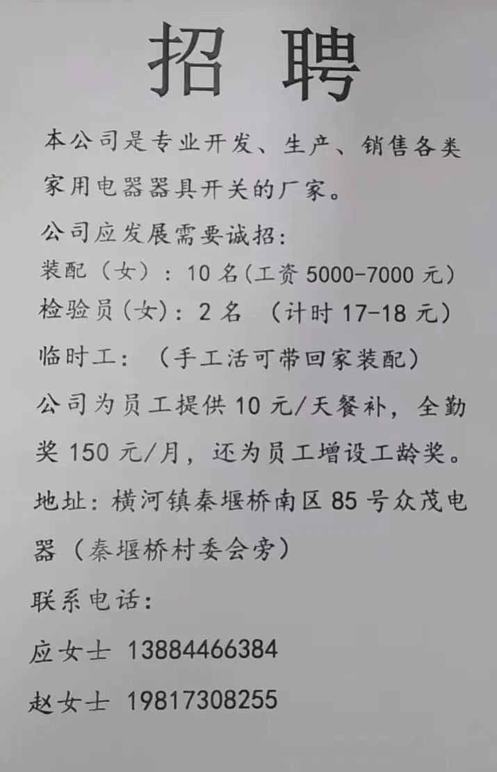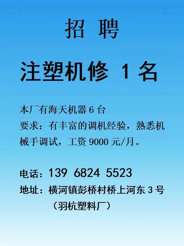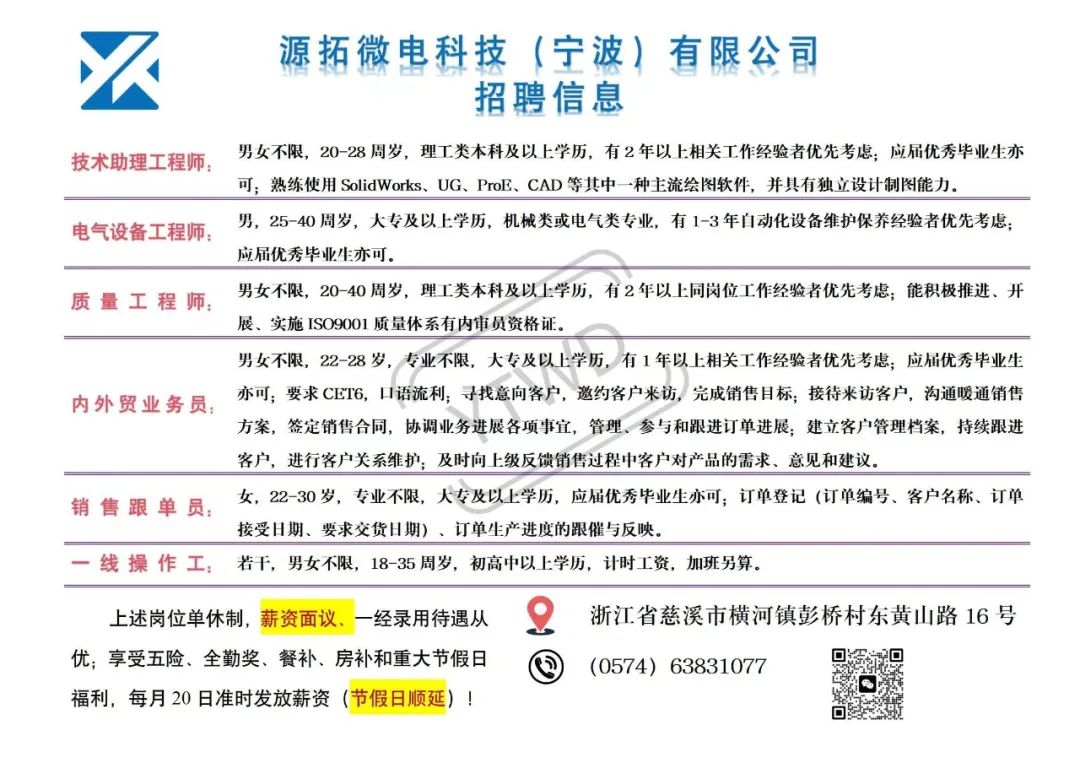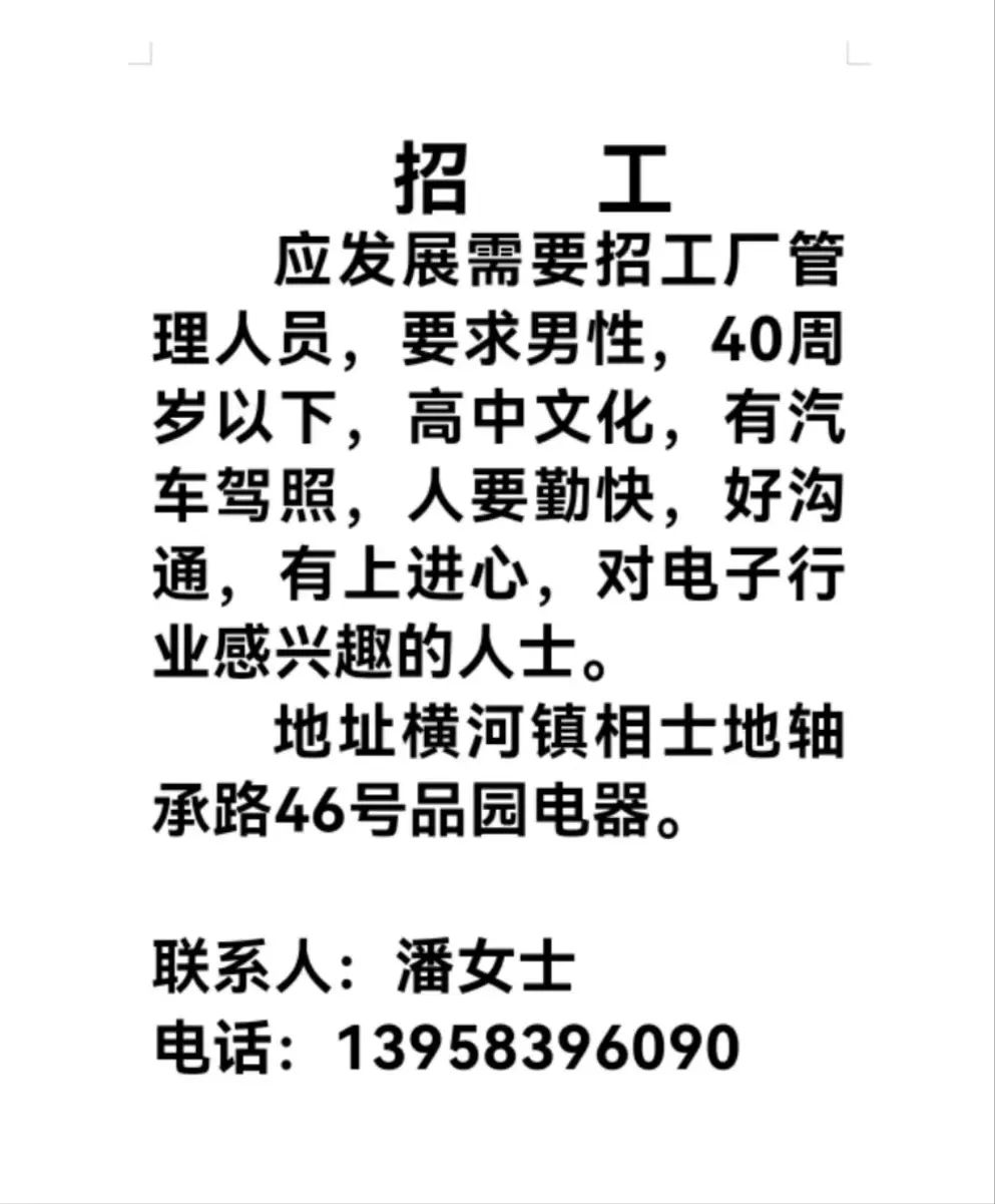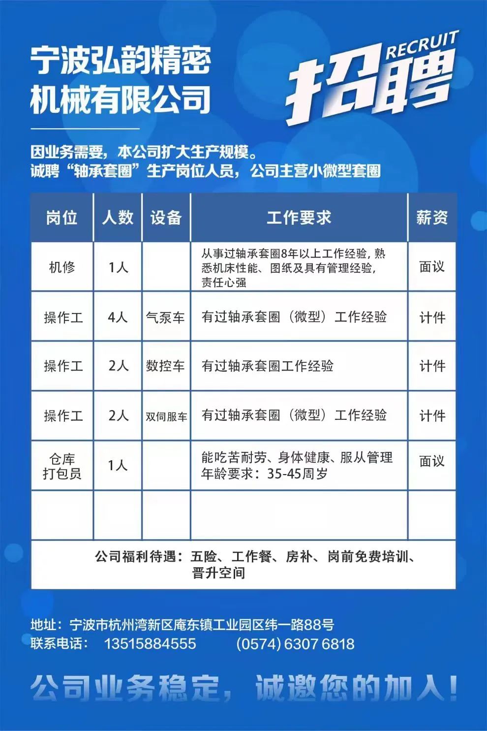 点击关注我们,一手招聘信息全掌握 加客服微信,进招聘群 慈溪超10万求职者已入群,每天推荐超100个新职位 ![]() 微生活代发招聘 招聘岗位: 黄焖鸡米饭店招帮厨阿姨一名,8:00-20:00中午休息两个小时14-16点。基本工资3800+加班费18/小时。 地址: 匡堰大道100号 电话: 13396844920 6/9 微生活代发招聘 招聘岗位: 急招自动磨四条线一名。 地址: 横河埋马 电话: 18267497566 6/9 微生活代发招聘 ![]() 6/9 微生活代发招聘 招聘岗位: 招聘无心磨粗磨100车 80车 二台熟练工一名。 地址: 横河 电话: 13567456661 6/9 微生活代发招聘 招聘岗位: 招超精熟练工一名。 地址: 横河东畈胡家山11号 电话: 13805812921 6/9 微生活代发招聘 招聘岗位: 急招轴承装瓶打包一名、计件工资。 地址: 横河镇彭桥福达厂区10楼3楼 电话: 13857805589 6/9 慈溪市景拓轴承配件厂 招聘岗位: 招粗磨,无心磨操作工一名,2台车要求熟练工。 地址: 横河石堰村兴业路红绿灯路口 电话: 13958266194 6/9 宁波宏叶轴承有限公司 ![]() 6/9 微生活代发招聘 招聘岗位: 招自动磨131,143熟练工一名。 地址: 横河相士地老环驰18号 电话: 13780016212 6/9 慈溪市亲宝电器有限公司 ![]() 6/9 微生活代发招聘 招聘岗位: 招粗磨无心磨熟练工,技术要好,有责任心,长期冷打内圈料产品管够,一台80,一台100,产品201-203。 地址: 横河彭桥工业区 电话: 13336600360 6/9 微生活代发招聘 招聘岗位: 招无心磨熟练工2名,精磨,(滚研加送货一名,)滚棒超精两名,手动测振一名,外观检验一名。 地址: 横河镇秦堰村王家畈紫林庵4号 电话: 13282216797,15968446299 6/9 微生活代发招聘 招聘岗位: 招自动车后道操作工一名,做608以下小产品,外圈有质量要求,待遇面谈。 地址: 宁波宁海 电话: 18989338070 7/2 高格轴承 招聘岗位: 招轴承特微产品,超精熟练工一名(4台嘉程,4台端面滚轮超)技术有师傅级别的工资面谈,滚研熟练工一名,质量总检或巡检一名。 地址: 慈溪市宁波杰尔电器有限公司(周至大道585支路东) 电话: 13968229982 6/17 宁波小二马轴承有限公司 招聘岗位: 招后道包装和测振熟练工一名 ,男女不限,18-40周岁,有能力的待遇高 地址: 横河彭桥万洋C区46-2 电话: 胡国良 13355935890 6/8 微生活代发招聘 招聘岗位: 招自动磨 143、 131 、201 两条线带超精一名 地址: 横河梅园 电话: 13968270401 6/8 微生活代发招聘 招聘岗位: 招数控操作工若干名,要求服从安排,有责任心!年龄40岁以下。有相关工作经验者优先 地址: 横河彭桥万洋众创城C区 电话: 19957024439 6/8 慈溪市康辉木制品厂 招聘岗位: 招普工一名。 地址: 横河镇西跃马桥49号 电话: 18170221159 6/8 微生活代发招聘 ![]() 6/8 宁波亚比科轴承有限公司 ![]() 6/8 微生活代发招聘 招聘岗位: 招自动磨,超精/机修师傅一名。 地址: 横河镇相士地村 电话: 15967885668杨经理 6/8 微生活代发招聘 招聘岗位: 招外圈气泵车后道工一名,两条线长期做202/103产量稳定技术一定要过关! 地址: 横河交警队北边100米 电话: 15990248000 6/8 微生活代发招聘 招聘岗位: 招雕刻机操机学徒一名,待遇具体面议,住横河优先。 地址: 横河模具城 电话: 18042059903 6/8 微生活代发招聘 招聘岗位: 招毛圈下料工1名,4台金马,201和608。 地址: 横河镇石堰村委会 电话: 13586643244 6/8 慈溪市横河吴勇五金配件厂 招聘岗位: 招冲床熟练女工1名 地址: 横河镇梅湖路18号 电话: 18958366339 6/8 微生活代发招聘 招聘岗位: 招工密封件检验员一名,要求女,年龄40岁以下,生手也可以 地址: 横河南站工业园区 电话: 15906574602 6/8 微生活代发招聘 招聘岗位: 招打杂工1名,轴承后道装瓶+打包 地址: 横河镇彭桥 电话: 13858366789 6/8 微生活代发招聘 招聘岗位: 包产量招聘:①.自动装配压盖工 2人 。②.201 8台 1人。③.143 1人。④.超精1人。⑤.平面 1人。⑥.无心夫妻 。 地址: 庵东镇西三村 电话: 15824262341 7/1 宁波弘韵精密机械有限公司 ![]() 6/27 微生活代发招聘 招聘岗位: 物流公司招聘接送货司机1名,需要C1驾照,有开四米二货车经验的,要求有力气,吃苦耐劳! 地址: 横河客运南站附近 电话: 13362475866 6/7 微生活代发招聘 招聘岗位: 轴承后道包装一名(女)测振一名。打杂工一名,装配工一名。三环气泵车熟练工做外圈一名(4台车),套圈检验一名,检验内圈 地址: 横河蒋家河 电话: 13968229982 6/7 微生活代发招聘 招聘岗位: 急招内圈无心磨工人一名,粗磨 ,3台1080车。要求熟练工,干活勤快。 地址: 横河梅园村竹山上段42号 电话: 13805812923 6/7 微生活代发招聘 招聘岗位: 招自动磨熟练工一名,201和143, 9台车, 要求会修车,能加班,有质量意识。 地址: 横河埋马 电话: 15575108631 6/7 竣宇轴承 招聘岗位: 招自动装配一名:要求技术非常熟练的员工。 地址: 匡堰倡隆村,匡堰实验幼儿园旁边一点 电话: 180 6927 8918 6/7 微生活代发招聘 招聘岗位: 轴承厂后道外观检验包装一名,巡检一名。 地址: 横河彭桥万洋 电话: 18958309011 6/7 假日酒店 招聘岗位: 急聘客房清洁员3名。 地址: 横河镇中兴西路29-49号 电话: 18867858477 6/7 微生活代发招聘 招聘岗位: 急招自动磨熟练工一名、143,131,201,三条线。 地址: 横河镇湖西门铁路旁 电话: 13857805589 6/7 微生活代发招聘 招聘岗位: 平面无心巡检员一名,要求有2年以上工作经验! 打杂工一名,工资面议 地址: 横河镇马堰村新环驰钢管厂后面 电话: 18968296976 6/7 宁波迈瑞机械有限公司 ![]() 6/7 微生活代发招聘 ![]() 6/7 微生活代发招
