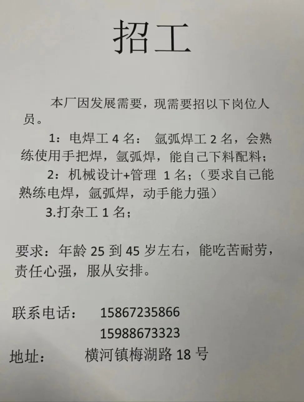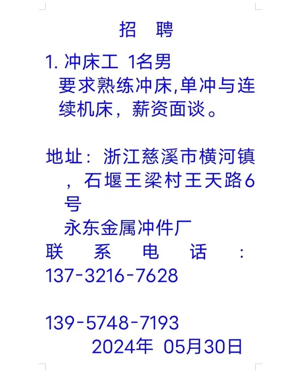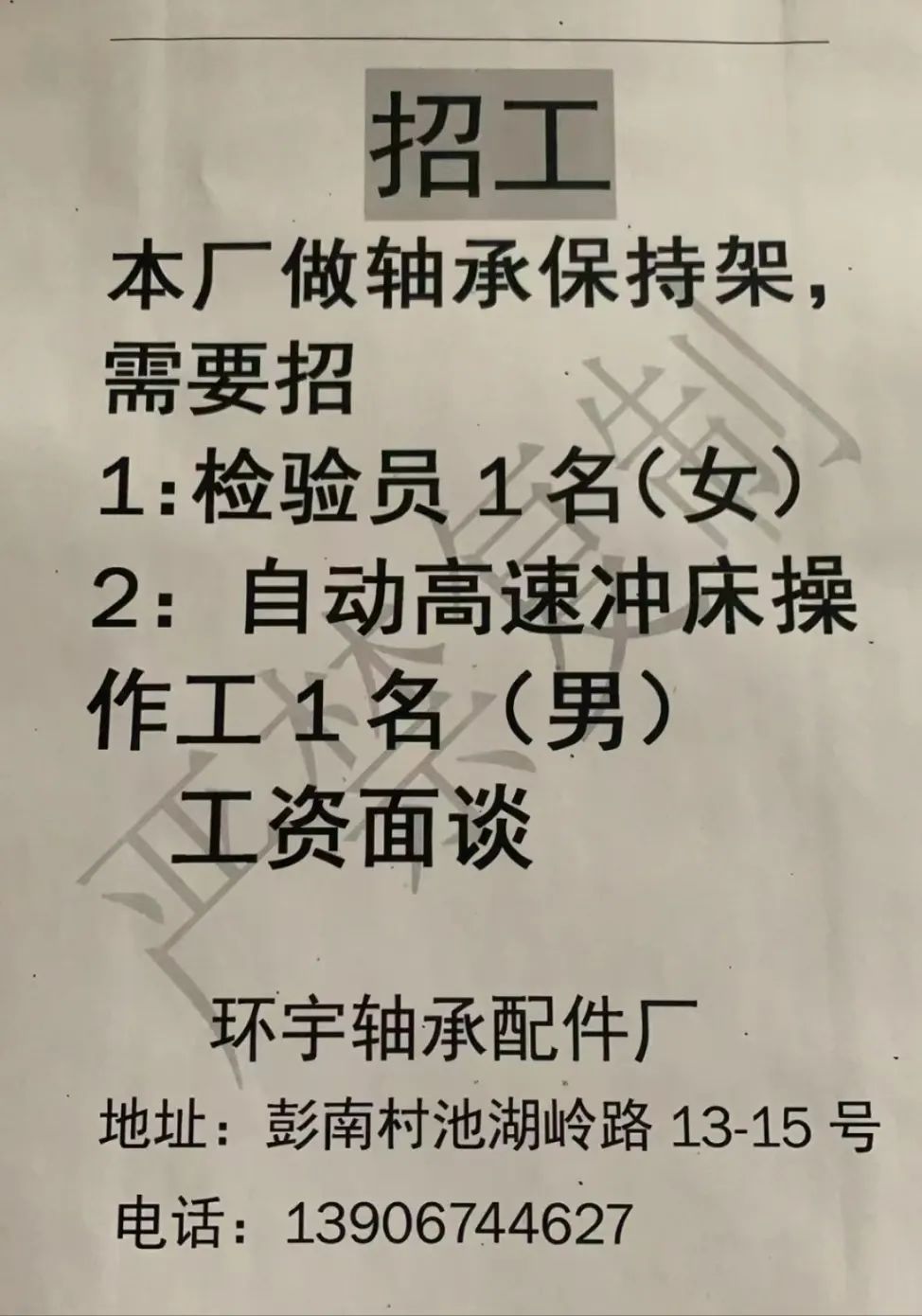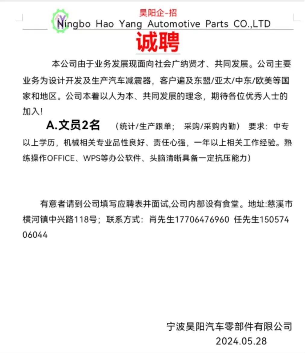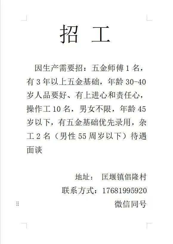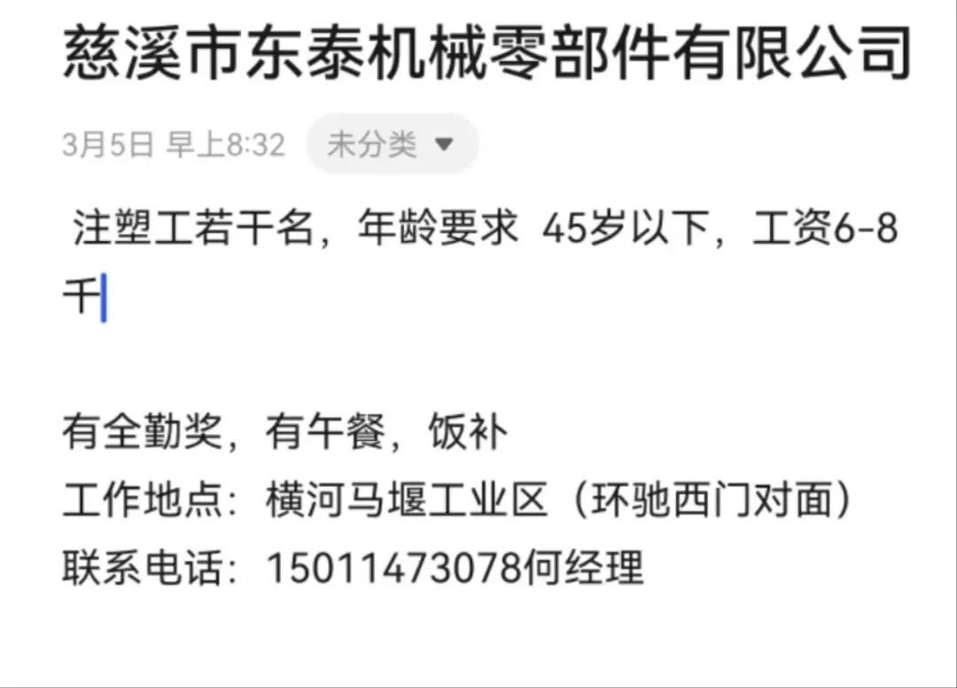 点击关注我们,一手招聘信息全掌握 加客服微信,进招聘群 慈溪超10万求职者已入群,每天推荐超100个新职位 ![]() 微生活代发招聘 招聘岗位: 黄焖鸡米饭店招帮厨阿姨一名,8:00-20:00中午休息两个小时14-16点。基本工资3800+加班费18/小时。 地址: 匡堰大道100号 电话: 13396844920 6/9 微生活代发招聘 招聘岗位: 急招自动磨四条线一名。 地址: 横河埋马 电话: 18267497566 6/9 微生活代发招聘 ![]() 6/9 微生活代发招聘 招聘岗位: 招聘无心磨粗磨100车 80车 二台熟练工一名。 地址: 横河 电话: 13567456661 6/9 微生活代发招聘 招聘岗位: 招超精熟练工一名。 地址: 横河东畈胡家山11号 电话: 13805812921 6/9 微生活代发招聘 招聘岗位: 急招轴承装瓶打包一名、计件工资。 地址: 横河镇彭桥福达厂区10楼3楼 电话: 13857805589 6/9 慈溪市景拓轴承配件厂 招聘岗位: 招粗磨,无心磨操作工一名,2台车要求熟练工。 地址: 横河石堰村兴业路红绿灯路口 电话: 13958266194 6/9 宁波宏叶轴承有限公司 ![]() 6/9 微生活代发招聘 招聘岗位: 招自动磨131,143熟练工一名。 地址: 横河相士地老环驰18号 电话: 13780016212 6/9 慈溪市亲宝电器有限公司 ![]() 6/9 微生活代发招聘 招聘岗位: 招粗磨无心磨熟练工,技术要好,有责任心,长期冷打内圈料产品管够,一台80,一台100,产品201-203。 地址: 横河彭桥工业区 电话: 13336600360 6/9 微生活代发招聘 招聘岗位: 招无心磨熟练工2名,精磨,(滚研加送货一名,)滚棒超精两名,手动测振一名,外观检验一名。 地址: 横河镇秦堰村王家畈紫林庵4号 电话: 13282216797,15968446299 6/9 微生活代发招聘 招聘岗位: 招自动车后道操作工一名,做608以下小产品,外圈有质量要求,待遇面谈。 地址: 宁波宁海 电话: 18989338070 7/2 高格轴承 招聘岗位: 招轴承特微产品,超精熟练工一名(4台嘉程,4台端面滚轮超)技术有师傅级别的工资面谈,滚研熟练工一名,质量总检或巡检一名。 地址: 慈溪市宁波杰尔电器有限公司(周至大道585支路东) 电话: 13968229982 6/17 宁波小二马轴承有限公司 招聘岗位: 招后道包装和测振熟练工一名 ,男女不限,18-40周岁,有能力的待遇高 地址: 横河彭桥万洋C区46-2 电话: 胡国良 13355935890 6/8 微生活代发招聘 招聘岗位: 招自动磨 143、 131 、201 两条线带超精一名 地址: 横河梅园 电话: 13968270401 6/8 微生活代发招聘 招聘岗位: 招数控操作工若干名,要求服从安排,有责任心!年龄40岁以下。有相关工作经验者优先 地址: 横河彭桥万洋众创城C区 电话: 19957024439 6/8 慈溪市康辉木制品厂 招聘岗位: 招普工一名。 地址: 横河镇西跃马桥49号 电话: 18170221159 6/8 微生活代发招聘 ![]() 6/8 宁波亚比科轴承有限公司 ![]() 6/8 微生活代发招聘 招聘岗位: 招自动磨,超精/机修师傅一名。 地址: 横河镇相士地村 电话: 15967885668杨经理 6/8 微生活代发招聘 招聘岗位: 招外圈气泵车后道工一名,两条线长期做202/103产量稳定技术一定要过关! 地址: 横河交警队北边100米 电话: 15990248000 6/8 微生活代发招聘 招聘岗位: 招雕刻机操机学徒一名,待遇具体面议,住横河优先。 地址: 横河模具城 电话: 18042059903 6/8 微生活代发招聘 招聘岗位: 招毛圈下料工1名,4台金马,201和608。 地址: 横河镇石堰村委会 电话: 13586643244 6/8 慈溪市横河吴勇五金配件厂 招聘岗位: 招冲床熟练女工1名 地址: 横河镇梅湖路18号 电话: 18958366339 6/8 微生活代发招聘 招聘岗位: 招工密封件检验员一名,要求女,年龄40岁以下,生手也可以 地址: 横河南站工业园区 电话: 15906574602 6/8 微生活代发招聘 招聘岗位: 招打杂工1名,轴承后道装瓶+打包 地址: 横河镇彭桥 电话: 13858366789 6/8 微生活代发招聘 招聘岗位: 包产量招聘:①.自动装配压盖工 2人 。②.201 8台 1人。③.143 1人。④.超精1人。⑤.平面 1人。⑥.无心夫妻 。 地址: 庵东镇西三村 电话: 15824262341 7/1 宁波弘韵精密机械有限公司 ![]() 6/27 微生活代发招聘 招聘岗位: 物流公司招聘接送货司机1名,需要C1驾照,有开四米二货车经验的,要求有力气,吃苦耐劳! 地址: 横河客运南站附近 电话: 13362475866 6/7 微生活代发招聘 招聘岗位: 轴承后道包装一名(女)测振一名。打杂工一名,装配工一名。三环气泵车熟练工做外圈一名(4台车),套圈检验一名,检验内圈 地址: 横河蒋家河 电话: 13968229982 6/7 微生活代发招聘 招聘岗位: 急招内圈无心磨工人一名,粗磨 ,3台1080车。要求熟练工,干活勤快。 地址: 横河梅园村竹山上段42号 电话: 13805812923 6/7 微生活代发招聘 招聘岗位: 招自动磨熟练工一名,201和143, 9台车, 要求会修车,能加班,有质量意识。 地址: 横河埋马 电话: 15575108631 6/7 竣宇轴承 招聘岗位: 招自动装配一名:要求技术非常熟练的员工。 地址: 匡堰倡隆村,匡堰实验幼儿园旁边一点 电话: 180 6927 8918 6/7 微生活代发招聘 招聘岗位: 轴承厂后道外观检验包装一名,巡检一名。 地址: 横河彭桥万洋 电话: 18958309011 6/7 假日酒店 招聘岗位: 急聘客房清洁员3名。 地址: 横河镇中兴西路29-49号 电话: 18867858477 6/7 微生活代发招聘 招聘岗位: 急招自动磨熟练工一名、143,131,201,三条线。 地址: 横河镇湖西门铁路旁 电话: 13857805589 6/7 微生活代发招聘 招聘岗位: 平面无心巡检员一名,要求有2年以上工作经验! 打杂工一名,工资面议 地址: 横河镇马堰村新环驰钢管厂后面 电话: 18968296976 6/7 宁波迈瑞机械有限公司 ![]() 6/7 微生活代发招聘 ![]() 6/7 微生活代发招