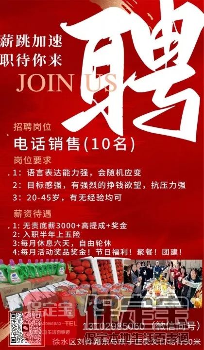 关注我们,每天7:00准时更新最新信息! 注意:应聘请注明来源(徐水招聘宝)优先录用 【招聘】 岗位详情:招聘电话营销人员(若干名) 岗位福利:[有提成][全勤奖][年终奖][旅游/团建][双休] 工作地址:保定市徐水区万达建材 联系电话:13331210891