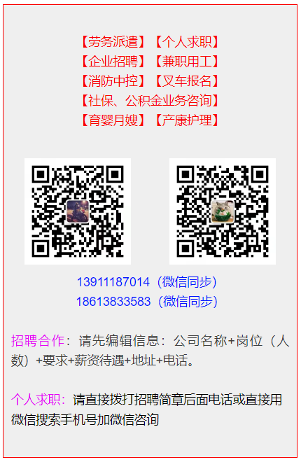 ![]() ![]() 点击蓝字 关注我们 ![]() 怀柔雁栖食品工厂 招聘岗位:成型车间(上五险) 要求:女,45岁以下,必须农业户口,干活利索,踏实稳定,人好事少,身体健康,无明显纹身。抗压能力强,玻璃心勿扰。 工作内容:站岗及坐岗,食品装袋,装盒,贴标签,手头活。 工作时间:常白班早7:00上班,8-12小时(根据产量)。 单位食堂:早5元、午6元,晚5元。 工资待遇:小组计件工资5000元左右/月。 13911187014(微信同步)