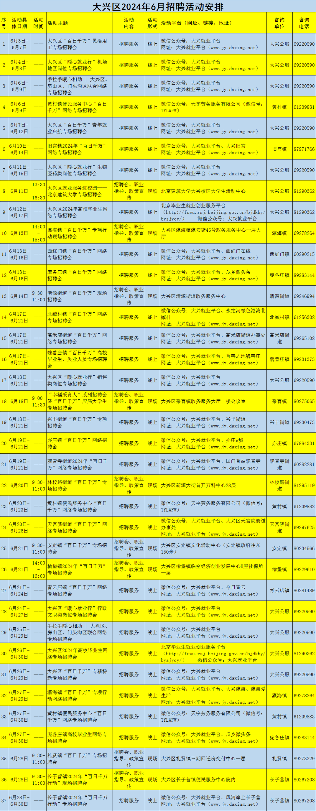 为全面贯彻落实“稳就业”工作要求,切实做好企业用工服务,促进劳动者就业,大兴区人力社保局及各镇、街道公共就业服务部门计划在2024年6月组织开展37场线上、线下招聘活动,具体活动安排如下: