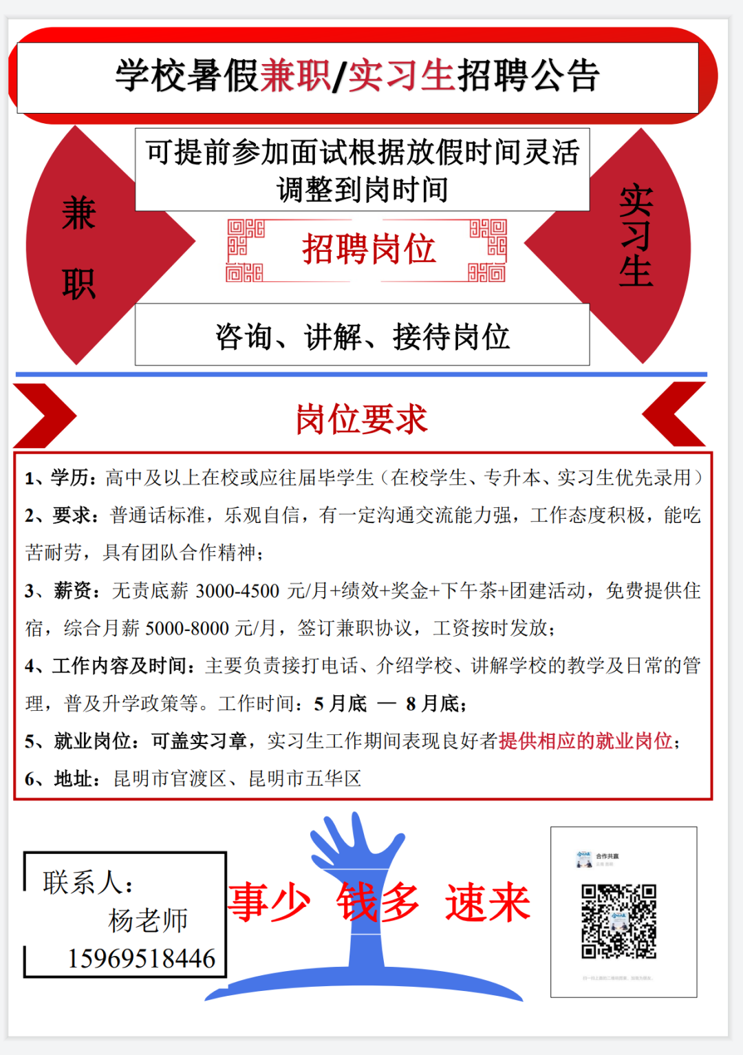 (2)要求:沟通及表达能力强,有亲和力,能听懂云南方言;有责任心,服从管理、团队合作能力强、高中及以上学历即可,2024年单招生、专升本学生优先录用,男女不限有兼职经验者优先;
