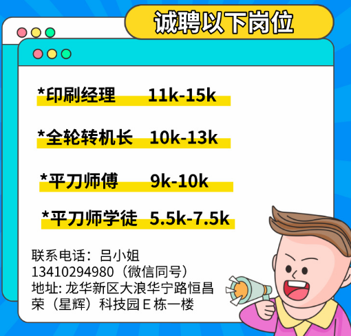 =================== 广东万德新材料有限公司 1、圆刀机长:5名 综合薪资:9.5-12k 要求:6年以上独立开机调模经验,(不包括学徒期)能熟悉四面拼接,口子胶,多层工艺,能快速处理生产中的异常,操作5-6把刀以上的产品工艺 2、普工 :10名 综合薪资:5-6.5K 17-35岁之间(视力良好,能配合加班) 以上岗位:长白班,包吃包住 地址:东莞市黄江镇 联系电话:13423440903(微信同号) =================== 现因业务发展需要,诚聘:平刀师傅 两班倒需要上夜班 要求:四年以上的平刀模切经验,会追色模切,熟练操作飞新达设备,产品都是单刀(半全断)单机连线,动手能力强,有责任心,品质意识强,服从管理! 薪资待遇综合:8500-10000元 工资准时发放 以上岗位26天10.5小时制,夜班津贴20元/晚 ,超出时间加班费统一25元/小时,包吃不包住,试用期过后300全勤 工作地点:东莞黄江长龙 欢迎推荐或自荐,半桶水务扰 谢谢! 电话:13662553761 叶先生 =================== 招聘: ①组合线机长 白夜班,熟手,身体健康,无不良嗜好 综合薪资8000-9500元。 ②印刷工艺工程师 不干胶标签类产品,经验丰富 综合薪资8000-11000元。 提供食宿,五险一金,法定节假日,节日福利 地址:东莞东城上桥 联系电话:13712154314 =================== 招聘平刀师傅:4名 长白班,26天制10小时,长白班,7.5K-8.5K,包吃住,买社保 要求:有3年以上开机工作经验,熟悉平刀工艺、熟练地操作平刀机,会调机,能处理生产中的常见异常 另招:平刀临时工多名 工作地点:惠州博罗县 联系电话:刘女士 13714949274(微信同步) 0769-89399135 =================== 【捷邦招聘】周末双休,提供食宿,入职购买五险一金。 ①CQE品质工程师,要求英语读写熟练,工作地点东莞常平 ②PMC经理,要求越南语熟练,工作地点越南。 【联系人】叶小姐13642871667(微信同号) =================== 志海精密招聘: 1、模切师傅2人(生产部):26天10小时,薪资7-9K,超出工时算加班,长白班; 2、模切师傅1人(工程部):26天10小时,薪资7-9K,超出工时算加班,白晚班;3、IPQC 1人:底薪+加班费+岗补,会用2.5次元,会编程优先,综合薪资6-7.5K 4、PMC1人:5.5天月薪制,能适当加班,有相关工作经验2年以上,薪资6-8K; 包住,免费停车,有餐补,不定期团建,生日会等,环境好!! 地址:光明白花洞志海工业园1楼前台 联系人:19925192478杨小姐(微信同号) =================== 招聘QC 工资8K 保底 地址深圳松岗 包吃住 电话 13715338715 苏总 =================== 招聘平刀模切师傅1名,工资高。有意找工作的,或者有朋友想换工作的, 微信或者电话联系17798651225 =================== 招聘 平刀技术员:3名(7-10K),26天10H 东莞塘厦,26天10H,加班按劳动法,福利多多! 联系:13412835550谷主管 =================== 招聘 现招多名跟单文员,有经验者优先 薪资待遇面议 地址:东莞市常平镇土塘村港建路常平云谷 ☎️18929226008微信同号 =================== 因扩大生产增加设备现诚聘平刀师傅一名,师傅底薪6-6.5,综合工资8.5-9K.产品单一只做扩散加背胶,会套位就行。另招手工组长一名,底薪4-5K.综合工资7-8K.22天8H制加班按深圳劳动法,包住不包吃,五险一金加年终奖。长白班。 电话18475463583微信同号。 地址保安福永长松科技有限公司 =================== 因生产经营需要,招聘圆刀师傅三名,LED线路板产品。保底+计件,工资10000-13000。12-14工位,都是五把刀的产品。半桶水也可。容易上手。尺寸要求不高。28天10小时。白夜班 工作地址:江门市江海区科苑西路20号3栋2楼雅民电子 联系:15888447213(微信同步) =================== 惠州市领尚电子科技有限公司 招聘: 1、平刀师傅4人,年龄18-40岁,长白班,综合薪资7.5k-8.5k 另:招聘平刀临时工 独立工业园,宿舍配有空调、热水器,包食宿,缴纳五险。 享受带薪年假,交通便利,距厂区一公里有天虹商超,福利待遇优厚。 工作地点:广东省惠州市博罗县罗阳镇浪头村蓄能路97号 联系电话:李女士18129622972(微信同步) 18129622971(微信同步) =================== 五同电子招聘: 模切套冲技术员几名,要求:学历初中(含)已上、3-5年模切经验、40岁以下。 工资待遇:五天八小时6500元/月、加班另算、试用期一个月、包工作餐、五险一金。 地址:昆山市周市镇明达路100号。 电话:15726321996 =================== 招:平刀师傅2名, 工作地点:昆山,正义,(有宿舍工资面议) 电话18761986731微信同号 =================== 招圆刀师傅: 由于公司业务增多现需诚聘圆刀师傅数名。薪资面议,有意者可以私信。电话18739502008 地址:江苏省镇江市,通港路130号 =================== 重庆凯成科技诚聘: 1、圆刀机长 3名,能熟练操作哈德胜、倍川,熟悉模切产品的工艺流程,熟练操作16工位及以上的机器,3年以上圆刀机操作经验,负责按生产单对应工艺文件的正确操作机台,待遇8-10k; 入职一个月买五险一金,另有宿舍,餐补,全勤奖、夜班补助、生日礼品、年休、节日福利等;技术工可以申请公租房 联系人:黄女士 18983106080(微信同号)、陈女士 17347808255(微信同号) 座 机:02341557050-8026 工作地址:重庆市璧山区聚金大道58号 =================== 欢迎推荐给朋友,请大家批评指正! Q:有朋友在后台反馈:找不到本公众号推送信息! A:建议您经常“点赞”和“在看”,或者“分享给朋友”,公众号系统会根据大数据计算结果(即您所关心的内容),优先推荐招聘信息给您,并放在列表靠前位置(您在找工作期间甚至可以设置置顶),方便您查找。 【声明】 本公众号为非营利性质,纯属兴趣与公益性质。 初衷是免