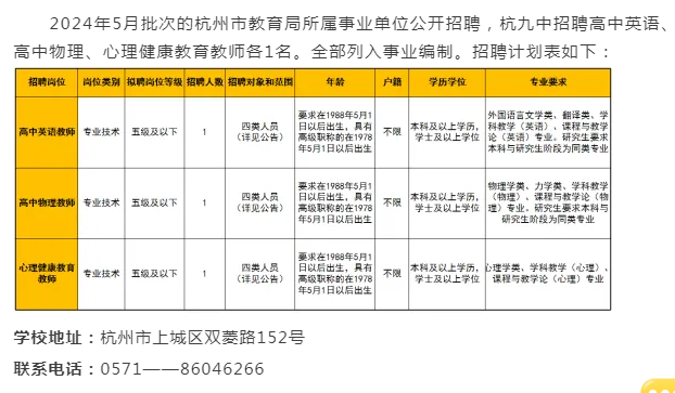 7.具备招聘岗位要求的其他条件,详见《杭州市教育同所属事业单位2024年5月批次公开招聘计划表》(三)注意事项: