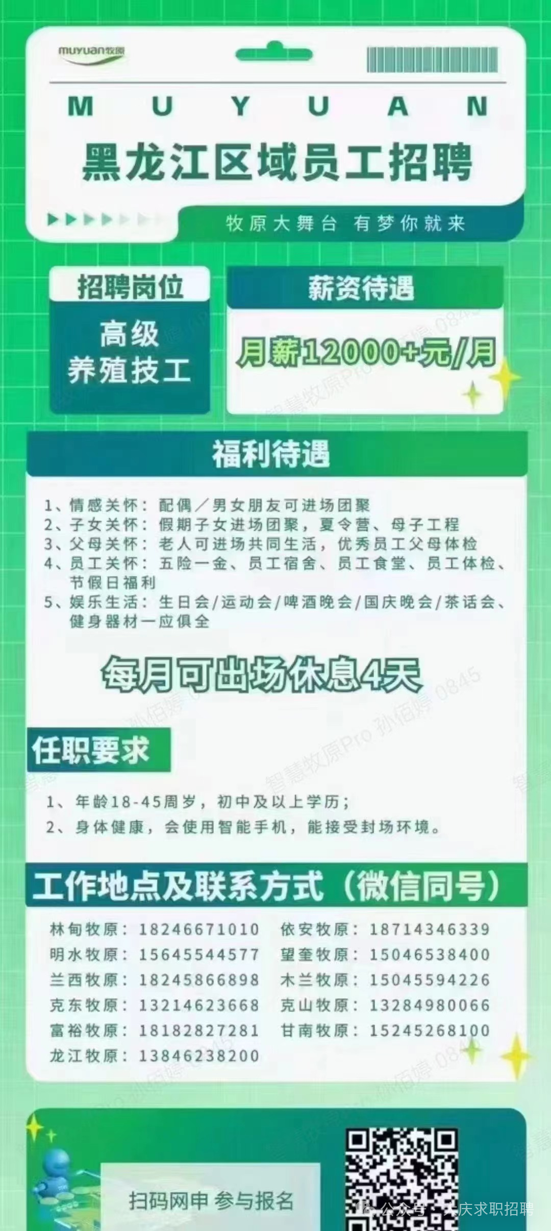 阅读本文前,请您先点击上面的蓝色字体“大庆求职招聘”,再点击“关注”,这样您就可以每天观看到你所需要的,完全免费订阅,请放心关注。 大庆求职招聘 免责声明{重要提示} 网络求职有风险,真假自辩,请您谨慎选择! 欢迎转发 01 招聘成手快递员 工作地点:乙烯 工资待遇:计提,上不封顶 联系电话:15776952444 另招兼职快递员,时间自由。 02 招聘 岗位要求: 1.要求:形象好气质佳; 2.性格开朗,有团队合作意识,有责任心,沟通能力强; 3.有服装经验者优先录取; 相关待遇: 4.底薪2100(包含岗位津贴等)。阶梯式提成2%--4%不等。额外➕六险(五险➕商险); 5.班次:上下午倒班,周休一天。 地址:大庆让胡路万达小POLO童装店三楼 6.法定节假日三薪。 联系方式:15846919874 03 东城领秀面馆招分面工一名,底薪+满勤+两天带薪休+提成 电话:18245799613 04 工作地点:大庆市萨尔图经六街华莱士 1.招聘岗位:后厨 3.招聘人数:2人 4.薪资待遇:12.5元/1小时 5.工作时间:早八点到下午四点 招聘电话:15846075105微信同号 05 烧烤店招聘烤工 会烤就行。老板人好 事少。联系电话15845949922 地址让胡路区乘风新玛特后身 麻辣烫店招聘煮面工 早九点到晚九点。联系电话15845949922 地址让胡路区乘风新玛特后身 06 代友招聘 MAMBA|曼巴男装 招聘 工作时间:8:30-17:30 工作地点:程宇购物广场 薪资待遇:底薪3000➕提成(有经验优先)月休3天 招聘电话:13104590250 07 让胡路电业局群房老鞑子烤羊腿招聘 服务员3800+200满勤+提成+4个半天休息 服务生3800+200满勤+提成+4个半天休息, 撤台阿姨3500+200满勤 小时工15元一小时晚上4点到9点或着5点到10点都可以。 勤杂工3500满勤200。 电话18545938128 08 富粞粮仓全国 3000 家连锁店 长期招聘: 店长 底薪+满勤+奖金 综合工资8000+ 店员 底薪 +满勤+奖金 综合工资5000+ 工作地点: 黑龙江省大庆市 新村 让胡路 乘风庄 创业城 16区 龙凤 远望 招聘要求: 初中以上学历,年龄 50 岁以下 有过销售经验,沟通能力强,有上进心,有责任心优先录用,专业培训,晋升空间大。 每周日休息每月 4 天假 上班时间好可以经管孩子上下学 每年公费旅游 (微信同步) 联系电话:高经理13766790989 李经理13766776187 09 大庆医科大学招长工1名,活好干,管吃管住,工资4000元,200全勤奖,电话18204661602,微信同步。 10 招聘供水队管线安装工,每天3到七小时,供吃供住,交五险(保险全部由单位承担,个人不扣钱)工资2900,年龄19-59周岁, 有意者联系电话15846920188 18249572789 钻井二公司国企招:装卸工2400,交五险,保险由单位承担,上午七点半到下午三点,(中午11点到1点半休息),周天休息,地址:四厂张铁匠附近,电话13836956044 11 新村九区 急聘长期女微机员一名,要求语言表达能力强,有责任心,工作细心,35岁以下,工作轻松不累,包吃住,工资面议, 18814610999 12