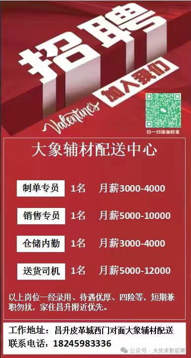 40 诚 聘 垦荒人食品连锁超市诚聘 👩💼👨💼市场推广专员,负责商品推广及维护客户,全职岗位。 1.踏实肯干,有上进心。 2.年龄22-45周岁,男女不限。 3.无责底薪3000元,月薪5000+。 4.缴纳五险,年节福利优厚。 联系电话:13936717917(微信同号) 工作地址:新村广源市场,让区阳光嘉城,湖滨教师花园、齐市铁锋区,就近安排。 41 大型垃圾清运公司:招聘垃圾清运工数人,身体健康,60岁以下男士,工作地点在大庆高新区,东风新村清运生活垃圾,工作时间凌晨一点左右,外地供吃住,工资4500元,端午、中秋、过年发福利待遇(干满一年满勤奖多发一个月工资),有需要这份工作的请联系:卢经理 联系电话:18945992927 0459--8998849 本广告长期有效 42 🌹找做饭阿姨 要求有健康证 认真负责 3000/月 🌹一天两顿 午饭和晚饭 闲暇打扫卫生 轻松不累 🌹18504599998 43 大庆拓锐网络科技有限公司招聘薪资6000+ 岗位: 社区网络服务派单调度员 要求:📢📢📢 年满20周岁-35周岁之间,高中以上学历,无不良嗜好,有无经验均可。 有过电销经验者优先,普通话标准,语言逻辑清晰,沟通表达能力好。 工作内容:📢📢📢 负责接听客户电话,记录客户需求,寻找相对应店铺,解决客户需求。 福利待遇:💰工资日结,200-上不封顶。 工作时间:⌚早9点-晚5点 工作地址:龙凤区服务外包园B6 联系电话:18249578255(微信同步) 晚8点以后勿扰谢谢! 44 大商长春堂药店连锁红岗店招聘 营业员 任职资格: 1、具有较强的沟通能力及服务意识 2、有相关经验者优先 福利待遇: 底薪+提成+带薪年假+五险 工作地点:红岗大商超市裙房长春堂药店 ☎☎联系电话:18845907951 45
