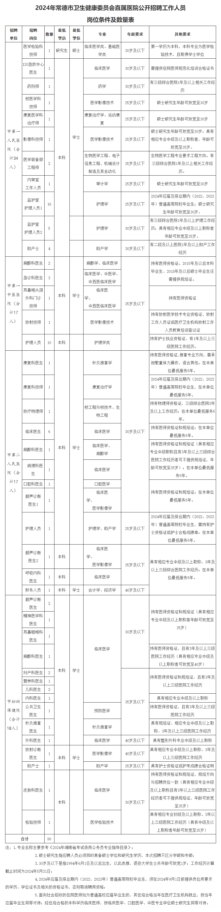 因工作需要,常德市卫生健康委员会(以下简称市卫健委)直属医院拟向社会公开招聘工作人员86名,现将有关事项公告如下: 一、招聘原则 按照“任人唯贤、德才兼备”的用人标准,坚持“公开、公平、公正、竞争、择优”的原则,采取考试和考核相结合的方式进行。 二、招聘条件 (一)基本条件 1.具有中华人民共和国国籍; 2.遵守中华人民共和国宪法和法律; 3.具有良好的品行和职业道德; 4.具备岗位所需的专业或技能条件; 5.适应岗位要求的身体条件; 6.岗位所需要的其他条件。 (二)具体条件 具体条件详见《2024年常德市卫生健康委员会直属医院公开招聘工作人员岗位条件及数量表》(附件) 1.年龄要求:30岁及以下是指1994年6月1日及以后出生,以此类推,退役大学生士兵年龄可放宽1岁; 2.专业要求:以报考岗位要求的最低学历所学专业为准; 3.其他条件:2024年应届及择业期内(2022、2023年)普通高等院校毕业生,须在2024年9月1日前提供岗位所要求的学历、学位证书及相关的资格证书,否则取消聘用资格;工作经历计算截止时间为2024年5月31日;面向社会招收的住院医师如为普通高校应届毕业生的,其住培合格当年在医疗卫生机构就业,按当年应届毕业生同等对待;经住培合格的本科学历临床医师,按临床医学、口腔医学、中医专业学位硕士研究生同等对待。 (三)应聘人员有下列情形之一的,不得报名: 1、曾因犯罪受过刑事处罚的人员或曾被开除公职的人员; 2.尚未解除党纪、政纪处分或正在接受纪律审查的人员; 3.涉嫌违法犯罪正在接受司法调查尚未作出结论的人员; 4.在各级各类事业单位公开招聘中因违反《事业单位公开招聘违纪违规行为处理规定》被记入事业单位公开招聘应聘人员诚信档案库,且记录期限未满的人员; 5.各类招聘录用后有服务期要求且服务期未满的人员; 6.现役军人; 7.法律法规及政策规定不得聘用为事业单位工作人员的其他情形人员。 三、招聘程序和办法 本次招聘不收取考生任何费用。 (一)报名时间及程序 1.报名时间:2024年6月11日8:00-6月13日17:00 2.报名程序:报考人员登录常德市卫生健康委员会网站(wj***.cn[点击查看]),点击“市直医院公开招聘专栏”,通过“2024年常德市卫生健康委员会直属医院公开招聘工作人员报名”链接进入报名界面,如实填写《湖南省常德市事业单位公开招聘人员报名表》相关信息、并上传符合规格的近期免冠照片、打印报名表。 每人只能选择一个岗位进行报名,多填报无效。网上报名填报信息应真实,在招聘任何一个环节发现报考者不符合报考条件或弄虚作假的,一经核实,取消考试成绩及聘用资格,由此造成的一切损失由报考者本人自行承担。 特别提醒:网上报名后,报考人员须及时查询招聘单位的资格审查结果(一般半个工作日内),资格审查合格人员不得再更改个人报名信息。未审查的,请及时与用人单位联系。 (二)笔试 1.开考岗位。按照资格初审合格人数与招聘岗位计划数不低于3:1的比例确定,达不到开考比例的岗位,经市人社局批准,降低开考比例为2:1,低于2:1的岗位相应核减或取消招聘岗位计划。 2.报考人员使用本人姓名、身份证号登陆市卫健委网站自行下载打印准考证,准考证打印时间为6月26日-28日。 3.考试时间:2024年6月29日,具体时间、地点见《笔试准考证》。笔试成绩及时在市卫健委网站公示。 4.考试内容为相应岗位专业知识。 (三)现场资格审查 1.时间:2024年7月6日(8:00-17:30) 2.地点:常德市卫生健康委员会(常德柳叶大道2119号)一楼大厅 3.要求:根据笔试成绩从高分到低分,按招聘岗位计划数1:3的比例确定现场资格复审对象(降低开考比例的岗位按1:2的比例确定现场资格复审对象),笔试成绩相同的,均参加现场资格复审。 现场资格审查时,报考人员须携带以下资料:①《公开招聘报名表》(报名系统自行下载打印);②《笔试准考证》;③本人有效身份证;④学历、学位证(2024年应届毕业生提供《大学生就业推荐表》)以及有效期内的教育部学历证书电子注册备案表(2024年应届毕业生提供教育部学籍在线验证报告),留学人员应提供教育部中国留学服务中心出具的境外学历、学位和专业证书;⑤报考岗位所要求的其他相关资料;以上资料原件及复印件各一份。在职人员必须提供现工作单位同意报考证明。 报考人员所提供的资料必须真实有效,如有弄虚作假或不符合报名条件者,一经发现,随时取消资格。不按时参加现场资格审查者视为放弃资格审查。资格审查合格人员名单在市卫健委网站公示。 (四)面试 1.面试对象:现场资格审查合格人员。 2.面试时间:具体时间、地点及要求以《面试公告》为准。 3.面试方式:护理岗位为护理技能操作考核,其他岗位为结构化面试。 4.成绩合成:综合成绩=笔试成绩×50%+面试成绩×50% 综合成绩按四舍五入法保留小数点后两位。综合成绩相同的,按笔试成绩从高分到低分排名。 未形成竞争的岗位,面试成绩不得低于60分。分数相同的岗位,以不去掉最高分、最低分计算。 (五)体检 根据招聘岗位计划数等额确定体检对象。体检项目和标准按照《公务员录用体检通用标准(试行)》、湘禁毒委〔2020〕26号等执行,并进行毛发检测。 (六)考察 体检合格人员由用人单位和市卫健委对其思想政治表现、道德品质、业务能力、工作实绩、应聘资格条件等方面的情况进行考察,并对报名者资格条件