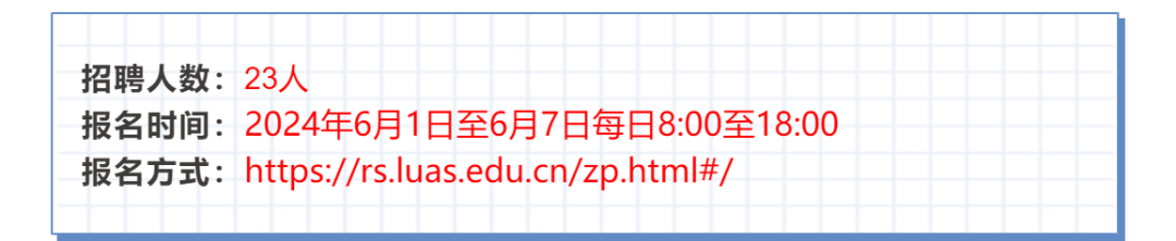 三、其他事项 (一)本次招聘考试考务工作由学校公开招聘工作领导小组具体组织实施。 (二)本次招聘不指定考试教材,不划定考试范围,不举办、也不委托任何机构举办考试辅导培训。 (三)应聘人员不得报考聘用后即构成回避关系的招聘岗位,即与本人有夫妻关系、直系血亲关系、三代以内旁系血亲关系、近姻亲关系的人员担任领导成员的用人单位的岗位,以及有其他影响情形的岗位。具体回避情形请查阅《事业单位人事管理回避规定》。 (四)2024年7月31日前未取得毕业证、学位证者不予审批聘用。毕业证信息在《中国高等教育学生信息网(学信网)》无法查询及在“鼎力信”等网站查证有失信行为的报考人员,不予审批聘用。 (五)资格审核、笔试、面试、体检等通知将通过学校人事处官网公布、电话通知等方式告知,请随时关注,并保持通讯畅通,若本人不及时阅读相关信息,造成后果,责任自负。 (六)本次招聘全程接受学校纪检监察机关和社会各界监督。 咨询电话:0931-8237813 监督电话:0931-8685184 附件1:兰州文理学院2024年公开招聘事业编制工作人员岗位列表.xls 兰州文理学院 2024年5月31日