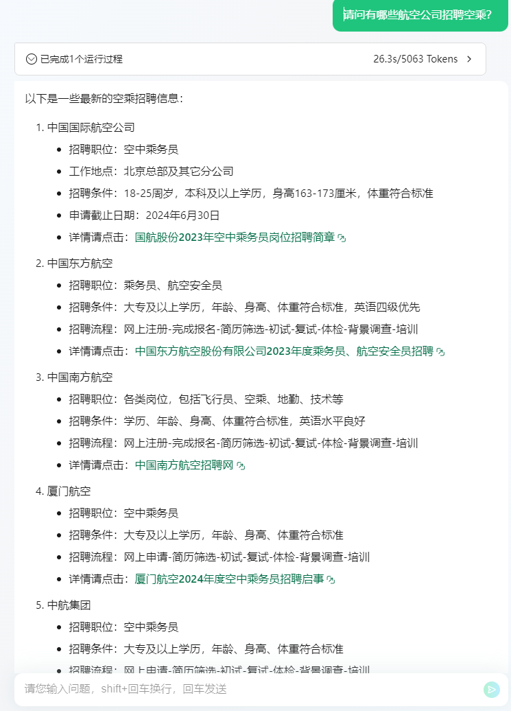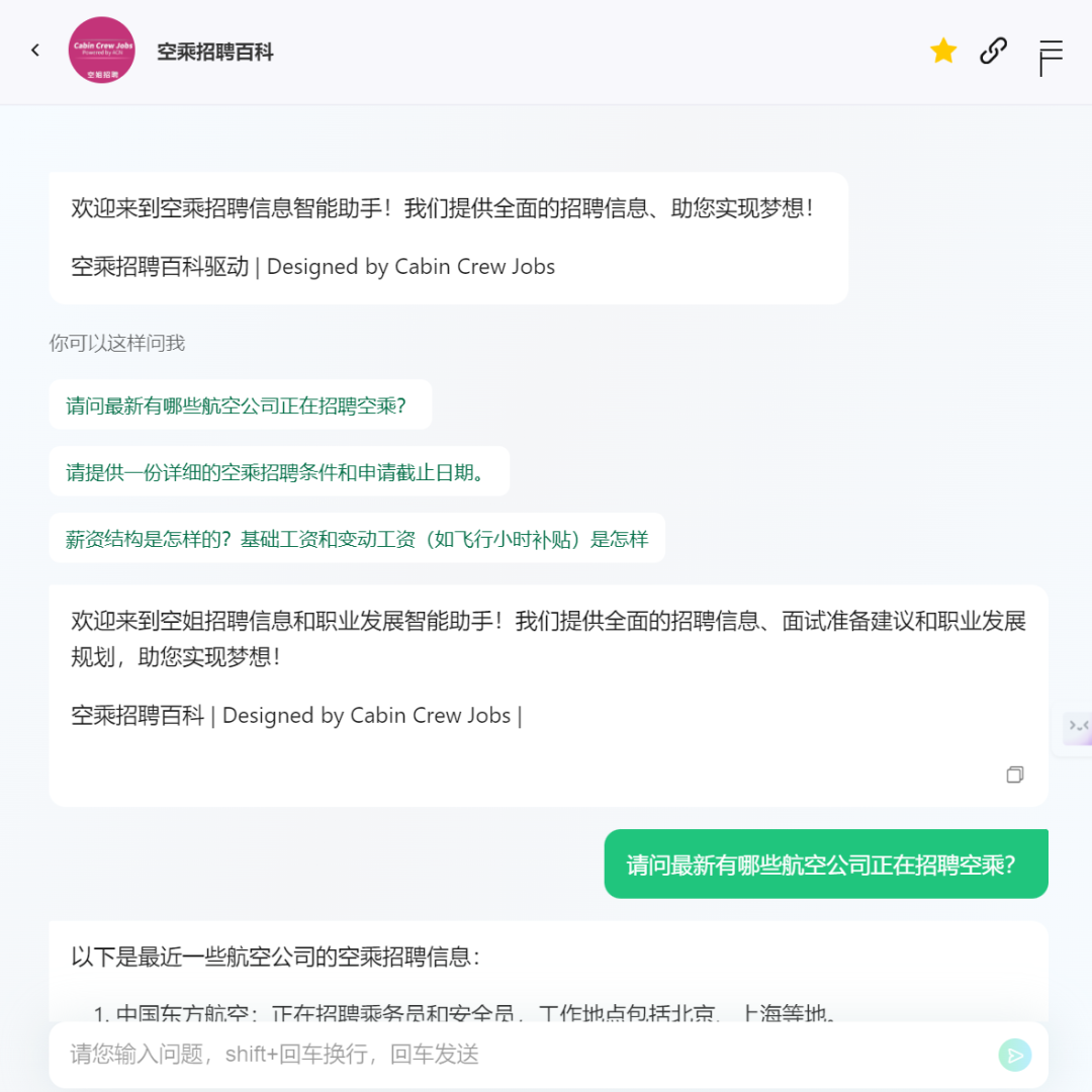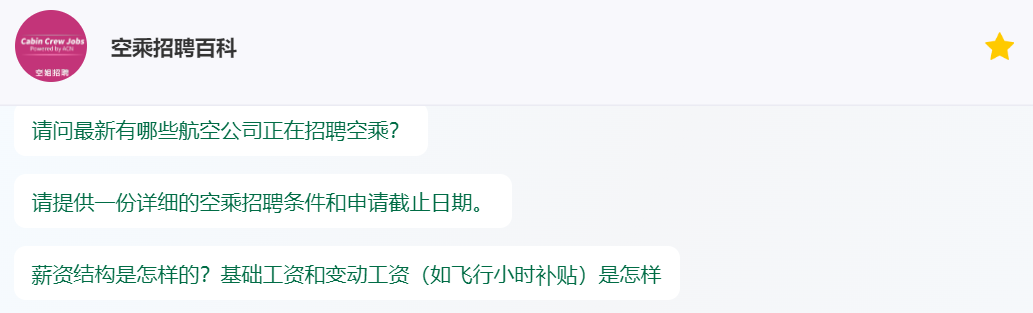https://yuanqi.tencent.com/agent/TfmEGx6yamUR?from=share AI智能空乘招聘助手简介AI您的智能空乘招聘助手旨在为寻求航空行业就业机会的求职者提供最新的空乘招聘信息和面试准备建议。通过实时更新的数据和定制化的面试策略,帮助您有效提高应聘成功率。 用户指南功能与技能