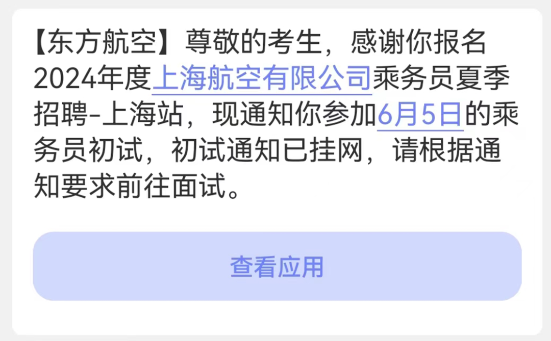 上海航空有限公司2024年夏季乘务员、航空安全员招聘通知上海航空有限公司将于2024年6月5日至6月8日开展上海站乘务员、航空安全员夏季招聘。目前简历正在筛选中,通过简历筛选的应聘者将逐步收到通知。我们诚邀符合应聘条件的应聘者(东航招聘网个人中心“简历筛选”环节应聘状态为“通过”)参加现场初试,具体安排如下: 一、初试时间及初试场次安排1. 乘务员初试入场时间(为了减少排队等候时间,请应聘者严格按照报名号对应时间到场。)