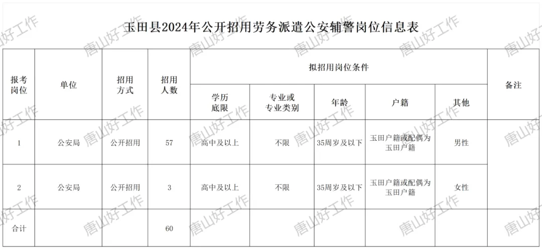 ▲▲▲ 唐山市玉田县公开招用60名劳务派遣公安辅警公告根据工作需要,经研究决定,拟面向社会公开招用劳务派遣公安辅警60人,具体公告如下: 一、招用人数。 点击上方名片关注,单独查看唐山市招聘信息 二、招用条件(具体情况详见附件1) 1.学历要求:高中及以上学历, 2.年龄要求:35周岁及以下(1988年6月10日以后出生,以身份证为准);查看更多招聘信息 3.户籍要求:玉田户籍或配偶为玉田户籍; 4.其他要求: (1)具有良好的职业道德和敬业精神,遵纪守法,品行端正。 (2)身心健康,五官端正,无传染病,无抑郁史及精神心理疾病。 (3)服从分配。 (4)岗位要求的证书须在2024年6月10日前取得。 5.有下列情形之一者,不得报名: (1)正在接受司法或纪检监察机关立案调查的; (2)受过司法机关刑事处罚的; (3)曾经被开除的公职人员; (4)2024年8月1日及以后毕业的高等院校普通类在读学生; (5)现役军人; (6)具有法律规定不得招用的其他情形的人员。 三、招用方式 本次公开招用采取“统一招用”方式,委托有资质的第三方考试机构组织实施。 考试采取笔试的方式进行,总成绩=笔试成绩。 四、报名办法 2024年6月3日通过“唐山人才网”、微信公众号“玉田人才”面向社会公开发布招用信息,时间2024年6月3日至6月9日。 本次招用采取网上报名和资格初审,不接收其他方式报名,每人限报考一个岗位。查看更多招聘信息 (一)网上报名方式和时间 报名网址:唐山人才网:http://www.tsrcw.com公开招考栏目 报名时间:2024年6月10日9:00至6月14日17:00 交费时间:2024年6月10日9:00至6月15日17:00 准考证打印时间:2024年6月19日至6月20日 (二)网上报名的基本程序 1.考生报名前,须完全了解本次招用政策和应聘岗位条件,认真阅读网上《招用公告》,按照规定步骤进行具体操作。 2.网上报名实行严格的自律机制,必须承诺履行《诚信承诺书》,对提交审核的报名信息真实性负责,在公开招用的任一环节中(包括试用期),凡发现网上填报的信息与实际情况不一致的、不符合报考条件的,取消应聘资格。 3.网上报名须用有效的二代《居民身份证》申请“报名号”,并预选应聘岗位,获取“报名号”和“初始密码”后才能登录报名系统,进行填报信息和提交审核,报名号是登录报名系统的唯一标识,密码可修改,二者均务必牢记并保管好。 4.按照要求规范填写或选择表项,认真核对《岗位信息表》条件要求,务必逐条如实填写符合条件相关内容。上传的考生电子照片要符合要求,否则将被报名系统自动拒绝。照片要求:近期、正面、免冠彩色证件照,建议像素240(宽)*320(高),jpg格式。报考信息通过审核后才能进行交费操作,交费成功即完成报名。 5.报名人员“提交审核”后信息将被锁定,在未反馈审核结果前不能修改。一般情况下,审核员24小时内会在报名系统上回复审核结果。“审核未过”的,可根据提示的未过原因,修改信息或改报岗位并重新提交审核;“审核通过”的,不能再修改,将进入交费程序。请报名人员尽量不要选择最后时刻报名,以免因报考条件不符或填报信息不完整等原因“审核未过”而错失改报机会。查看更多招聘信息 6.请牢记报名和交费截止时间、打印准考证、笔试、成绩查询、资格复审、体检等重要时间信息,并及时关注相关要求。凡是在规定时间未完成相关操作的,将被视为自动放弃。同时,报名和考试期间务必保管好个人的证件和信息,因个人原因造成丢失、被他人盗用和信息被恶意篡改而影响报名和考试的,责任自负。 7.网上交费。考生需在网上交纳报名考务费每人100元人民币。报名缴费只能通过网上支付,请考生及时开通网上支付功能,未按期交费者视为自动放弃。 (三)开考比例 岗位报考人数与招用人数的比例不低于2:1,对达不到比例的岗位,核减或取消该岗位的招用计划,同时通知考生改报其它岗位或放弃报考。 五、考试内容及流程。 1.笔试。笔试时间、地点以《笔试准考证》为准。请考生及时查阅,按时打印《笔试准考证》。考生须按照《笔试准考证》的相关要求参加笔试。 笔试采取闭卷考试的方式进行,考试内容为公共基础知识和事业单位职业能力测验,时间为120分钟,满分100分。 由县公开招用工作领导小组办公室根据笔试成绩总体情况划定笔试最低控制分数线,对在最低控制分数线以上的考生,由人社部门按照进入资格复审人数与招用人数1:1的比例,从高分到低分确定资格复审人选(末位并列一并进入资格复审)。 2.资格复审。资格复审时,考生应按照招用岗位资格条件要求提供本人身份证、准考证、户口本、结婚证、毕业证等相关材料的原件和复印件到指定地点进行复审,逾期不到视为自动放弃。经复审合格进入考察体检等程序。未通过资格复审的,取消资格,比例不足的递补本岗位笔试成绩下一名考生进入资格复审。复审时间和地点详见微信公众号“玉田人才”通知。查看更多招聘信息 六、考察、体检、公示、招用。 1.考察。依据招用名额按1:1的比例,按考试总成绩从高到低确定参加考察人员名单。比例内末位考生总成绩相同者,按以下顺序确定进入考察考生:烈士子女或配偶,学历(学位)较高者,退役士兵,少数民族考生,具有辅警工作经历或辅警工作经历较长者,曾受县级以上党委、政府奖励且受奖级别较高者。如果以上条件均相同,都进入考察程序。根据考察结果择优聘用。确