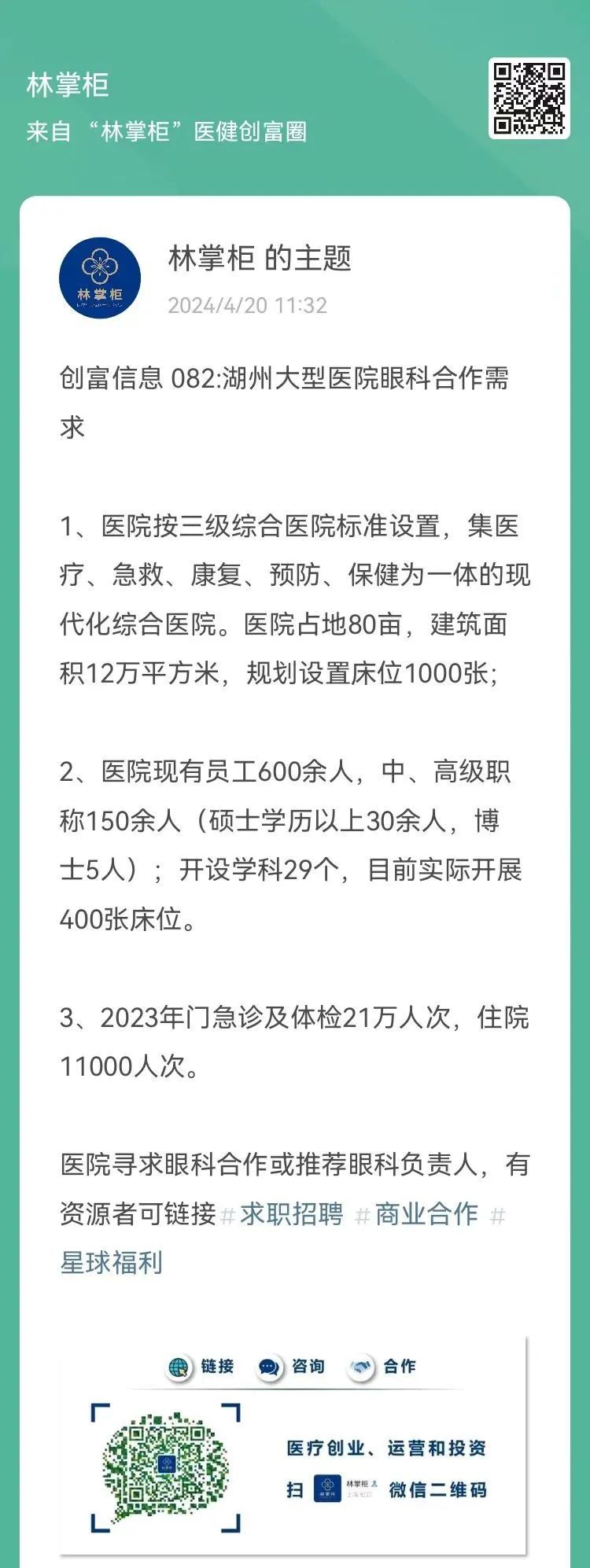 ![]() 三、浙江三级医院眼科等合作共建需求 1、医院位于浙江湖州,区域优势明显。规划床位1000张,已开放床位400张,2023年门急诊及体检21万人次,住院11000人次,年营收数亿元。 2、医院目前主营业务为神经外科和骨科,计划发展新科室,现寻求眼科科室共建合作,其他科室共建也欢迎洽谈,有专家团队者优先,合作条件优厚。