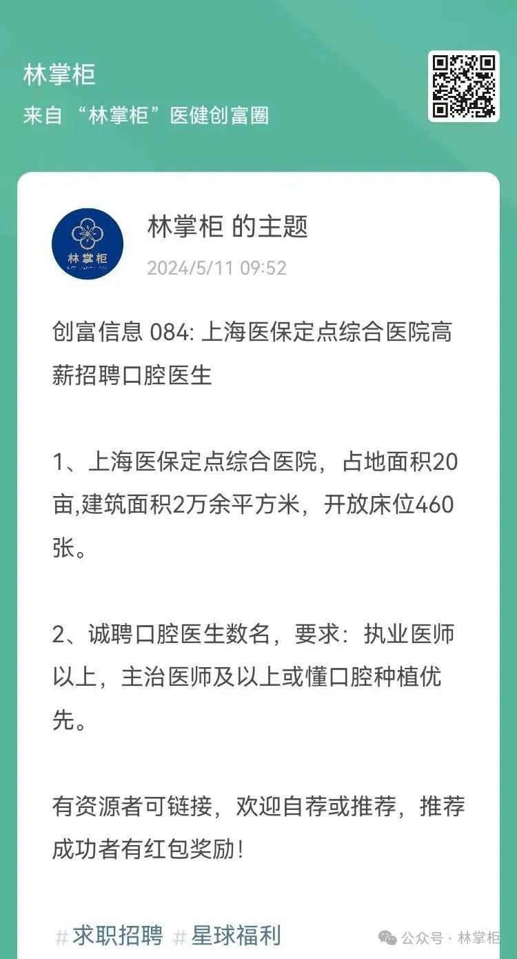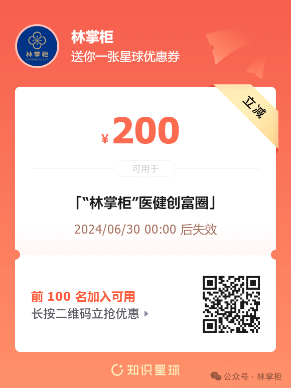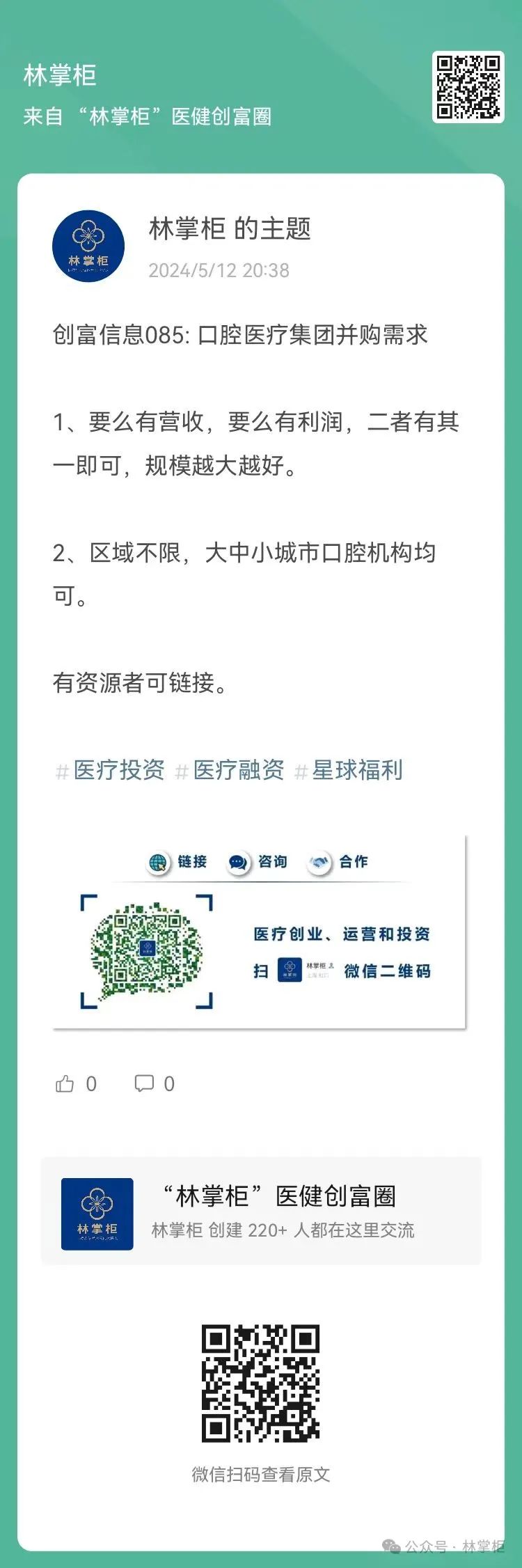 (长按二维码领券,专享新人优惠200元) 「“林掌柜”医健创富圈」:让一部分医健人先富起来!与云锋基金董事总经理、厚新健投执行董事、中信建投医药首席、世界500强前高管、知名大V等医疗从业者一起链接、咨询、合作!现将近期星球创富项目重点推荐如下: 一、知名口腔医疗集团并购需求: 1、口腔连锁或单体机构均可,整体营收1亿元以上优先。 2、区域不限,二、三线城市优先考虑。有意转让或有相关资源者可链接。