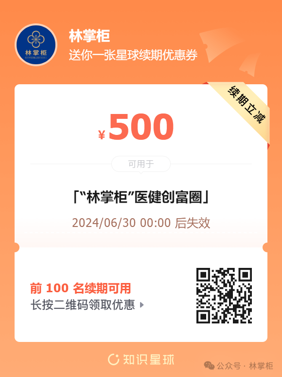更多医疗投融资及项目合作信息,详见: 知名资本和医疗集团并购暨上海、成都、长三角、大湾区等地医院和门诊部转让公告2024.5 一、“创富圈”星球基础权益 1、可向头部医疗投资人(包括云锋基金董事总经理、厚新健投执行董事、资深投资人肖恩大侠等)、知名大V(达叔)和知名医疗律师等大咖嘉宾提问。 2、不定期获得医疗健康行业最新资讯和精选研报以及医疗健康领域创业运营和投融资相关信息和私享干货。 3、每年有机会免费预约掌柜“1对1”线上咨询1次1小时(价值4000元,参考掌柜2024年线上咨询4000元/小时起步,每月接受星友“1对1”线上咨询预约总数不超过4个,先约先得)。“1对1”线下咨询8折优惠(优惠价值2000元,参考掌柜2024年线下咨询10000元/2小时起步)。 4、有机会免费受邀参加掌柜线下私享会(价值2000元,参考2024年线下私享会报名费2000元/人起步)。掌柜根据每期主题匹配邀请。 5、优先参加掌柜组织的线下活动(年会、私享会、训练营等),可享受星友8折优惠价。 6、医生可优先入驻“医生态”平台(公众号和小程序),免费获得平台“好医生”推荐。 7、免费加入“医疗创富圈”星友微信群(仍以星球交流为主,微信群为辅)。 8、赠送“林掌柜”公众号头条文章末尾广告位1个,价值2000+元。 二、“创富圈”星球增值权益 1、投资融资合作。包括但不限于医疗服务、生物制药、医疗器械、互联网医疗、数字医疗、医疗信息化等医疗健康领域投融资(含转让并购)信息对接。无论是介绍项目还是引荐资方,融资成功均可获得FA费用分成。若自己项目寻求融资,可享受FA费用优惠(分成和优惠比例详见星球置顶)。 2、核心人才猎头。推荐临床医疗、运营管理、投资融资等中高级人才,成功上岗后由猎头按照行规给予推荐费。 3、融资租赁对接。介绍融资租赁项目,成功签约后由相关利益方给予项目介绍费。 4、业务合作分成。包括但不限于医疗仪器、设备、耗材、软件、服务等合作分成。 5、医疗机构筹建。无论是协助批牌照、找物业还是弄装修、搞消防等,都可按当地行情获得相应服务费。 6、科研成果转化。无论是专利、商标还是著作权、版权等知识产权均有机会转化变现,通过对接全流程服务的专业团队,还可提供知识产权评估、出资、增资和转让等增值服务。 7、“微天使”投资。推荐同城医生上线“医生态”小程序最多者,不仅可获得“医生态”城市管理员权限,还将获得掌柜“微天使”投资10000元,更有望成为“医生态”城市合伙人。 8、“林掌柜”编辑部。凡是医疗创业、运营、投资、融资等主题未公开的原创文章均可投稿,掌柜选中就给钱,1000-2000元/篇,优稿优酬。 9、星球作业奖励。星球将不定期布置有奖作业,例如“你是如何赚取第一桶金”,分享精彩者或点赞最多者可获得现金奖励1000-2000元。 10、其他变现机会将在星球内不定期更新。 备注:以上权益解释权归星主所有,星主根据实际,予以修改补充。 长按二维码领券续费,专享续期优惠500元