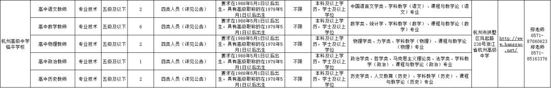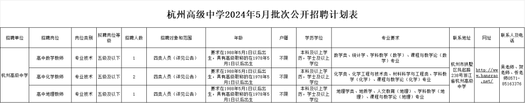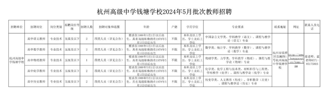 2024年5月批次招聘 杭州高级中学教育集团 ![]() 杭州高级中学教育集团2024年5月批次公开招聘专任教师26名,涵盖语文、数学、物理、化学、政治、历史、地理学科。其中: 杭州高级中学(贡院、钱江) 2024年5月批次公开招聘专任教师4名