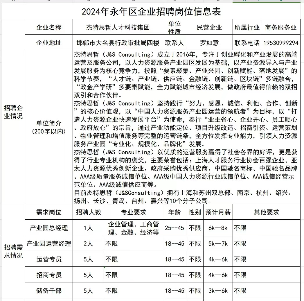 (四)邯郸长鹿旅游度假区项目部 企业简介:邯郸长鹿旅游度假区项目选址紧邻磁县如意湖公园,占地1345亩,规划总建筑面积15.7万平方米,主要建设休闲娱乐风情街、民俗演艺中心、冰雪研学科普馆、萌宠动物研学科普馆、全民休闲运动中心、主题餐饮及相关配套设施。项目(一期)建成后预计年接待游客量可达300万人次。 招聘岗位:一、出纳1名。25-40周岁,专科及以上学历,熟练使用办公软件。 二、行政兼法务人员1名。25-40周岁,专科及以上学历,有相关工作经验优先。 薪资待遇:录用后缴纳社保,8小时工作制,月休四天,每月综合薪资3800-5000元。 公司地址:磁县中华慈大街与振兴路交叉口东南。 联系电话:杨经理 18031003299 (五)邯郸市晟昊新能源科技有限公司简介 邯郸市晟昊新能源科技有限公司成立于2017年9月,位于磁县中盛国贸广场,是一家语音、图像数据资源和相关科研辅助数据服务提供商,该基地致力于打造人工智能产业服务基地,提供数以万计的数据,且已成功应用于无人驾驶车、智能语音系统、AI智能机器人等。 招聘岗位: 地图数据处理员30名。18-35周岁,专科及以上学历,毕业两年内大学生优先;通过操作专业的软件工具,对各类地图数据如道路、PO1、街景、卫星图等进行数据处理工作;会使用手机导航,对地图知识有基本了解,能适应地图数据重复工作。 薪资待遇 录用后缴纳社保,工作时间早9-12点,午14-18点,周日单休,每月综合薪资3000-4000元。 公司地址:磁县中盛国贸广场 联系电话:李经理 13293039925 公务员、事业单位和国企招聘信息 高校毕业生专区 (一)2024年河北省大学生志愿服务乡村振兴计划报名通道开启!~招募季 一、报名程序 6月1日2024年河北省大学生志愿服务乡村振兴计划报名通道正式开启! 报名时间:6月1日起至6月11日,2024年普通高等学校应届毕业生或在读研究生,可通过“志愿汇”APP进行注册报名。 二、服务内容 乡村振兴计划的服务内容分为:乡村教育、服务乡村建设、健康乡村、基层青年工作、乡村社会治理5个专项。志愿者服务期为1至3年,服务协议一年一签。 详细请浏览:https://mp.weixin.qq.com/s/6Lt80sUQACfuY9_tgQa6hQ (二)定州市2024年度事业单位公开招聘480名工作人员的公告 一、报名与资格初审时间 1.报名时间:2024年5月30日9:00至6月5日17:00 2.缴费时间:2024年5月30日9:00至6月6日17:00 实行网上报名和资格初审,每人限报考一个岗位。 二、报名网址:定州市人事考试网(http://221.192.200.180:8088)。 详细请浏览: http://221.192.200.180:8088/web/wenjian/20240521195321.html (三)邯郸市2024年定向选调优秀青年公告 一、选调岗位及人数 2024年度邯郸市面向有关院校定向选调优秀青年278名,其中市直部门132名、县(市、区)146名。 二、选调程序 (一)报名与审核 1.报名方式及时间: 本次报名采取网上报名的方式,报名网址:邯郸人事考试网上报名服务平台(https://hd.appms.cn) 网上报名平台技术咨询电话0310-3111654。 报名及信息提交时间为:2024年6月1日9:00至2024年6月6日18:00 详细请浏览: https://hd.appms.cn/KaoSheng/83178/userhtml/fabuitem.html?filter=KOS4muWKoUlEPSfpgq%2Fpg7gnKS5hbmQuKOWPkeW4g%2BaXtumXtD0nMjAyNOW5tDA15pyIMjnml6UgMDnml7Y0M%2BWIhjIw56eSJykuYW5kLijlj5HluIPnsbvlnos9JzAxJyk%253D 就业创业政策专区