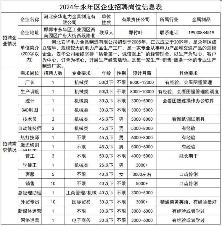 招聘招工信息 民营企业服务月暨十万学子进邯郸 专项招聘 县内企业招聘 一、兰美塑胶海绵厂 诚招车间女操作工10名,年龄不超过45周岁,学会正常计件工资10小时150-200元之间; 要求:初中文化,身体健康;常白班公司有食宿,工作轻松,薪资准时,有上进心者优先; 地址:鸡泽新兴工业园风雅大街(即韶泽中学东门)北行七百米路东; 联系电话:15132086323/13643205578 二、鸡泽县湘君府味业有限责任公司诚聘: 1.车间女工20名,工资3500-4000元; 福利待遇: 中午休息1小时管饭,节假日福利;计件工资,多劳多得;工龄奖:满半年50,一年100。公休2天,全勤奖500元; 2.销售内勤2名,要求全日制大专及以上学历,沟通能力良好,熟悉计算机,有财务知识者优先,工资3000-3500元。 3.车间管理员1名,要求全日制大专及以上学历,机电一体化相关专业优先,办公软件熟练,工资3500-4500元。 4.平面设计1名,负责公司产品包装设计工作,全日制大专学历及以上,设计类专业优先,有工作经验者优先,要求熟练使用PS,AI,有扎实的设计功底和审美品位。薪资面议 待遇优厚,节假日福利,带薪休假。 5.化验员2名,要求全日制大专及以上学历,化学、生物、食品工程相关专业,有工作经验者优先,薪资面议。 人事部联系电话:0310-7516210 13473010992 地址:鸡泽县经济开发区新工业园,椒乡北大街与韶泽路交口东南角 三、鸡泽县翼鑫塑料制品有限公司 鸡泽县翼鑫塑料制品有限公司,于2014年10月27日在鸡泽注册成立,主营行业为制造业,注册资金600万人民币。年创造经济价值约五亿元人民币。美的集团战略供应商。 招 聘: 1. 操作工(女)20名,年龄18-45岁,工资4500-7000元计件工资,多劳多得。 2.临时暑假工30名,工期1-3个月,工资4000-7000元,多劳多得。 福利待遇: 1. 满一年交三险。 2. 吃,住免费。 3. 满勤奖,工龄奖满一年600元,以此类推六年封顶3600元/年。 4. 每年举行优秀员工选举,优秀员工可得2000元-5000元现金不等。 5. 节假日福利(中秋、春节发放福利) 联系电话:13643109221 13803207206 地址:鸡泽县经济开发区毛遂北大街路东(鸡泽县翼鑫塑料制品有限) 县外市内企业招工信息 (一)磁县世纪元服务有限公司 企业简介 磁县世纪元服务有限公司管理运营磁县世纪广场,该广场2018年10月开业,营业面积4.5万平米,地上六层及地下一层,内设中央空调、滚动电梯、数字化监控、自动化消防、网络办公等系统,是一座集购物、休闲、餐娱、商务办公于一体的大型现代化、多功能的购物中心。 招聘岗位: 一、策划专员3名。专科及以上学历,会使用PS软件,有拍摄视频及创作经验,组织策划各种类型品牌宣传和产品销售活动等,并完成活动的策划、创意、执行。 二、电工3名。有电工证,中专及以上学历,40周岁以下。 三、营销经理5名。专科及以上学历,25-45周岁,负责市场和渠道的开发、维护,有营销实战经验,配合好公司其他部门开展工作。 四、招商专员5名。40周岁以下,有良好的沟通表达能力和一定的谈判技巧,根据公司招商计划,推动工作开展,有相关工作经验优先。 薪资待遇 具体工资面谈,每月公休,有员工福利、节日福利等。 公司地址:磁县政通街41号磁县世纪广场 联系电话:郭丽13473020325 (二)杰特思哲人才科技集团