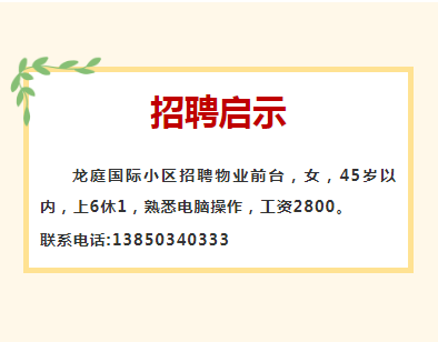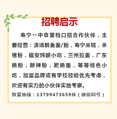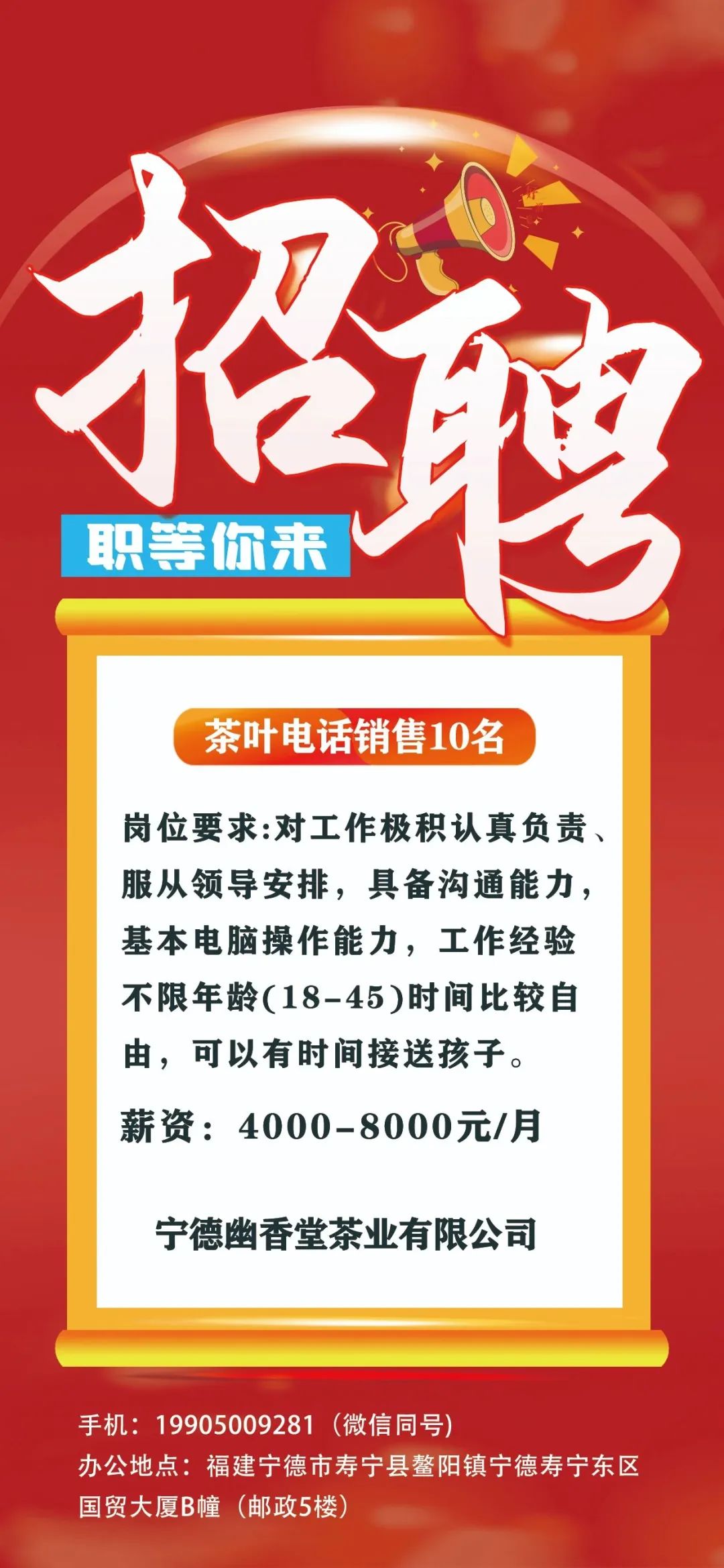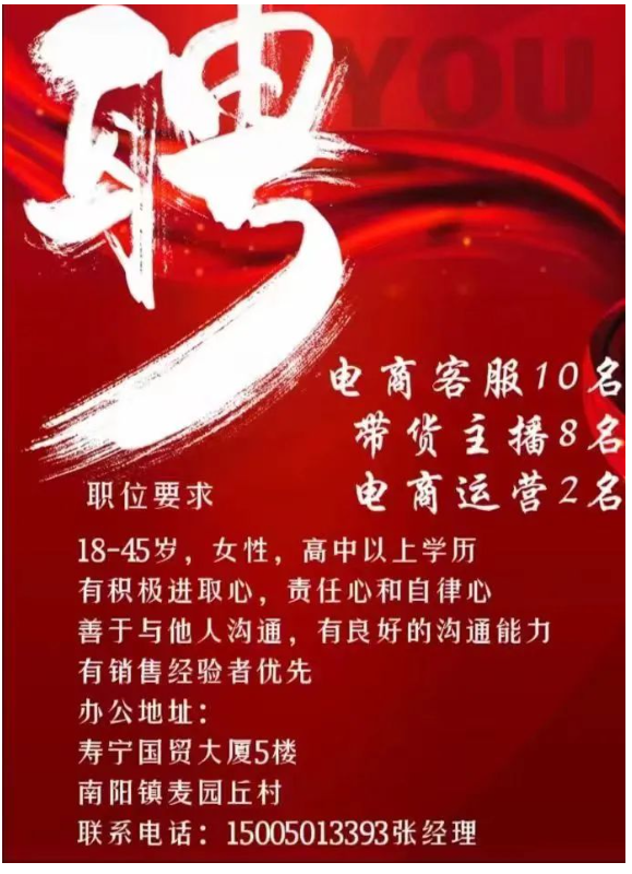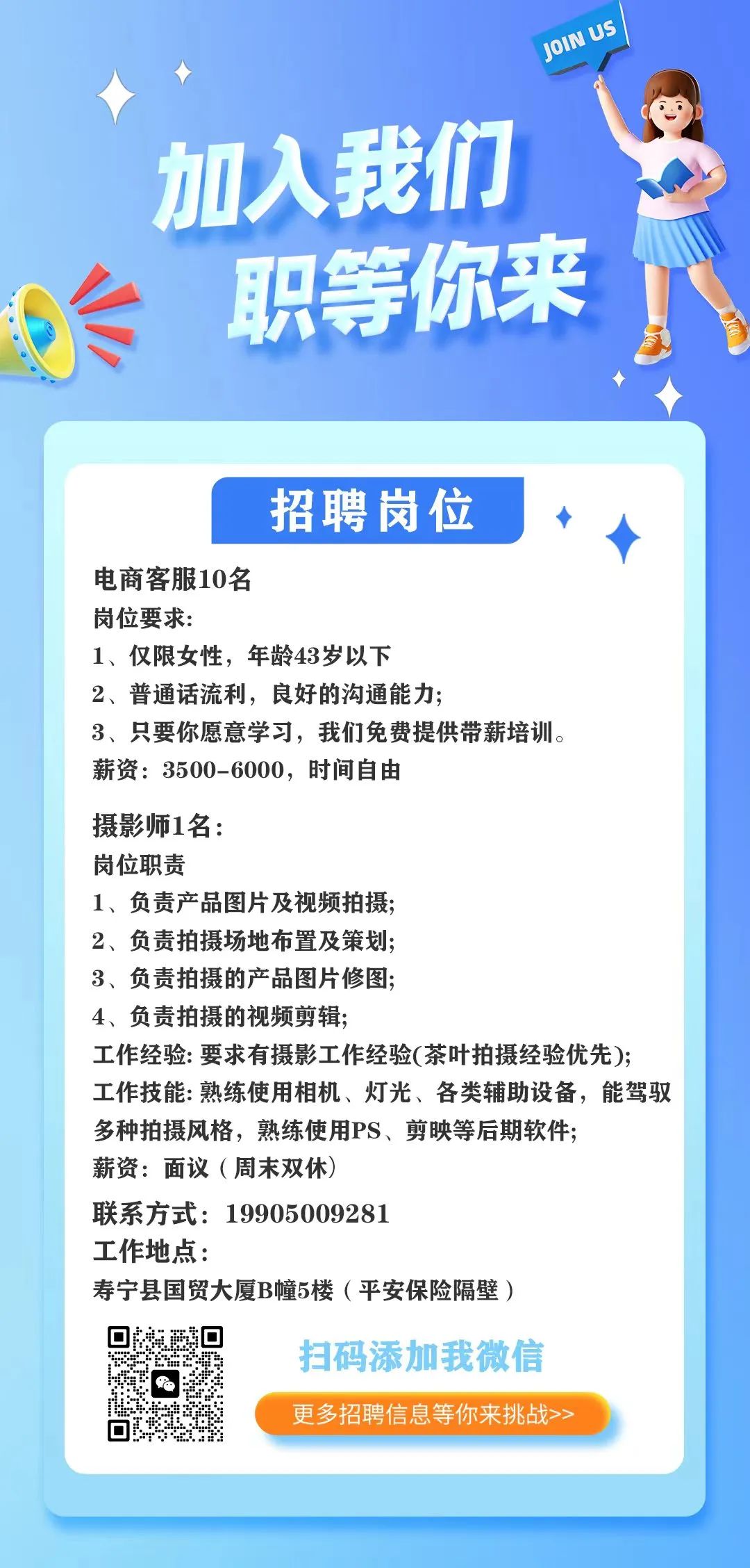 出租信息(更新一条) ▼ 【出租信息】 60平米左右,一二两层可出租 联系人,叶女士19959332817.蔡女士17318363702 招聘信息(更新一条) ▼ 【招聘信息】 @所有人招聘啦!招聘啦(寿宁) 办公室招聘文员两名 大专以上,实习期间底薪2500(适合大学生就业锻炼) 另招两名话务员,底薪1500(无需文凭) 年龄均在24~45之间 每天两个小时(适合在家带孩子的宝妈) 有意者联系13276952075 享受双休,三险一金 非诚勿扰,非诚勿扰 招聘信息(更新一条) ▼ 【招聘信息】 寿宁县雾龙茶叶专业合作社成立于2015年02月12日,注册地位于福建省宁德市寿宁县南阳镇官洋村麦园坵12号,法定代表人为龚扬亮。经营范围包括茶叶种植、茶叶初加工及销售。公司以秉承传统、百年品质、茶人合一的人文思想构建企业文化,以中国茶道和、静、怡、真的基本道义提升员工的精神品质,建设一支团结协作,爱岗敬业,热爱公司的团队。倡导自然、典雅、和谐、高品位的饮茶文化。我们的价值观:致力倡导优雅的生活态度,从而提升人们的精神生活品质。我们的企业文化:感恩、服务、奉献、责任。 招聘岗位: 电商客服10名 带货主播8名 运营学徒2名 招聘信息(更新一条) ▼ 【招聘信息 招聘信息(更新一条) ▼ 【招聘信息】 招聘信息(更新一条) ▼ 【招聘信息】 招聘信息(更新一条) ▼ 【招聘信息】 招聘信息(更新一条) ▼ 【招聘信息】 诚聘 宁德隆茗堂茶业有限公司,主营茶叶电商直播,短视频带货,货架等,位置交通便利,位于寿宁核心位置东区龙庭国际对面邮政储蓄楼上国贸大厦5楼! 常年招聘以下岗位: 1.电商运营:要求有抖店,淘宝,拼多多,快手小红书等电商店铺运营经验,也招学徒。 2.主播,副播,场控有直播经验优秀,也招学徒! 3.摄影设计师,要求:具备摄影经验,产品落地页设计的能力 4.售后客服,要求:平台回复客户问题,处理客诉,解决中差评等能力! 薪资:2500-10000,具体面议 联系人:魏先生18616518899 欢迎咨询或到公司面聊!! 招聘信息(更新一条) ▼ 【招聘信息】 【招聘岗位】:置业顾问1名【岗位职责】 1、进行楼盘的销售工作,为客户提供专业的房地产置业咨询服务,接待客户促进成交; 2、掌握客户需求,发掘及跟进潜在客户,做好对客户的追踪、联系等; 3、协助客户从购房至交房过程中涉及相关手续的办理,及老客户关系的维系。 【薪资】 1、薪资范围:3000-10000元/月 缴纳五险 2、入职即提供系统的入职培训和完善的晋升机制。 工作地址:南阳镇南阳村中兴路1号广海渔阳明都售楼部 联系电话:林女士18860114696 招聘信息(更新一条) ▼ 【招聘信息】 寿宁县鳌阳镇升平社区招聘文员、网格员。 为加强社区网格化服务工作,同时也为了更好服务辖区居民。升平社区现面向全体居民招聘前台文员、网格员数名,有关事宜如下: 一、招聘岗位: 招聘前台文员(需有写作能力)、网格员 二、招聘条件: 1、政治立场坚定,道德品行端正,身体健康,热心热爱社区工作,吃苦耐劳,勇于奉献。 2、年龄:前台文员40周岁以内,网格员45周岁以内,男女不限。 3、学历:高中及以上学历。 4、会电脑基本操作,制作表格。工作认真负责,语言表达能力好,沟通协调能力强。 5、前台文员薪资面议 联系方式:0593-5522011(范女士) 出租信息(更新一条) ▼ 【出租信息】 店面出租地址:茗溪新区(三角坪)马仙路11号 联系电话:13656948540 出租信息(更新一条) ▼ 【出租信息】 阳光鑫城单身公寓,租金1000元 ![]() ![]() ![]() ![]() ![]() ![]() 出租信息(更新一条) ▼ 【出租信息】 锁厂新村六层两房一厅出租,家俱齐全,月租金460元,押一付三。 联系电话:13599090639 ![]() ![]() ![]() ![]() 出租信息(更新一条) ▼ 【出租信息】 二楼办公场所出租出租场所位于胜利街321号二楼,四间,约150平米,视野开濶,阳光充足。上50米是住建局,下50米是国土资源局,地标明显。 有意者请咨询缪先生18950559558龙耀入驻 吉星高照 心想事成 鸿运大展! 招聘信息(更新一条) ▼ 【招聘信息】 招聘信息(更新一条) ▼ 【招聘信息】 福建安顺工程爆破有限公司寿宁分公司招爆破员、安全员、保管员各1-2名,年龄50周岁以下,会使用电脑、手机操作,有相关从业经验者优先, 详情面谈联系电话:13626996699。 招聘信息(更新一条) ▼ 【招聘信息】 招聘 宁德市寿宁县南阳镇寿宁一中食堂1.招厨师数名,要求:能吃苦耐劳,有上进心,有责任心,懂得成本控制,有学校经验优先,薪资待遇:6000元起,包吃包住,休息:跟学校同步,年龄要求:55岁以内,身体健康。2.招食堂阿姨数名,要求:能吃苦耐劳,有责任心,工资待遇:3000元起,包吃包住,休息:跟学校同步,年龄:60以内,女, 联系电话:13799473659林(微信同号) 招聘信息(更新一条) 招聘助老员人数:10名 一:招聘要求: 年龄在60周岁以下、身体健康、能使用交通工具及智能手机、有责任心、有服务意识、有爱心、能吃苦耐劳。 二:工作地点(坑底乡、芹阳乡、凤阳乡、托溪乡、下党乡、武曲镇) 三:薪资2000-4500左右。 四: 陈先生联系电话:18859347935 招聘信息(更新一条) ▼ 【招聘信息】 有好团品寿宁店聘导购两名,需要胆大心细,有耐心,能吃苦耐劳,懂电脑收银,男女均可,上班时间8个小时左右,具体看店里安排,薪资面议 地址:瀚誉广场一楼有好团品仓储购 联系电话:18958985553 招聘信息(更新一条) ▼ 【招聘信息】 ▼ 【招聘信息】 ▼ 【招聘信息】 👀 看这里:饿了么诚聘 👤 全职骑手数名(南阳镇) 