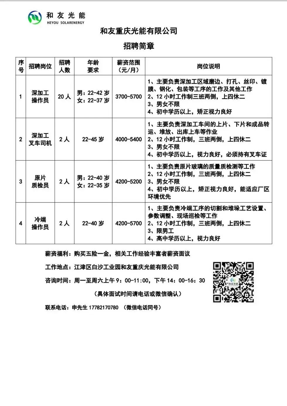 点击下方名片,看更多白沙大小事 ↓↓↓ 求职招聘(更新 10 条) ▼ 【厂区招聘】 和友重庆光能有限公司因生产需要,现面向社会火热招聘以下岗位。 详情可以电话咨询: 1778***0780 ![]() 扫码关注后查看详情 ▼ 【招聘】 白沙云鼎和街上植物医生上半天耍半天、店面发展需要优秀人才储备中…… 现招聘美容导购数名[爱心]学徒数名 要求:爱好护肤行业,有团队意识,服从管理,积极向上,能长期做工作的…… 🔆带薪培训。 🚀有美容经验熟手优先[勾引][勾引][勾引] 工作地址: 白沙植物医生一店(建行旁边) 白沙植物医生二店(老二院中心路17号) 欢迎推荐和自荐 咨询电话1872***2699 ![]() 扫码关注后查看详情 ▼ 【招聘】 国民内衣,都市丽人白沙全新直营店招聘营业员数名,女性,25-40上二休一,底薪2500加销售2%提成,全勤奖,绩效奖,生日补贴,综合工资3500以上。全面系统的培训,助你快速提升专业技能。 聘店长一名,女性,年龄25—40岁,具有良好的沟通协调能力,具体待遇面谈! 地址:白沙中兴路61号 联系人:何姐 1531***1316 扫码关注后查看详情 ▼ 【招聘】 江津白沙烤漆全屋定制厂。招聘开放漆师傅一组,保底10000+!业务员,5000-20000不等,,,电话1809***1163王总 扫码关注后查看详情 ▼ 【招聘】 岗位职责 1、负责各项移动业务政策的解答及业务办理; 2、负责移动运营业务咨询、客户投诉接待工作; 3、负责维护营业厅销售、服务环境,自觉提升服务意识,以优质服务促进销售。 任职资格 1. 大专以上学历,限女,大学应往届毕业生优先; 2、性格开朗大方,能承受工作压力,勇于挑战; 3、工作细致有条理,学习能力强,服务意识佳; 4、有同行工作的经验者优先考虑; 月休6天(大小周),五险; 工资:底薪加提成综合收入3000+ 扫码关注后查看详情 ▼ 【厂区招聘】 重庆登鸿机电有限公司位于新白沙长江大桥旁,专业从事于摩托车配件的制造及销售,因公司生产需要,现招聘普工一名, 年龄50岁以下,男女不限,听从领导安排,有责任心,吃苦耐劳,工资计件,多劳多得,综合工资3-5千。 上班时间:早上8点至下午5点半 买五险,有生活补贴,提供住宿,周末有休息 有意者联系: 况老师:1336***1681 吴老师:1570***0659 扫码关注后查看详情 ▼ 【厂区招聘】 因本公司发展需要:1.猪皮去油2名,女,35-55岁,穿雨鞋,工作服帽,做满15天及以上每天8小时100元保底,超出保底按计件工资 2.外包装箱1名,女,35-53岁,视力良好,身体健康,有意者联系186-23460821 3.内包开机器2名,女,30-45岁,视力良好,身体健康,现阶段有2班倒,有意者联系186-23460821 工作地址:白沙工业园涵欣悦食品有限公司(友鼎斜对面)。 扫码关注后查看详情 ▼ 【招聘】 白沙外卖单价在4块1起步,到6块不等距离越远单价越高商家现有华莱士逐渐增加现招聘骑手,工资10号前发 扫码关注后查看详情 ▼ 【招聘】 招 聘 因本集团公司产量上涨,业务增加,现招木门办公室销售学徒三名,男女不眼,年龄22-43,能适应外地出差,早九晚五,有吃包住,达标后买保险,工作超轻松,底薪2500起+高提成+开发奖,综合工资6000~20000上不封顶。 工作地: 白沙工业园区 联系人: 洪先生1738***9078 扫码关注后查看详情 ▼ 【厂区招聘】 因工作需要现招聘,数控车工1数名,车工1名,铣床工1名,要求会看图纸,能独立完成加工!要求会看图纸!工资面议,地址高屋广场平安路12号联系电话1818***0191微信同号 扫码关注后查看详情 房屋租售(更新 2 条) ▼ 【房屋出售】 出售住房位于高屋三叉马路,3楼、125平三室两厅 扫码关注后查看详情 ▼ 【房屋出租】 杨家湾风情街3楼单间配套出租,拎包入住! 扫码关注后查看详情 二手物品(更新 2 条) ▼ 【二手出售】 9成新冷鲜柜,便宜出! 扫码关注后查看详情 ▼ 【二手出售】 价格美丽,有意电话联系! 扫码关注后查看详情 生意转让(更新 3 条) ▼ 【生意转让】 因个人原因,考虑将盈利中鱼庄转让,接手可盈利,16方天然气,租金低于同地段门市,无物管费,有稳定客源,欢迎有兴趣的老板实地考察,非诚勿扰! 扫码关注后查看详情 ▼ 【生意转让】 白沙云鼎酒店转让,地理位置好,有兴趣的联系1913***8816 扫码关注后查看详情 ▼ 【生意转让】 因需要外地发展,现诚心转让正在营业茶楼 联系电话:1500***6698 扫码关注后查看详情 求职招聘(更新 ) ▼ 【厂区招聘】 本厂招聘会计一名,有工作经验的优先!单休,工作地点,白沙友鼎食品工业园 联系人,屈姐! 扫码关注后查看详情 ▼ 【厂区招聘】 白沙工业园重庆玖玖弘食品有限公司因生产需要招聘以下岗位 叉车驾驶员一名,有叉车证,能熟练驾驶叉车,负责物资入库,完成辅助生产等工作,长白班,工资4000-4500月,试用期一个月后买五险。 保鲜库打包女工一名,年龄55岁以下,能吃苦耐劳,试用期3个月后买社保,计件工资5000-7000元,中午包吃,长白班。 车间杂工一名,男性,会开叉车,包吃住,工资4000-4200元,一个月后买五险。 面试时间:早上9:00-11:30,13:30-16:30,其他时间勿扰 联系电话:1521***2767 何女士 扫码关注后查看详情 ▼ 【求职】 本人女,25岁,做过幼儿园老师。在家具厂做过文员。 扫码关注后查看详情 ▼ 【招聘】 招聘保洁阿姨,55岁以下,要求会骑车,有责任心,能吃苦耐劳,底薪➕提成加奖金,月休4天,招长期工,短期工勿扰!有意者联系!1732***8437 扫码关注后查看详情 ▼ 【招聘】 杨家湾世纪联家超市招收银员,应聘电话1505***9268 扫码关注后查看详情 ▼ 【招聘】 本