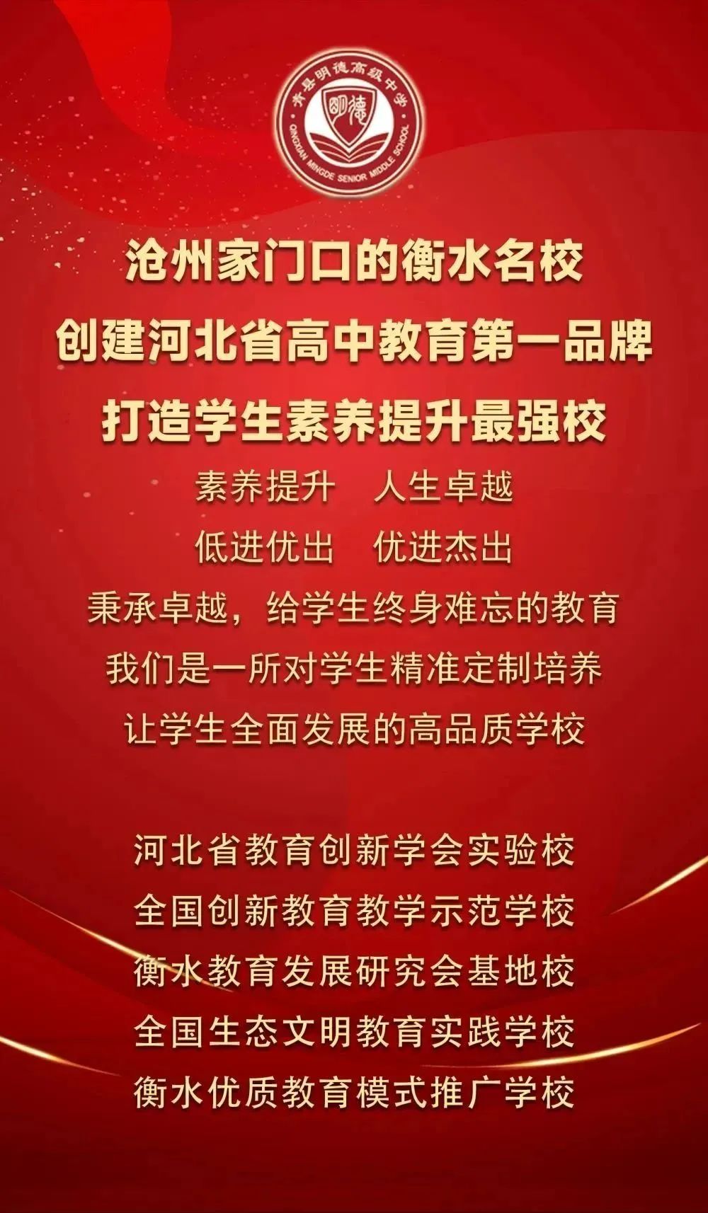 青县明德高级中学是青县县委、县政府、教育局引入的衡水优质教育,学校位于河北省沧州市青县清州镇新华西路12号,是一所民办寄宿制高级中学。我校是衡水教育发展研究会旗下的又一所衡水优质教育基地校,由河北省教育厅原副厅长、河北省创新教育学会会长韩清林为名誉会长,原衡中校长张文茂为专家顾问,依托衡水名校的先进办学模式和衡水名师的优秀教学水平,充分发挥衡水高端教育品牌,衡水名校长、名师的教育高度,整体提升合作学校的办学高度、管理水平、教师的综合素质和学生的核心素养,成为举办青县知名学校的有力支撑。