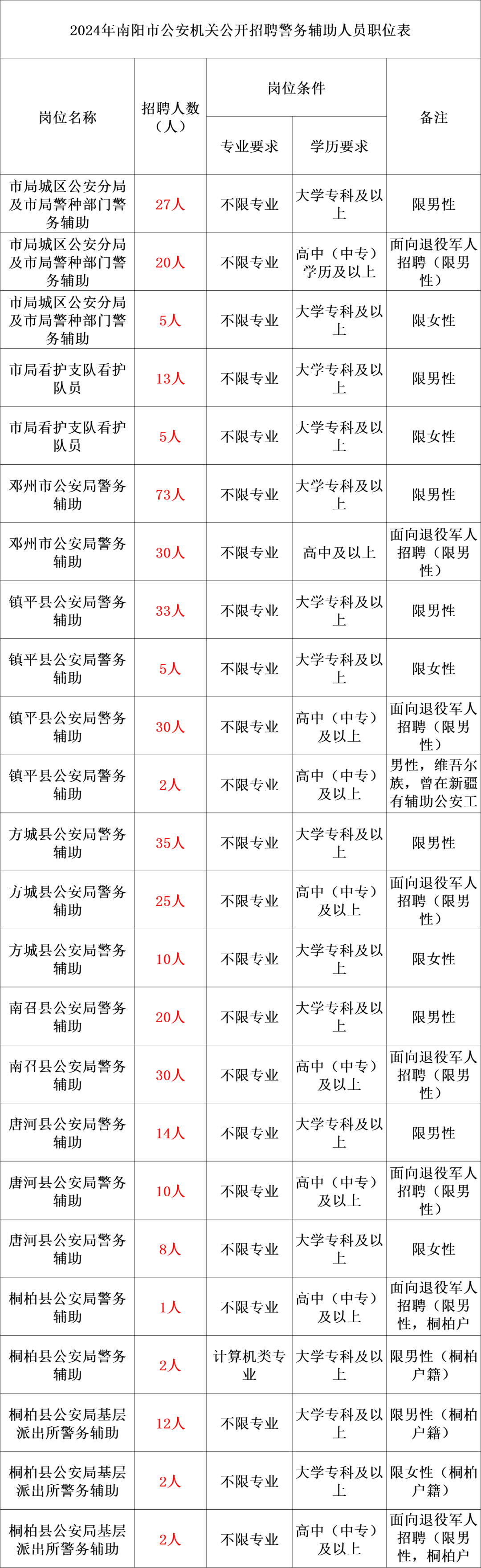 2024年南阳市公安机关公开招聘警务辅助人员公告根据工作需要,南阳市公安机关面向社会公开招聘警务辅助人员414名点击获取职位表,相关招聘事项公告如下:招聘警务辅助人员414名点击获取职位表,男性379人(其中退役军人148人)、女性35人,具体情况如下(招聘具体职位见附件):(一)南阳市公安局招聘70人(含看护队员18人),男性60人(含退役军人20人,看护队员13人)、女性10人(含看护队员5人)(招聘岗位为市局各分局、局直警种部门及看护支队);(二)邓州市公安局招聘辅警103人,招聘人员均为男性,其中退役军人30名(招聘岗位为邓州市公安局所属单位);(三)镇平县公安局招聘辅警70人,男性65人(含退役军人30人)、女性5人(招聘岗位为镇平县公安局所属单位);(四)方城县公安局招聘辅警70人,男性60人(含退役军人25人)、女性10人(招聘岗位为方城县公安局所属单位);(五)南召县公安局招聘辅警50人,招聘人员均为男性,其中退役军人30人(招聘岗位为南召县公安局所属单位);(六)唐河县公安局招聘辅警32人,男性24人(含退役军人10人)、女性8人(招聘岗位为唐河县公安局所属单位);(七)桐柏县公安局招聘辅警19人,男性17人(含退役军人3人)、女性2人(招聘岗位为桐柏县公安局局直单位和所属派出所)。2.拥护中华人民共和国宪法,遵守国家法律、法规和社会公德,政治坚定,品德端正;3.自愿从事警务辅助工作,具有忠诚奉献、吃苦耐劳精神,服从组织分配;4.年满18周岁以上、35周岁以下(1989年6月1日至2006年6月1日期间出生);5.具有国家承认的大学专科及以上学历;退役士兵文化程度可放宽至高中(中专);具备报考岗位所需的基础理论和专业知识,聘用后能够按照用人单位要求及时到岗工作;6.具备履行职责所需的身体条件,身体健康、体型端正,无残疾、无纹身、无传染病、无色盲,双侧矫正视力均在4.8以上;1.本人受过刑事、行政处罚或涉嫌违法犯罪尚未查清的;3.本人或家庭成员参加非法组织、邪教组织或者从事其他危害国家安全活动的;4.曾被开除中国共产党党籍、开除中国共产主义青年团团籍、在高等教育期间被开除学籍、被机关事业单位开除公职或辞退的;5.曾从事警务辅助人员或者看护队员工作辞职的,或因曾违反公安机关管理规定被解除劳动合同的;7.法律、法规规定不适合从事警务辅助工作的其他情形。1.烈士遗属、因公牺牲军人和因公牺牲人民警察的配偶子女;本次招聘考试,采取网上报名方式进行。2024年6月 7日9:00至6月12日18:00,报名者登录南阳市人事考试网(http://www.nyrsksw.com),点击“2024年南阳市公安机关公开招聘警务辅助人员报名入口”进入网上报名系统,按要求提交报名申请并上传本人近期免冠正面证件电子照片(红底、蓝底、白底均可)。报名申请被接受后,请牢记报名密码,身份证号码和密码是报考者查询报名资格审查结果、网上缴费、下载打印资格审查表和准考证等事项的重要依据,请妥善留存。报考人员只能选择一个专业岗位进行报名,多报者无效,报名与考试时使用的有效居民身份证必须一致。报考者报名前,要仔细阅读相关要求,提交的报考申请信息应当全面、真实、准确、有效;要全面了解职位要求,报考岗位要与自身情况一一对照,自行判断是否具备相应资格条件,理性、慎重选择报考职位,避免误报、错报。因误报、错报职位或提交虚假信息所产生的一切后果,由报考者本人承担。报考人员报名后,招聘单位根据招聘资格条件对报考者填报的信息进行资格初审。报考人员可在填报信息后及时登陆原报名网站查询是否通过资格审查。通过报考资格初审人员,不能再报考其他职位;报考申请尚未进行初审或未通过报考资格初审的人员,可以改报其他职位。报考资料不全或电子照片不符合要求的,报考者应及时补充或更换,并按要求再次提交审查。考生在提交报名申请后,请及时登录报名系统,查看是否通过报考资格初审,通过报考初审的即可缴费,笔试考务费每人30元,请考生登陆报名网站缴纳。网上缴费截止时间为2024年6月13日18:00,未按期缴费的视为自动放弃。缴费完成后,考生须自行打印《2024年南阳市公安机关公开招聘警务辅助人员报名资格审查表》两份,招聘中在资格确认时要提供该材料以验证考生报名情况。各职位的拟招聘人数与报名人数的比例原则上设定为1:3,达不到1:3的,该职位招聘名额递减或取消。对拟聘用职位被取消的报考人员,市人力资源和社会保障局、市公安局根据各职位实际报考人数,对核减核销职位数进行调剂,取消招聘的岗位和调剂情况在原报名网站官方网站公布,请报考者及时关注,未在规定时间内重新选报岗位的,视为自动放弃报名资格,退还缴纳的笔试考务费用。报名成功的考生,请根据南阳市公安局网站发布的《2024年南阳市公安机关公开招聘警务辅助人员笔试考试公告》,登陆原报名网站南阳市人事考试网(http://www.nyrsksw.com)打印本人笔试准考证(A4纸)。报考人员应妥善保管笔试准考证,进入体能测评、面试的人员,需在体能测评、面试资格确认时提交验证。报考人员应认真阅读本次考试的公告内容,确保本人符合招聘岗位报名条件。如果本人不符合考试报名条件但进行了网上报名,本人的报考资格、笔试成绩无效,已经缴纳的笔试考务费用不予退回,由此产生的一切后果由考生本人承担。1.笔试时间及地点以笔试准考证为准。报考者须持准