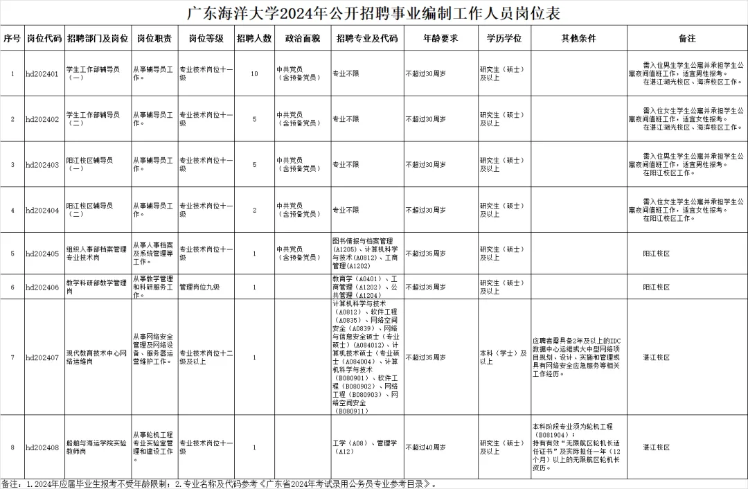 根据《事业单位人事管理条例》(国务院令第652号)、《广东省事业单位公开招聘人员办法》(粤府令第301号),结合工作需要,广东海洋大学面向社会公开招聘26名事业编制工作人员,有关事项公告如下: 一、招聘单位简介 广东海洋大学是一所由广东省人民政府和自然资源部共建、多学科协调发展、具有“学士、硕士、博士”完整学位授权体系的省属重点建设的综合性海洋大学,是广东省高水平大学重点学科建设高校。 二、招聘岗位 面向社会公开招聘26名事业编制工作人员,具体招聘岗位情况见附件。 三、招聘对象 普通高等院校2024年应届毕业生和社会上具有国家承认学历的人员。 四、招聘条件 (一)应聘人员应当具备下列条件: 1.具有中华人民共和国国籍; 2.遵守宪法和法律; 3.拥护中国共产党领导和社会主义制度; 4.具有良好的政治素质和道德品行; 5.适应岗位要求的身体条件; 6.报考辅导员岗位(代码为hd202401-hd202404)的要求有一年以上在校就读期间具有以下学生干部经历之一(截止至报名前需满一年,学生干部证明须由所在院系、党委(党总支)、学校团委、学生处或研究生处等出具并加盖公章),具体如下: (1)曾担任班干部、班团支部干部职务; (2)曾担任学校团委学生会干部、研究生团委学生会干部,学院团委学生会干部职务; (3)曾担任学校青年志愿者联合会正副主席和各部门的正副部长、学院青协正副主席和各部门的正副部长以上职务; (4)曾担任学生党支部委员。 7.具备报考岗位所需其他条件,详见附件《广东海洋大学2024年公开招聘事业编制工作人员岗位表》。 (二)报考人员具有下列情形之一者,不得报考: 1.受过刑事处罚的; 2.被开除中国共产党党籍的; 3.被开除公职的; 4.被依法列为失信联合惩戒对象的; 5.法律、法规规定的其他情形。 五、薪酬待遇 聘用人员为事业编制,薪酬待遇按国家及省政策规定执行。 六、报名 (一)报名时间 2024年6月7起至6月14日止。 (二)报名方式 本次招聘实行网络报名。应聘人员通过广东海洋大学人才招聘网(https://zp.gdou.edu.cn)注册报名,报名操作事项请查阅网站通知公告。 在系统如实填报并上传的相关材料包括但不限于:《广东省事业单位公开招聘人员报名表》(系统填报后自动生成,无需上传)、身份证正反面复印件、高校各阶段学历及学位证书、清晰的正面全身彩色近照1张、其他相关证明材料。应届毕业生须提交《应届毕业生就业推荐表》,国(境)外留学人员须提供教育部中国留学服务中心境外学历、学位认证相关材料。 (三)注意事项 1.应聘人员在招聘公告规定的时间内登录广东省人力资源社会保障网(http://www.gdhrss.gov.cn)或广东海洋大学人才招聘网(http://zp.gdou.edu.cn),详细了解招聘岗位及有关条件; 2.国内2024年应届毕业生应在2024年8月31日前取得相应毕业证书、学位证书;其他报考人员须于报名截止之日前取得相应的毕业证书、学位证书。港澳台学习、国外留学人员须于报名截止之日前取得教育部中国留学服务中心境外学历、学位认证函及有关证明材料,并在资格复审时出具教育部中国留学服务中心境外学历、学位认证书以及有关证明材料; 3.报考辅导员岗位(代码为hd202401-hd202404)的人员除提交上述材料外,还须上传主要学生干部证明、中共党员(含预备党员)党组织关系有关材料; 4.报考档案管理专业技术岗位(代码为hd202405)的人员除提交上述材料外,还须上传中共党员(含预备党员)党组织关系有关材料; 5.报考网络运维岗位(代码为hd202407)的人员除提交上述材料外,还须上传2年及以上的IDC数据中心运维或大中型网络项目规划、设计、实施和管理或具有网络安全应急服务等相关工作证明材料(如公司证明、申报书、实施材料等并加盖公章); 6.报考实验教师岗位(代码为hd202408)的人员除提交上述材料外,还须上传有效“无限航区轮机长适任证书”及实际担任一年(12个月)以上的无限航区轮机长资历证明,核验以中国海事综合服务平台查询结果为准。 七、资格审查 资格审核贯穿此次招聘工作全程。在招聘各环节如发现报考者不符合报名资格条件,或报考者和有关单位、人员提供的材料、信息不实的,取消其报考资格或聘用资格。资格条件各阶段审查结果将在系统内发布,并通过邮件、短信等形式告知应聘人员。 (一)资格初审 报名时间截止后3个工作日内完成笔试前报名资格初审。此阶段采用系统自动审核和人工审核相结合的方式,审查应聘人员的基本信息是否完整、基本条件是否符合。通过笔试前资格初审的应聘人员可参加笔试,但不视为已通过资格审核。 (二)资格复审 面试前学校将对入围面试人员是否符合本公告基本条件及招聘岗位具体条件进行现场资格审查。 入围面试人员未按规定时间参加资格审查和面试的,视为自动放弃;证件(证明)不全且不能在资格审查结束之日前补全的或与报考资格条件不符的,取消面试资格。 因面试资格被取消导致面试人选出现空缺的,在同一岗位笔试合格的应聘人员中按笔试成绩从高到低依次递补入围面试人员。 八、考试 本次招考采取笔试加面试方式进行。具体考试时间、地点另行通知。请应聘人员保持通讯畅通,密切留意广东海洋大学人才招聘网公告。 (一)笔试 笔试采取固定考场闭卷限时方式进行,不指定考试用书。 1.辅导员岗位(代码为hd202401-hd202404),考核内容包含但不