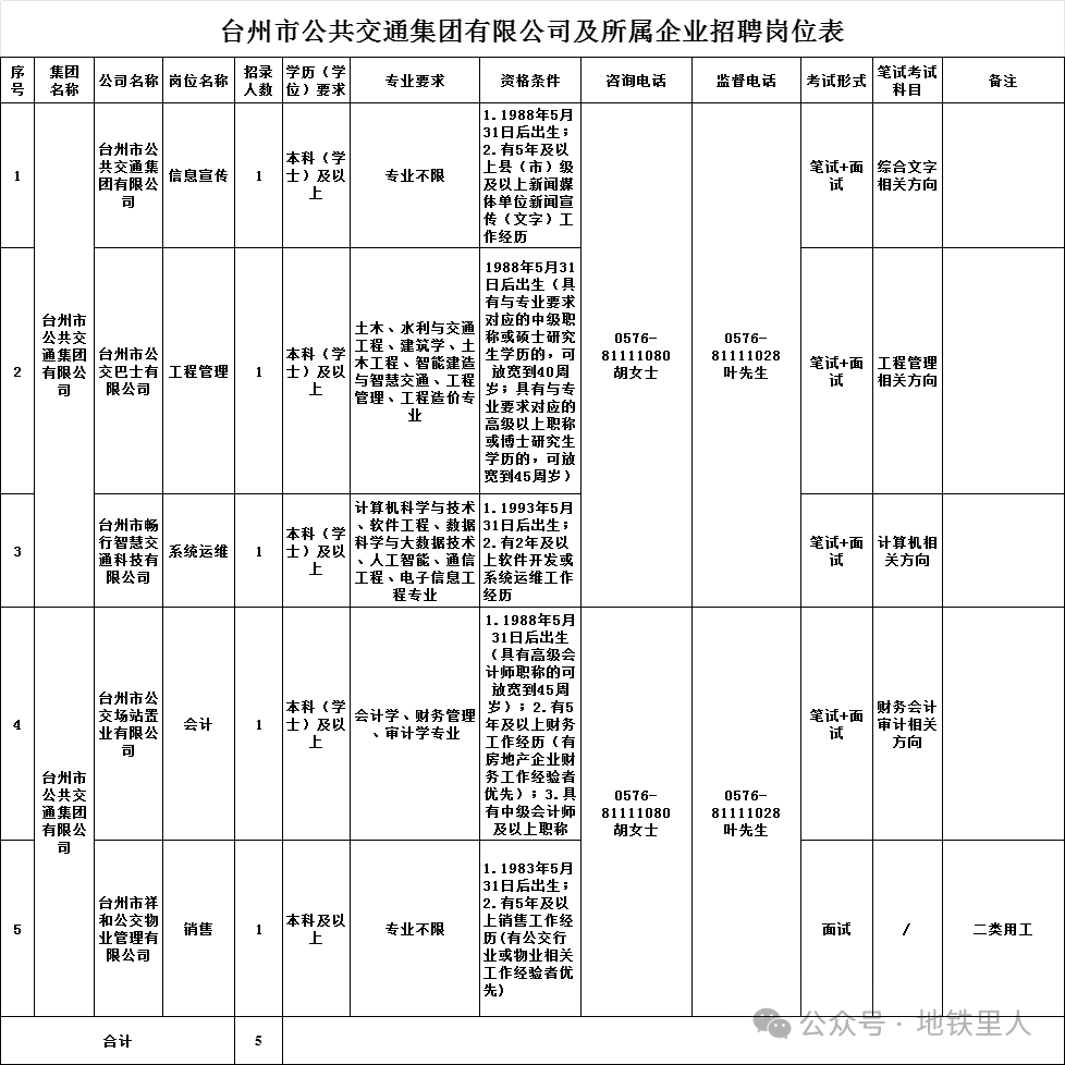 台州市公共交通集团有限公司(以下简称“台州公交集团”或“集团”)是经台州市人民政府批准设立,由台州市人民政府国有资产监督管理委员会直接监管的公益类市属国有企业,注册资本2亿元。集团总部内设9个职能部门,拥有员工2600人,主要经营台州市区公交客运,服务覆盖市区150多万人口。下属企业有台州市公交巴士有限公司、台州市公交场站置业有限公司、台州市公务用车服务有限公司、台州市畅行智慧交通科技有限公司、台州市公交广告传媒有限公司、台州市祥和公交物业管理有限公司、台州市祥和旅游开发有限公司、台州爱巴士校车运营有限公司等。业务范围涵盖常规公交、定制公交、公务用车、专业化公共校车及站场物业综合开发、交通出行综合运营、公交大数据应用、交通物业智能科技产品研发和施工、旅游休闲产业、广告文化传媒以及汽车后市场等多个领域。现因企业发展需要,台州公交集团及其所属企业面向社会公开招聘5名工作人员。具体事项公告如下: