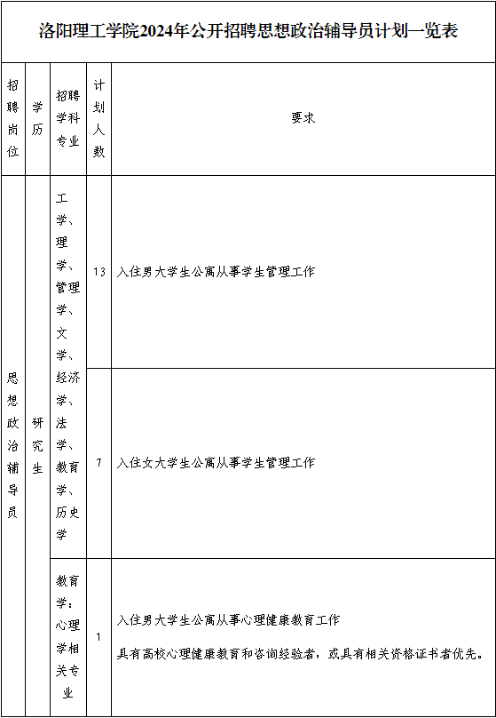 根据学校岗位空缺情况和进人计划,招聘21名具有研究生学历编制内思想政治辅导员。详见《洛阳理工学院2024年公开招聘思想政治辅导员计划一览表》。
