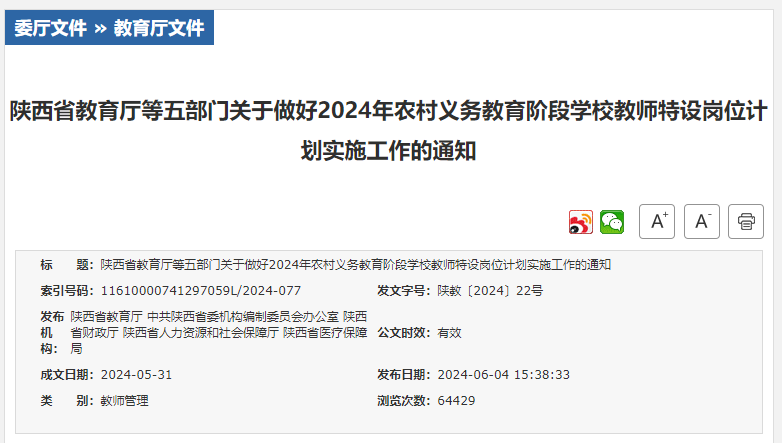 为顺利实施2024年我省农村义务教育阶段学校教师特设岗位计划(简称特岗计划,下同),按照《教育部办公厅 财政部办公厅关于做好2024年农村义务教育阶段学校教师特设岗位计划实施工作的通知》(教师厅〔2024〕1号)精神和要求,现就有关事项通知如下。