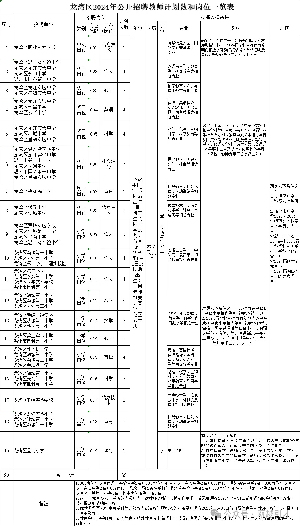 (六)具备招聘岗位要求的其它资格条件,详见《龙湾区2024年公开招聘教师计划数和岗位一览表》(附件1)。