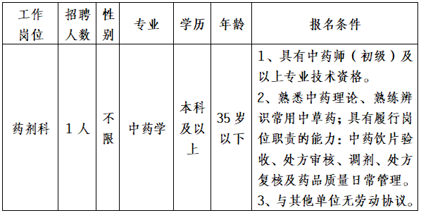 报名条件:1、具有中药师(初级)及以上专业技术资格。2、熟悉中药理论、熟练辨识常用中草药;具有履行岗位职责的能力:中药饮片验收、处方审核、调剂、处方复核及药品质量日常管理。3、与其他单位无劳动协议。