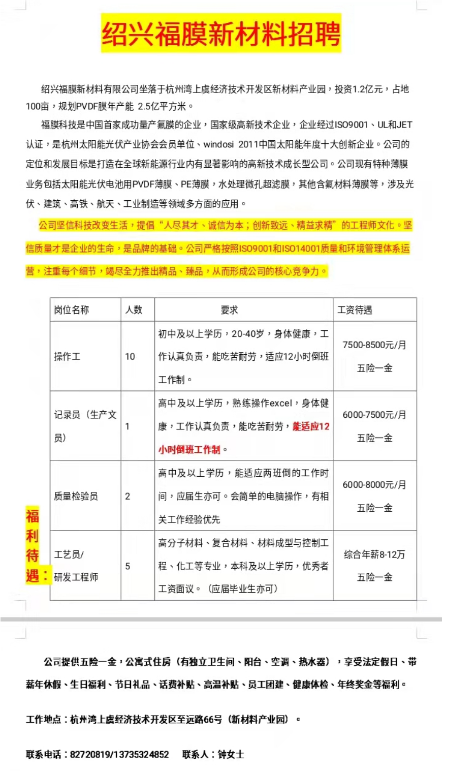 机修工:男,50周岁以下,长白班,本地人,中专及以上学历,机电一体专业,有经验优先,待遇面议