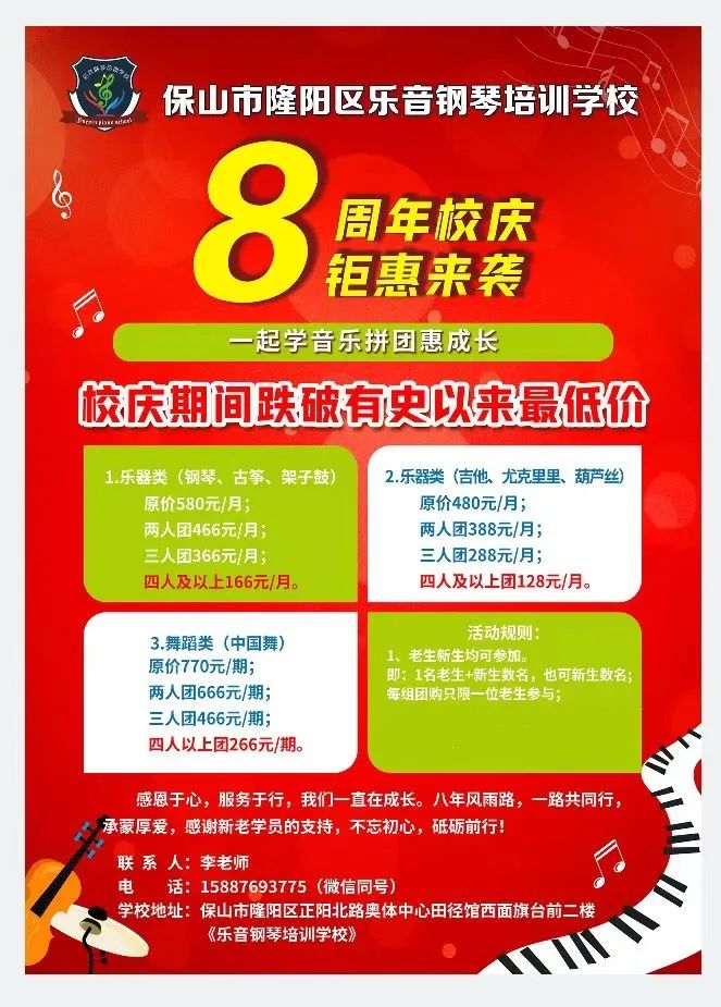 隆阳区乐音钢琴培训学校8周年校庆即将到来,特举办校庆钜惠活动(一起学音乐拼团惠成长校庆期间跌破有使以来最低价),赶紧加入我们吧!