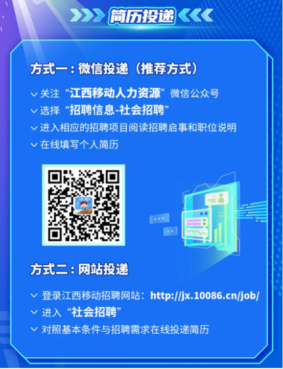 报名途径:微信关注“江西移动人力资源”公众号,选择招聘信息-社会招聘—招聘岗位—选择赣州分公司—寻乌县分公司,点击立即投递在线填写即可。联系人:15070779685(古)、15070779155(刘)