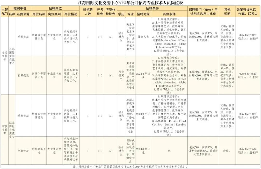 联系电话请见《江苏国际文化交流中心2024年公开招聘专业技术人员岗位表》的“政策咨询电话、传真、联系人”栏。