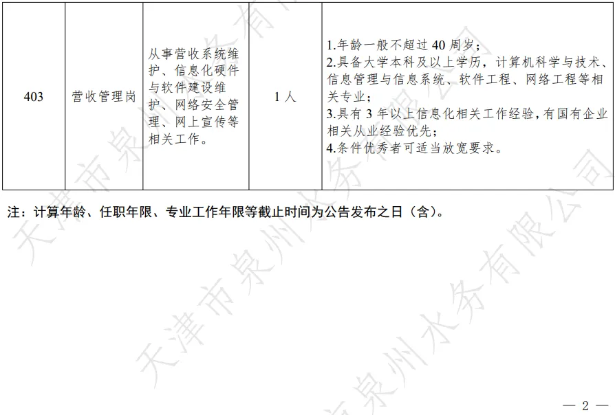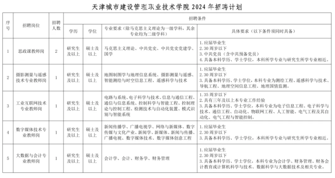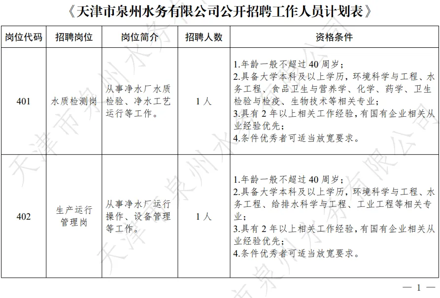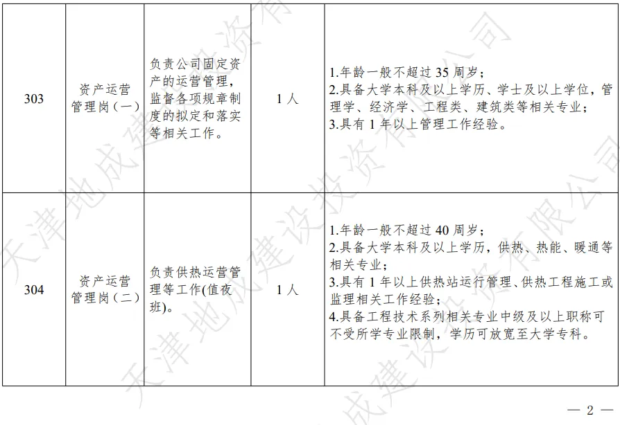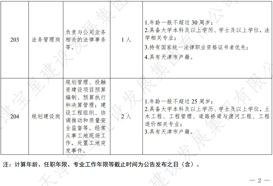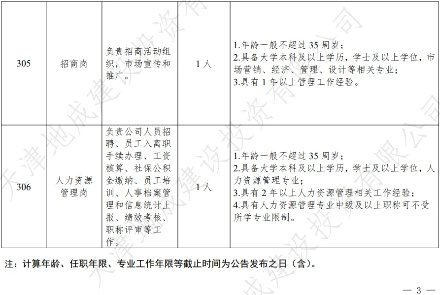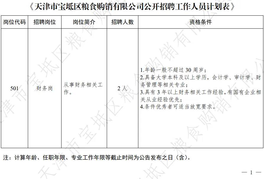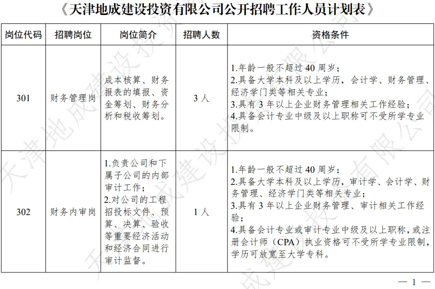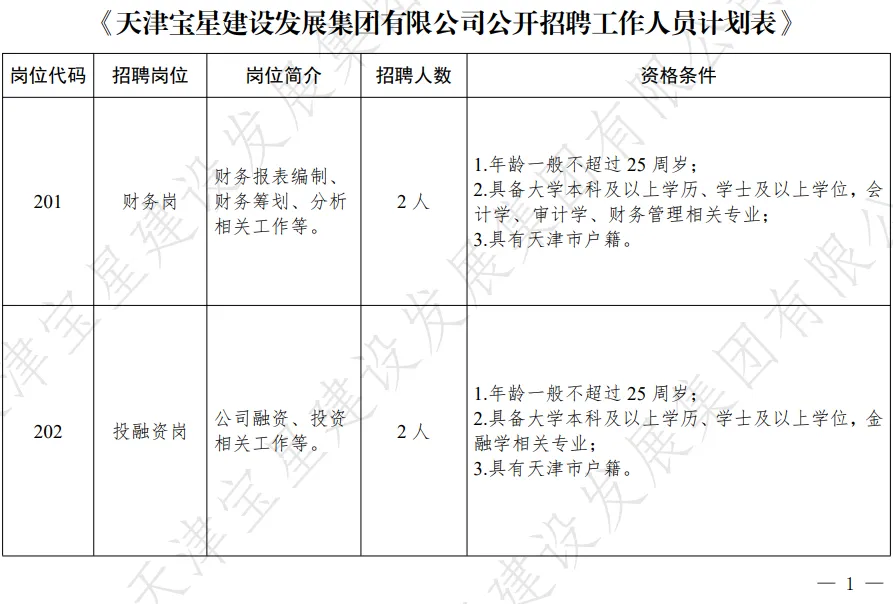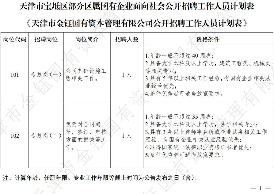 天津市金钰国有资本管理有限公司、天津宝星建设发展集团有限公司、天津地成建设投资有限公司、天津市泉州水务有限公司、天津市宝坻区粮食购销有限公司,各单位招聘岗位、人数及资格条件等详见下表↓