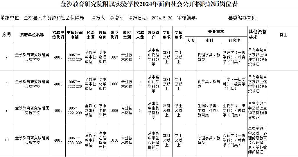 金沙教育研究院附属实验学校决定面向社会公开招聘10名高中教师。
