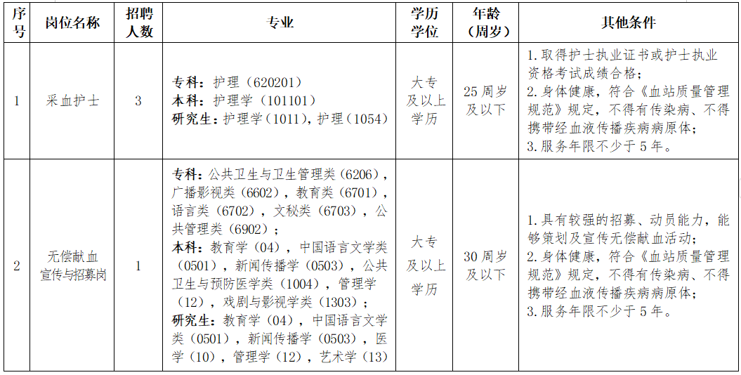根据工作需要,萍乡市中心血站面向社会公开招聘4名大专及以上学历编外工作人员,现有关招聘事项公告如下:
