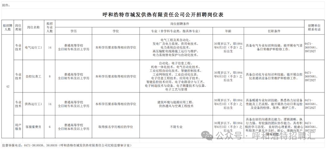 2.符合招聘岗位的年龄、学历、专业等任职要求,详见《呼和浩特市城发供热有限责任公司公开招聘岗位表》;