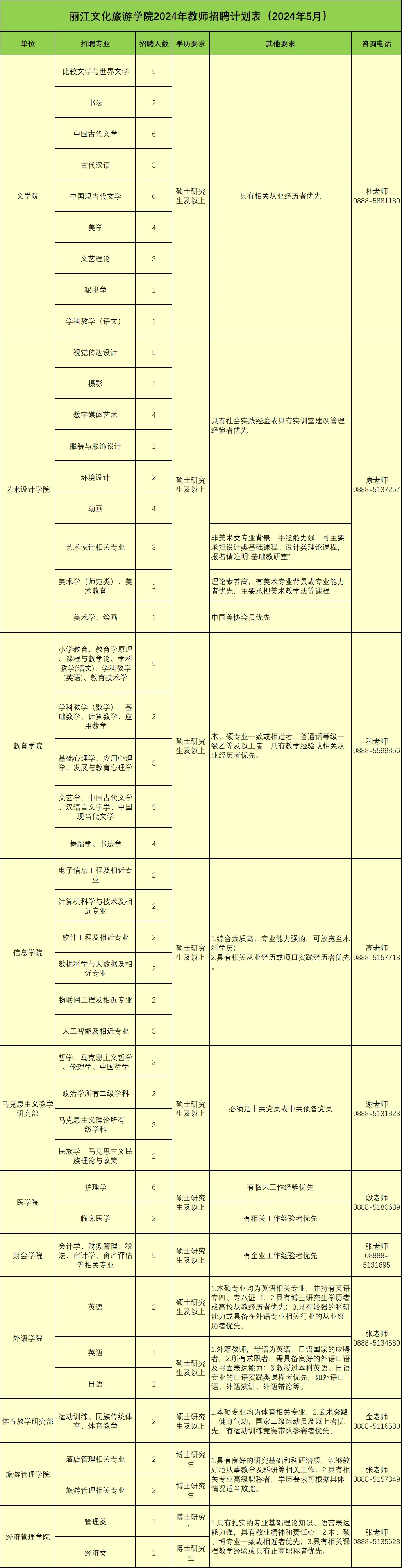 丽江文化旅游学院2024年教师招聘计划表(2024年5月)