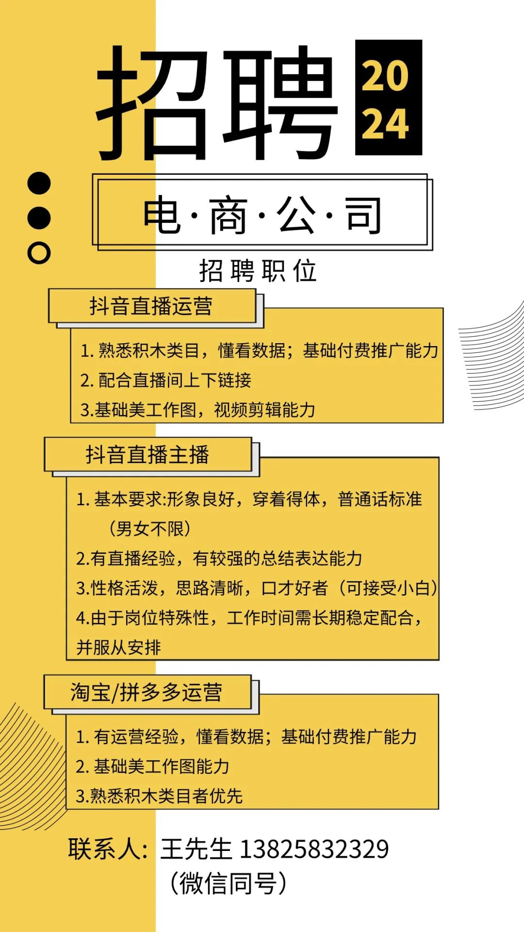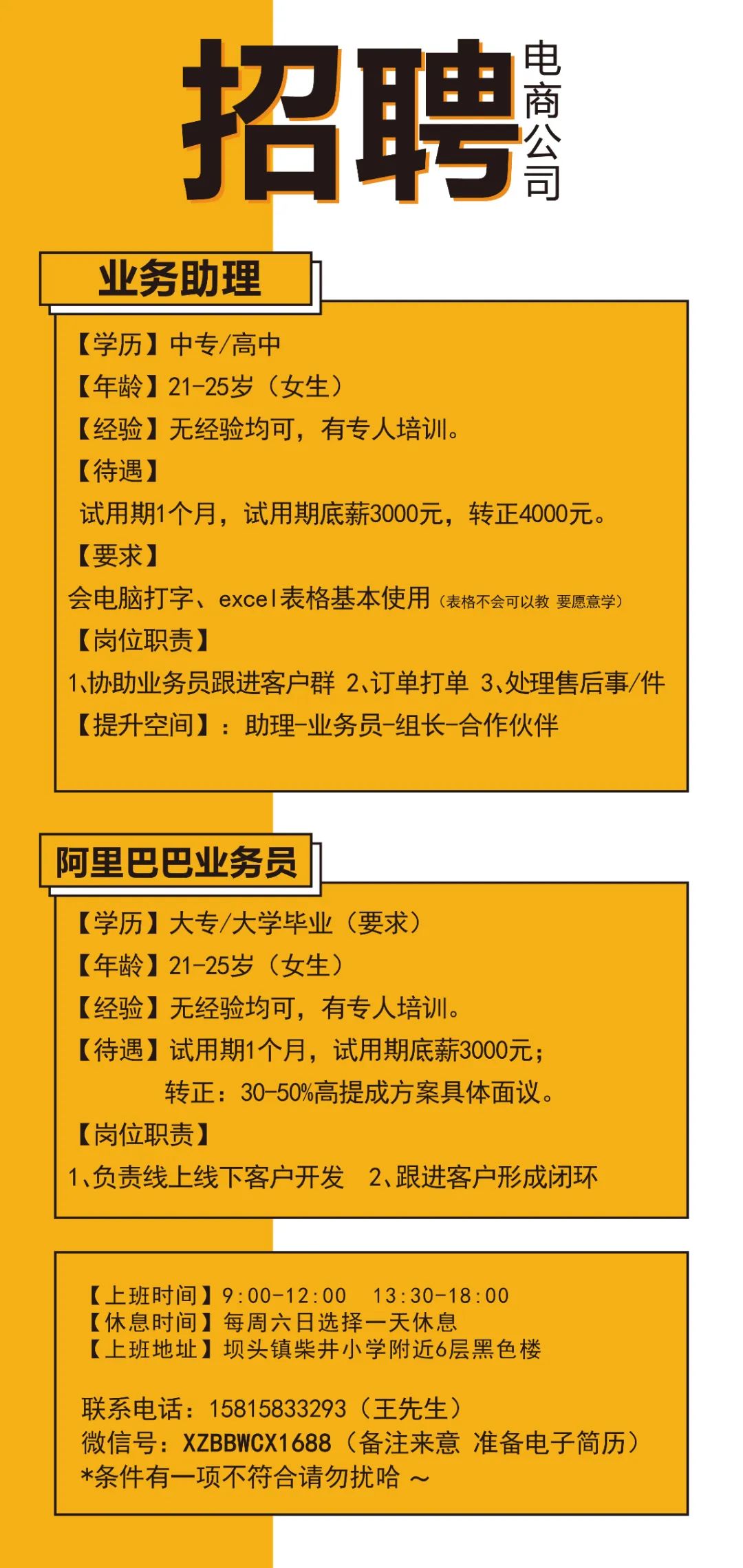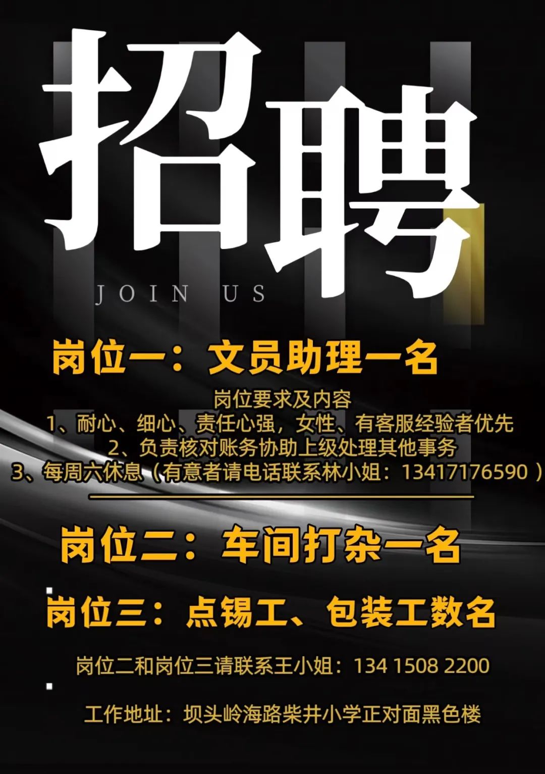 如果你有相关信息需要发布,请联系小编,扫描上方二维码即可添加小编微信。 所有信息仅在线30天! 本平台只做信息展示,请自辨真假 【岗位一】临时螺丝工 【岗位二】杂工1名 【岗位三】打螺丝工多名 【岗位四】包装工多名 【岗位五】点锡工多名 【联系电话】18023273412(微信同号) 【上班地址】坝头头份中心小学旁 电商公司(0530) 诚聘(0525) 【岗位】文员(2名) 【要求】有多年从事工作经验优先 【待遇】从优,有意面谈 【联系电话】13531279859、85517535。 【上班地址】坝头涂池新片区 置顶招聘 南港电商(0606) 【岗位】电商客服1-2名 【要求】有售前售后经验 接受轮班制,爱学习 有耐心 态度好 【工作时间】早上9点-下午6点,一周休息一天,节假日带薪放假 【待遇】薪资3000-5000 【联系电话】15815160001 【上班地点】坝头南港岭海路润基管桩附近 恒融酒店用品(0603) 【岗位一】送货司机2名 【工作内容】负责送餐饮酒店一次性用品 【上班时间】中午12.30 - 晚上9~10(先送完先下班) 【待遇】起步工资4000(面议)、补贴住700、补贴吃300,第二个月开始涨工资 【岗位二】业务员1名 【待遇】工资面议 【上班地址】澄海区凤翔街道文安路5巷2号 【联系电话】吴先生 13612361189 诚聘(0603) 巨森医疗器械经营部(0602) 【岗位】店员和储备店长多名 【要求】25-50 周 岁,坝头本地人、有责任心,有爱心,有耐心,有上进心,有执行力。 【任职要求】 1、形象大方,年龄 25 至 50 周岁 2、有爱心,有责任心,语言表达能力较佳 3、初中以上文化 【待遇】3000-5000 不等,员工福利待遇好 【上班时间】早上8点-下午4点。有单休及节假日 【联系电话】王小姐 13556357883 【上班地址】头份三围 超市(0602) 【岗位】收银员2名(女),坝头人有工作经验者优先考虑。 【要求】为人诚实,有责任心,服从安排熟悉电脑的基本操作。 【上班时间】早班:上午7点30至下午3点半、午班:中午2点到晚上10点半、晚班:下午4点到晚上12点(三班轮班制度) 【工作内容】核对超市库存,核对每日收支表,销售收银等 【待遇】薪资3800-4000左右(具体面谈),月休2天,包吃 【上班地址】莱芜岭海中小微企业创业园联系电话 【联系电话】13531297439 柴井电商(0531) 【岗位】电商客服 【要求】有售前售后经验 【待遇】从优,有意面谈 【联系电话】13433398915。微信Z-MU-X 【上班地址】坝头柴井 旭昇玩具厂(0531) 【岗位】文员 有经验优先 【待遇】薪资4k-5k 【工作时间】8.30-12.1:30-6.00 月休两天 【工作要求】熟悉办公软件.对数据敏感 有做过印刷厂纸箱厂或有类似的工作经验优先 【工作内容】负责车间数据录入及对账. 【联系电话】 王小姐18125162782 灿星玩具厂(0530) 【岗位一】跟单文员2名,釆购文员2名, 【要求】女,熟悉各种办公软件,工作负责,认真、必须有经验 【待遇】工资5000元左右,月休4天。办公环境优越 【联系电话】13902732100(微信同号)加微信发简历 【岗位二】车间生产主管2名 【要求】男女不限,需有二年以上工作经验,熟悉遥控玩具优先 【待遇】提供食宿,工作环境优越,工资面议 【联系电话】13902732100(微信同号)加微信发简历 【上班地址】坝头领海路头份路边 头份玩具厂(0530) 【岗位一】包装工多名55 -65元 【岗位二】电动产品维修工2名 【岗位三】打杂工多名68-75元 【联系电话】黄小姐13536803012 【上班地址】头份领海路中段 诚聘(0529) 【岗位一】包装工人(多名) 【岗位二】暑假工(多名) 【要求】有工作经验者优先 【待遇】工资待遇面议,望有意者或身边亲朋好友需要的介绍。 【联系电话】王先生 13411955899(微信同号) 【上班地址】坝头头份三围 天龧投影胶片(0528) 【岗位】(女生)平面设计一名 【要求】有设计基础就可以 【待遇】从优,有意面谈 【联系电话】13556366389 【上班地址】坝头涂池社区后 涂池电商(0528) 【岗位】电商客服 【待遇】薪资3-6K 【要求】(女)打字速度60字/分钟以上耐心细致的妥处理售前售中的各类问题 【联系电话】13502930304(微信同号) 【上班地址】坝头涂池新片区 涂池电商(0528) 【岗位一】招多名电商打包 【岗位要求】负责打箱,商品配货、装货等工作。18-35周岁,吃苦耐劳 【待遇】基本工资4000-5000包晚餐+全勤奖 【岗位二】运营助理 做过淘宝拼多多阿里优先,会上架产品,客服等 【待遇】基本工资3500-5000+全勤奖 【上班地址】坝头涂池新片区 【联系电话】13729255442(微信同号) 【岗位三】招多名快递司机 【岗位要求】主要单排或四米二货车下午4点上班。手脚利索头脑灵活,出完货就下班 【待遇】基本工资5000-6000+全勤奖 【上班地址】坝头涂池新片区 【联系电话】13682899521(微信同号) 凡盛达玩具(0509) 【岗位一】玩具厂办公室文员 【要求】20-45岁,熟悉电脑基本办公操作、接电话、录单、开单、跟单必须有工作经验 【待遇】薪资面谈 【工作时间】8-12.1:30-6点 月休4天 【岗位二】 装配工多名,打螺丝,包装 【要求】年龄18-50周岁,工班记件都有 【上班地址】坝头涂池新片区(导航FSD玩具厂) 【联系电话】 王先生 13433323223 (微信同步) 汕头市英皇玩具实业有限公司(0527) 【岗位一】玩具装配工,包装工多名 【上班时间】8:30-11:30,13:00-18:00 【工作内容】负责玩具装配及包装等工作 【人员要求】 1、小学以上文凭:年龄35-48岁(只招女工) 2、必须有耐心,责任心,服从工作安排,有经验优先 3、需要会