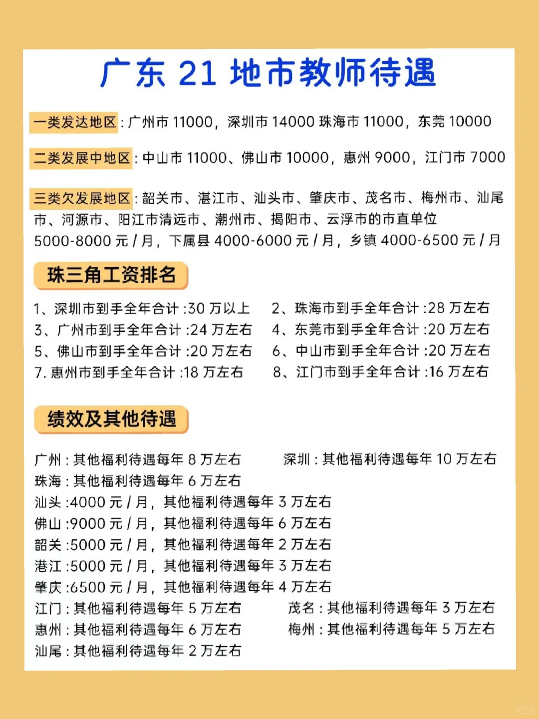 | 广东21地市各地区待遇!原来这么高! 广东 21 地市教师待遇\n💥一类发达地区:\n广州市11000,深圳市14000珠海市11000,东莞10000\n💥二类发展中地区:\n中山市11000、佛山市10000,惠州9000,江门市7000\n💥三类欠发展地区:\n韶关市、湛江市、汕头市、肇庆市、茂名市、梅州市、汕尾市、河源市、阳江市清远市、潮州市、揭阳市、云浮市的市直单位5000-8000元/月,下属县4000-6000元/月,乡镇4000-6500元/月\n珠三角工资排名:\n1、深圳市到手全年合计:30万以上\n2、珠海市到手全年合计:28万左右\n3、广州市到手全年合计:24万左右\n4、东莞市到手全年合计:20万左右\n5、佛山市到手全年合计:20万左右\n6、中山市到手全年合计:20万左右\n7、惠州市到手全年合计:18万左右\n8、江门市到手全年合计:16万左右\n🎀绩效及其他待遇\n广州:其他福利待遇每年8万左右\n深圳:其他福利待遇每年10万左右\n珠海:其他福利待遇每年6万左右\n汕头:4000元/月,其他福利待遇每年3万左右\n佛山:9000元/月,其他福利待遇每年6万左右\n韶关:5000元/月,其他福利待遇每年2万左右\n湛江:5000元/月,其他福利待遇每年3万左右\n肇庆:6500元/月,其他福利待遇每年4万左右\n江门:其他福利待遇每年5万左右\n茂名:其他福利待遇每年3万左右\n惠州:其他福利待遇每年6万左右\n梅州:其他福利待遇每年5万左右\n汕尾:其他福利待遇每年2万左右\n大体就是这样!你现在待遇怎么样呢?来交流一下吧\n#广东教师编制 #广东教师待遇 #广东教师工资待遇 #广州教师编 #东莞教师编 #深圳教师编#珠海教师编 #佛山教师编 #中山教师编 #惠州教师编 |