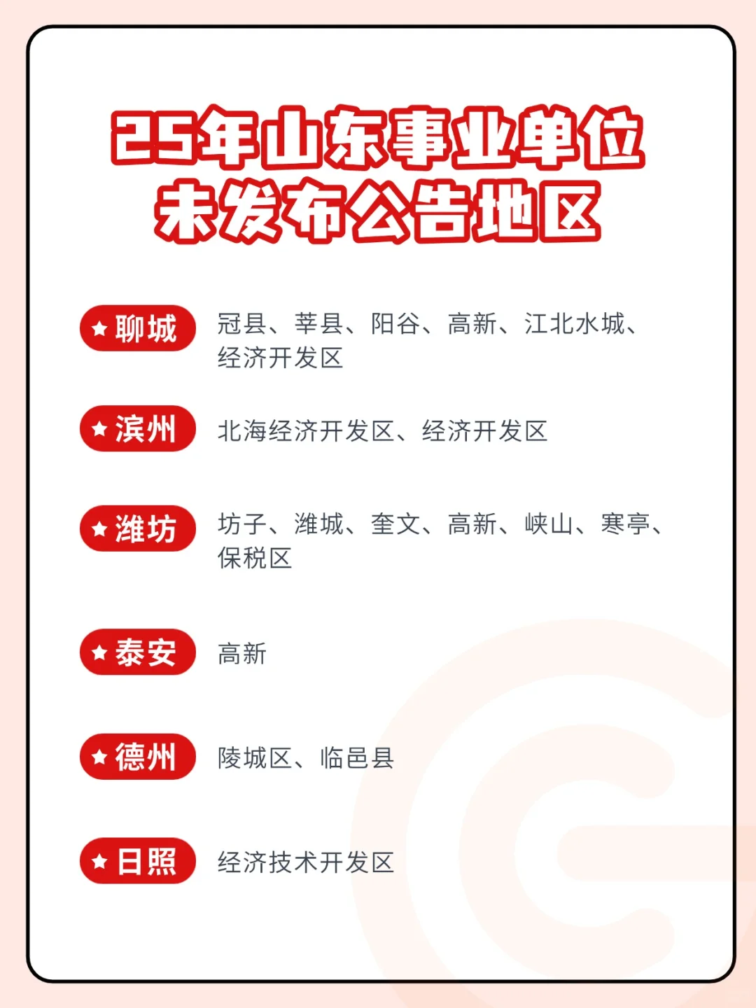 | 25年山东未参加统考的地区👉 25年山东16地市全部县区事业单位统考综合类岗位全部发布!\n去年单招的地市今年全部参加统考且普遍扩招!\n但去年参加统考的地市今年明显缩招!\n \n📍截止目前没有发布公告岗位的地区有:\n【聊城】:冠县、莘县、阳谷、高新、江北水城、经济开发区\n【滨州】:北海经济开发区、经济开发区\n【潍坊】:坊子、潍城、奎文、高新、峡山、寒亭、保税区\n【泰安】:高新\n【德州】:陵城区、临邑县\n【日照】:经济技术开发区\n \n统考结束后这些地区应该还会自行组织考试\n \n大家一定要抓住机会上岸\n \n#山东事业编 #事业编 #山东事业单位考试 #超格 #25山东事业单位考试 #事业编考试 #25年山东事业编统考 |